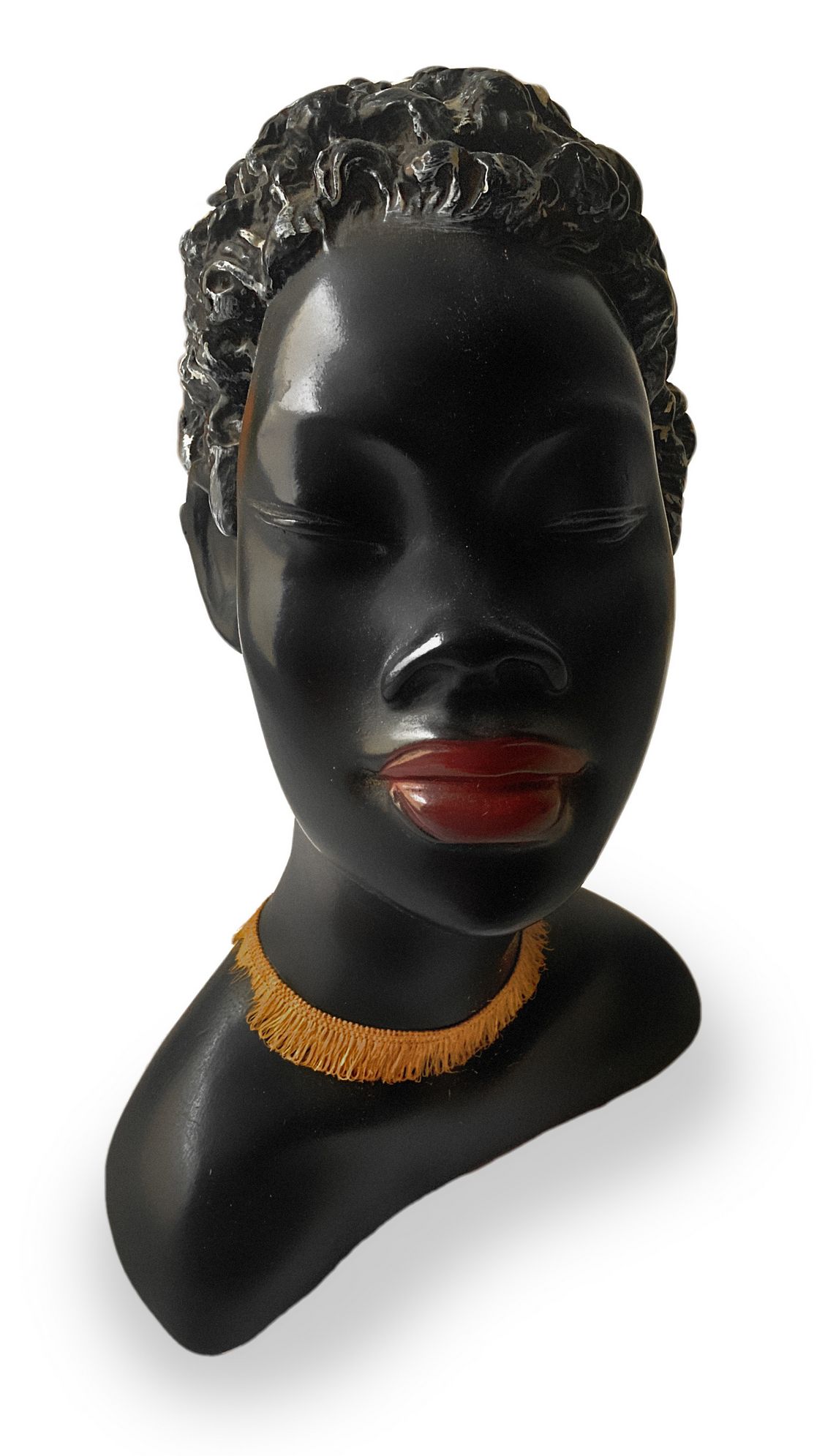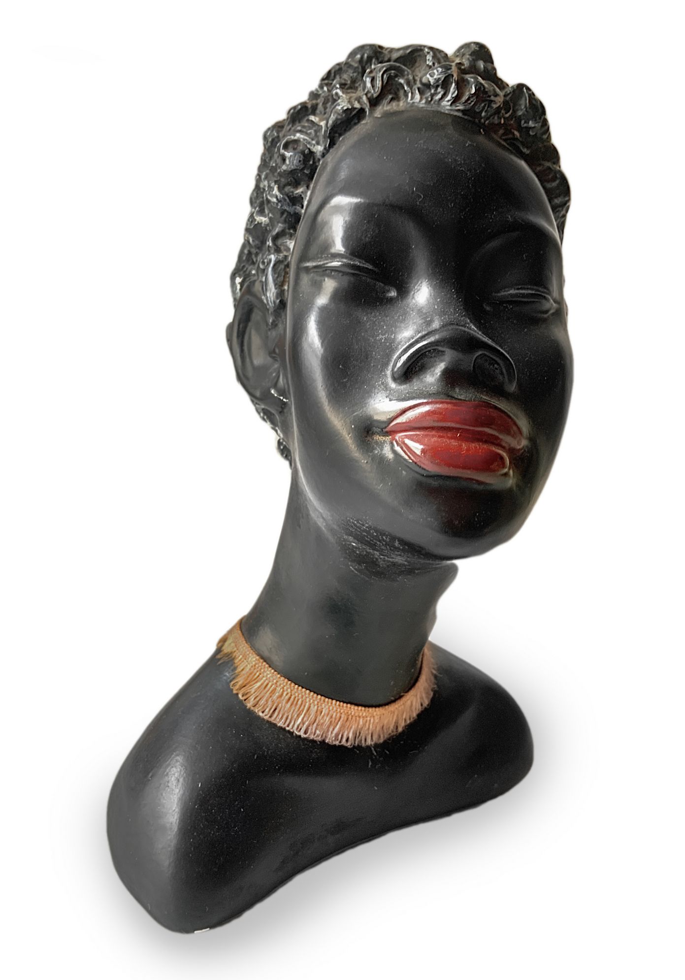 Mezzo busto in gesso patinato nero raffigurante abissinia, produzione austriaca. Segni di uso minime mancanze. Anni 40. Cm 30 x 19.