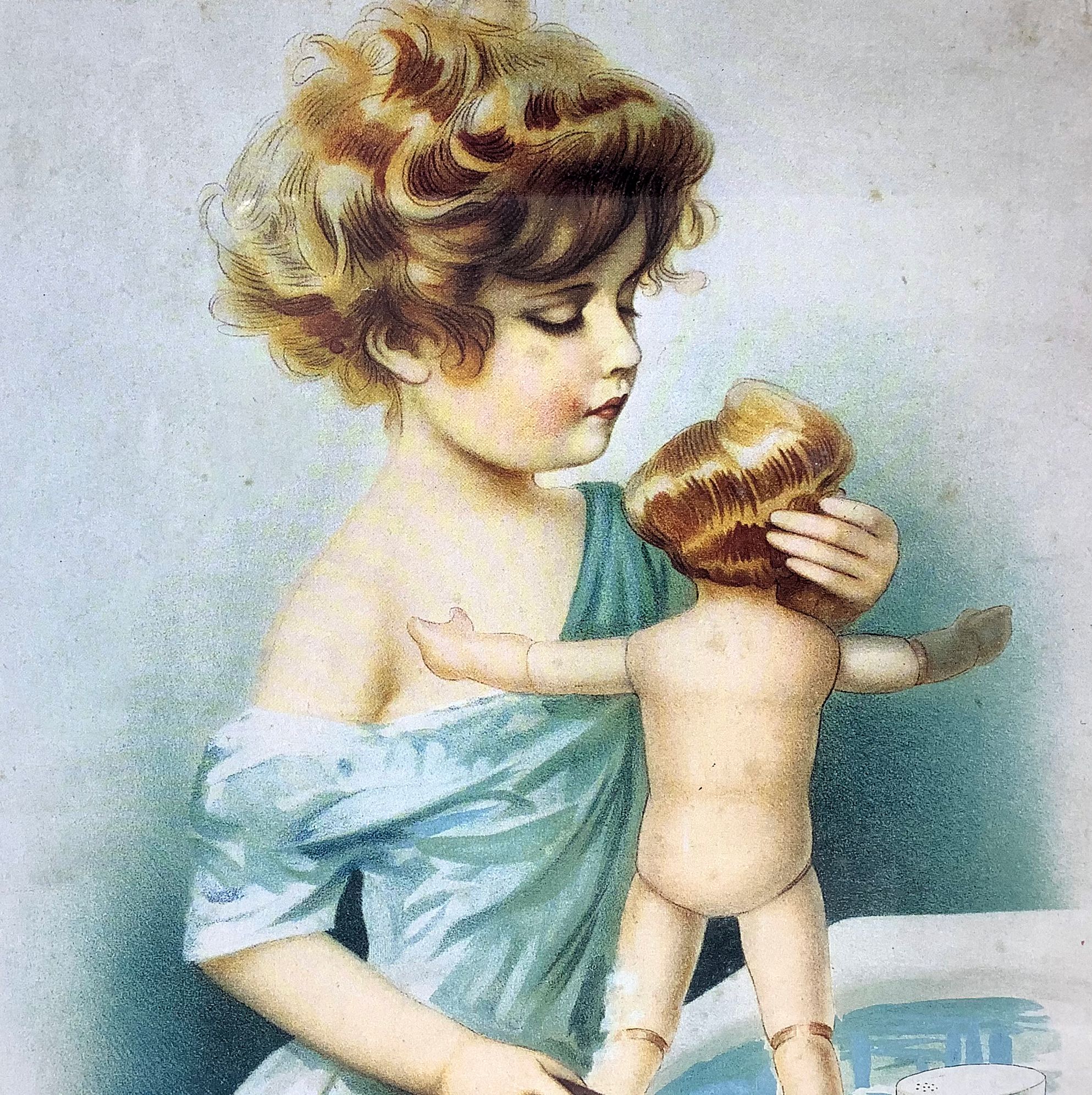 Stampa pubblicitaria della Roberts, raffigurante bambina con bambola, disegno...