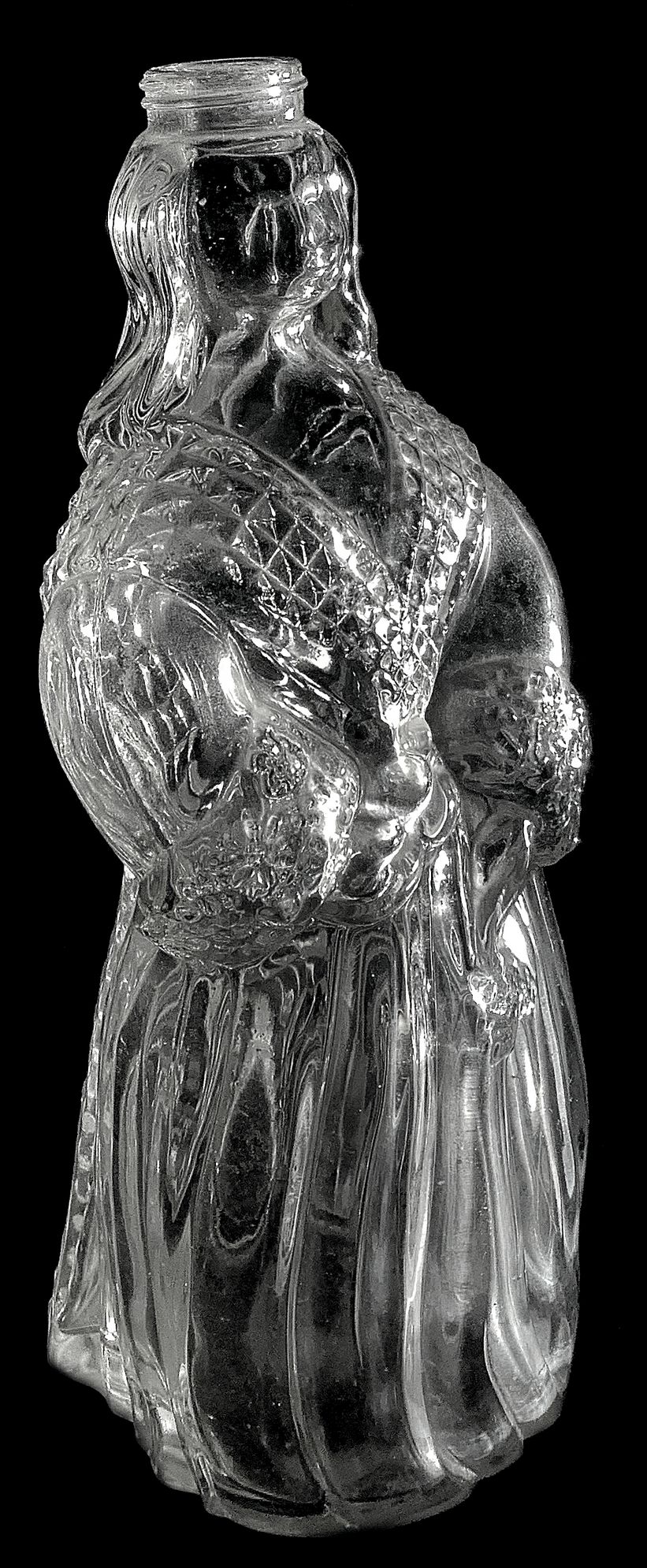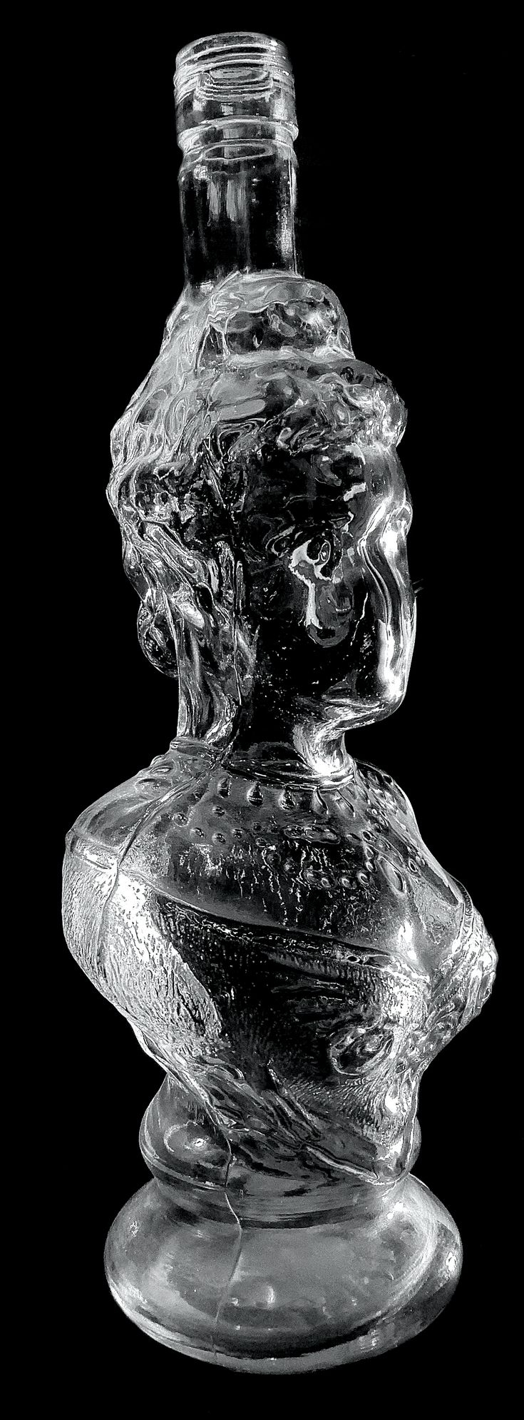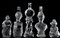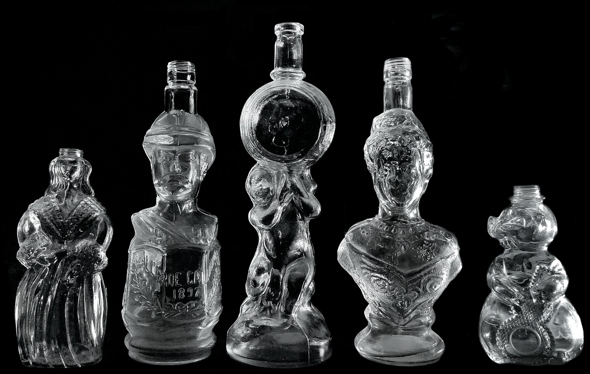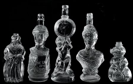 Gruppo di n. 5 bottiglie in vetro e cristallo, XX secolo. Vari formati e forme. Tappi adattati.