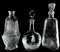 Gruppo di n. 3 bottiglie in vetro e cristallo, XX secolo. Vari formati e forme. Tappi adattati.