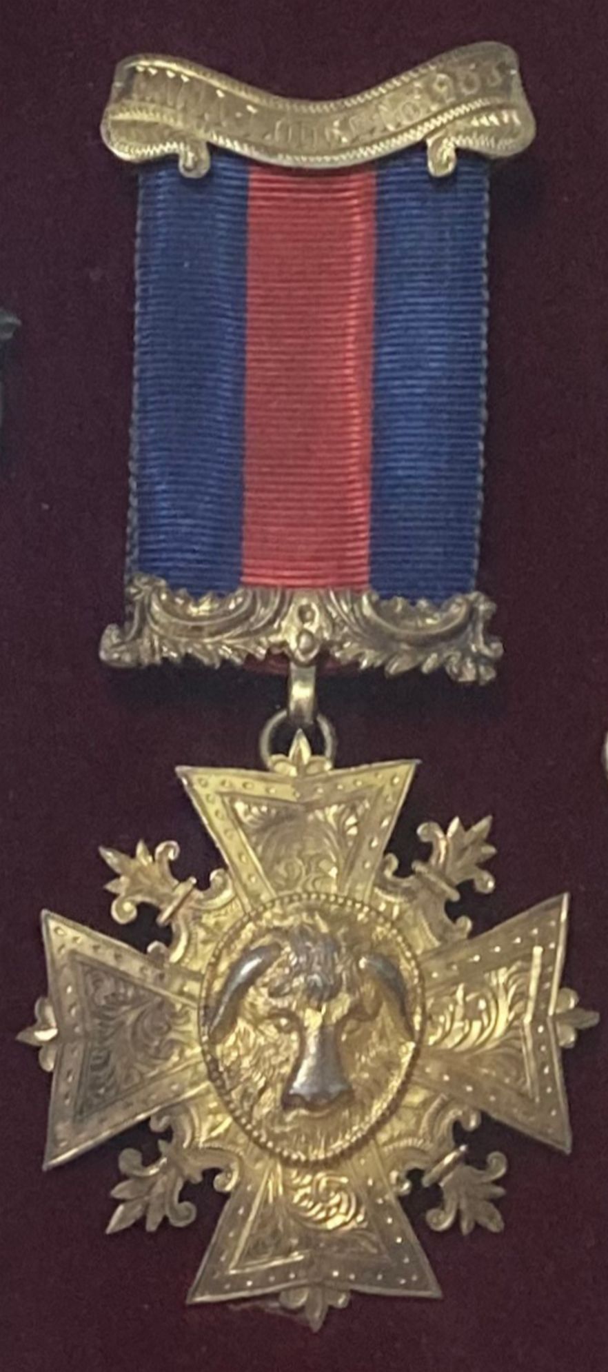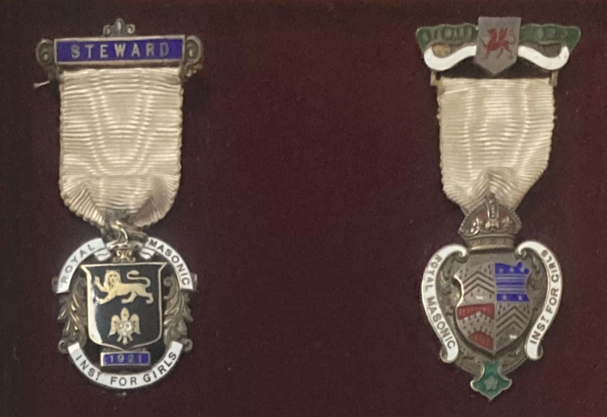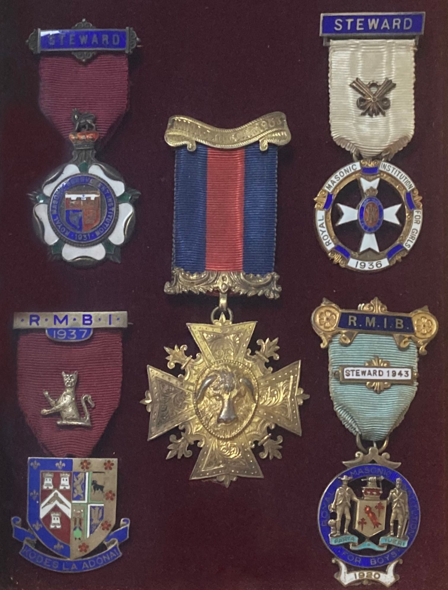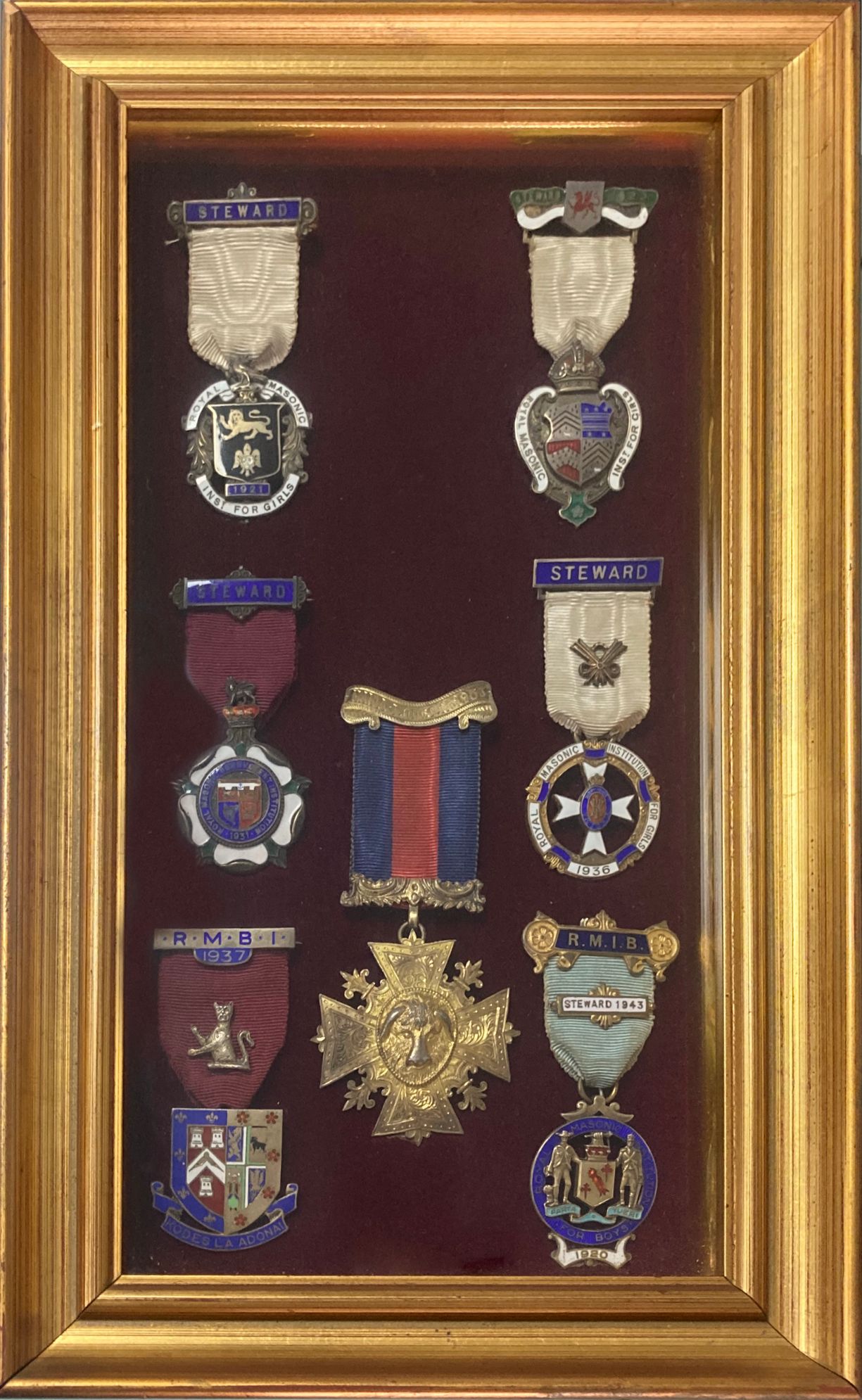 Bacheca con n.7 medaglie - onoreficenze Massoniche, inizi XX secolo. (Steward, 1921, 1922,1931,1936,1937,1943-Maida Lodge n 1983) Cm 35x20.