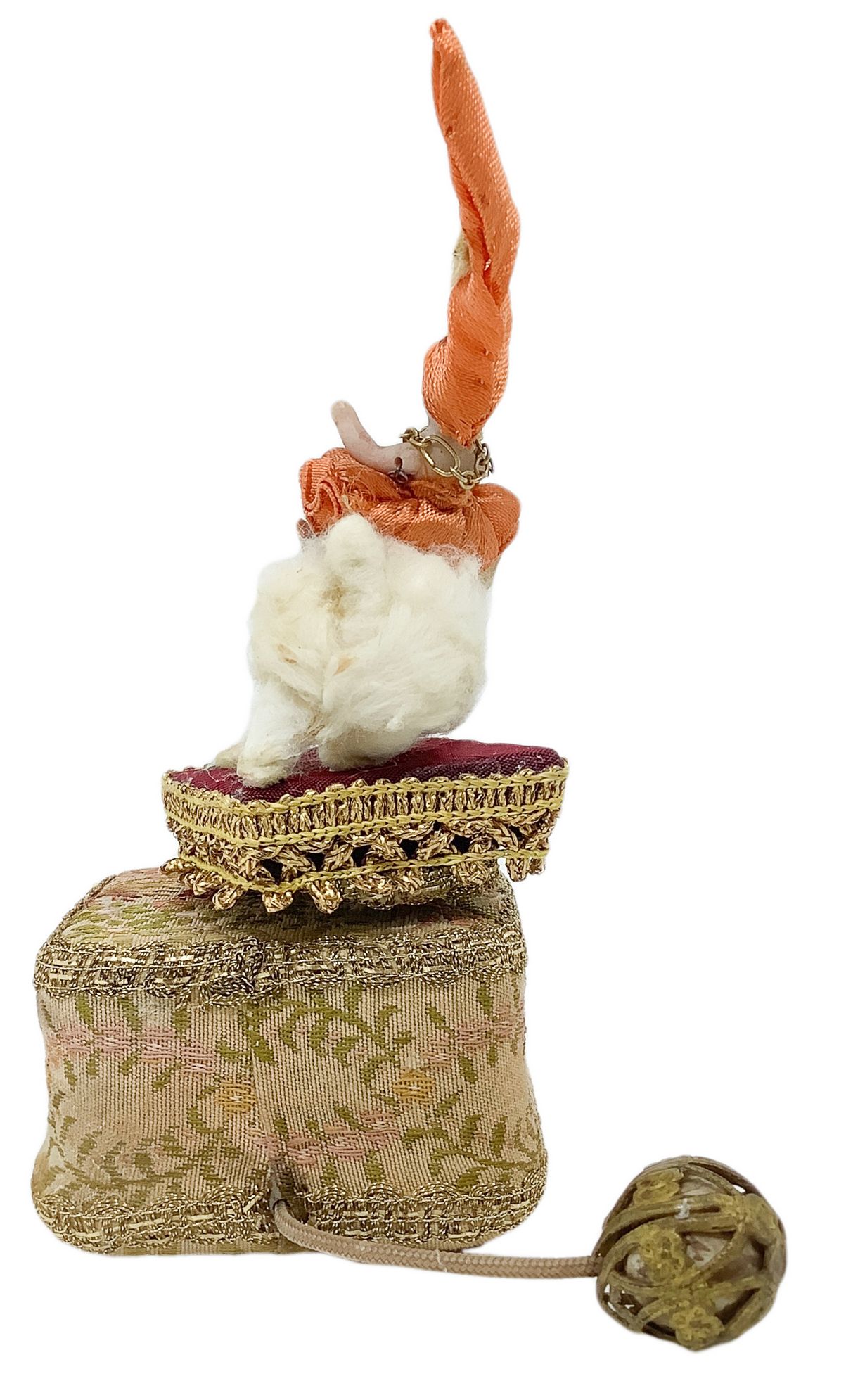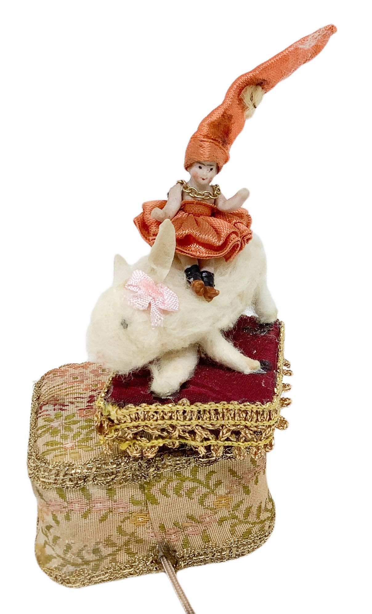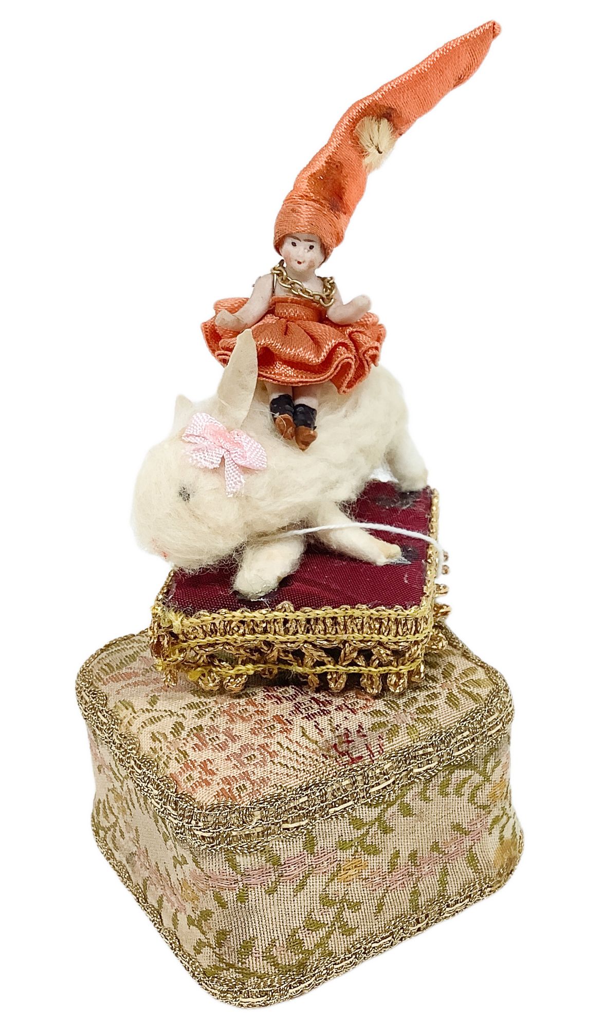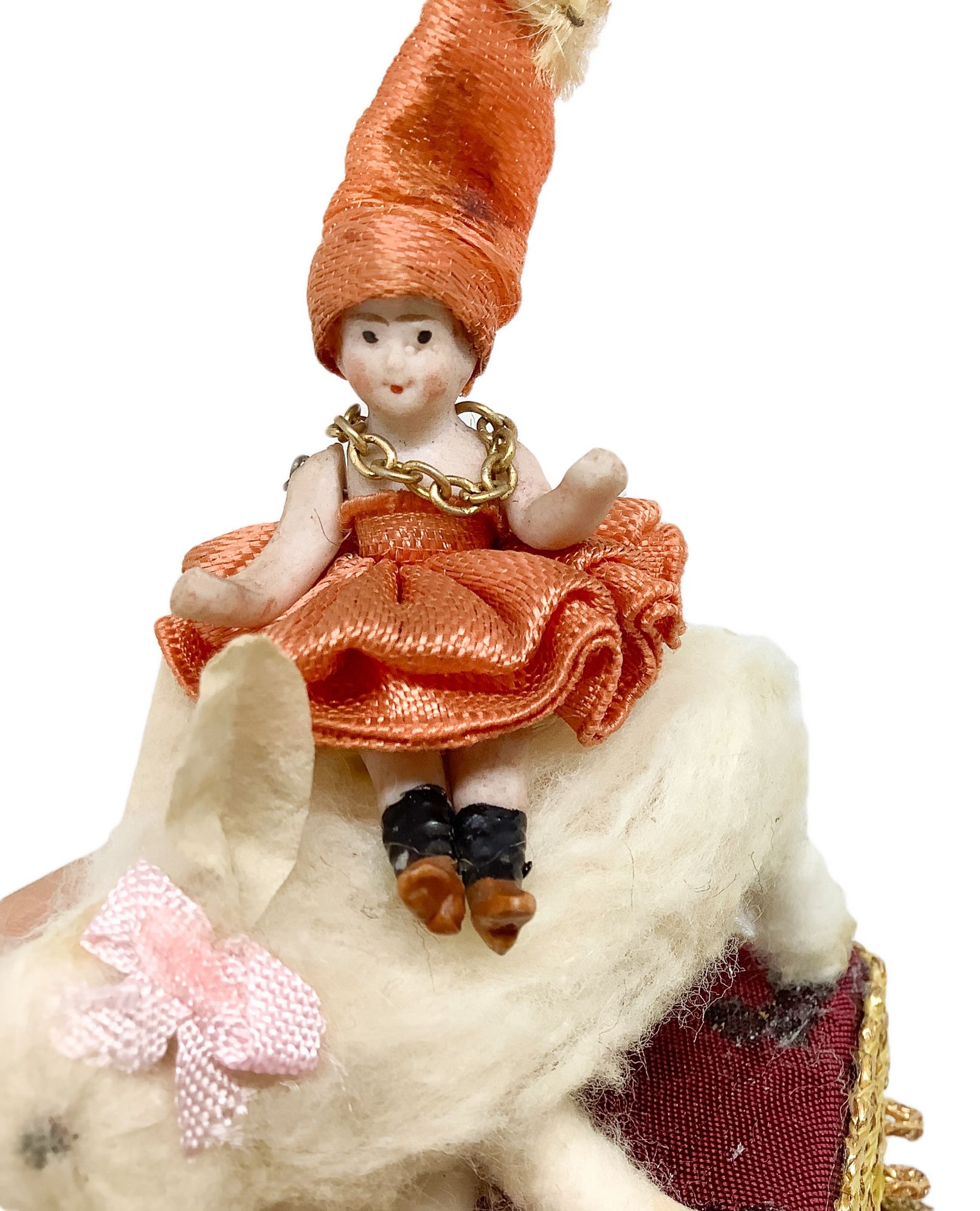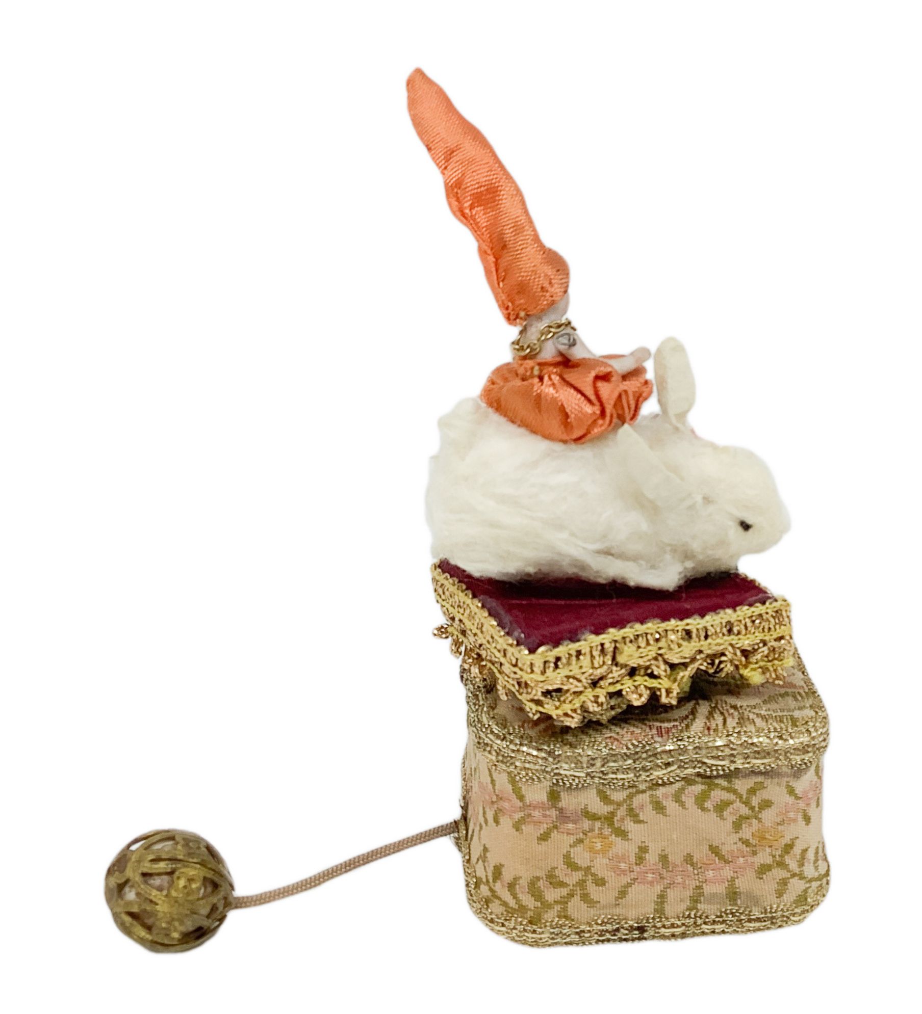 Carillon con Mignonette in biscuit con coniglio, 1900 ca., Francia. H cm 15 (con cappello), carillon funzionante