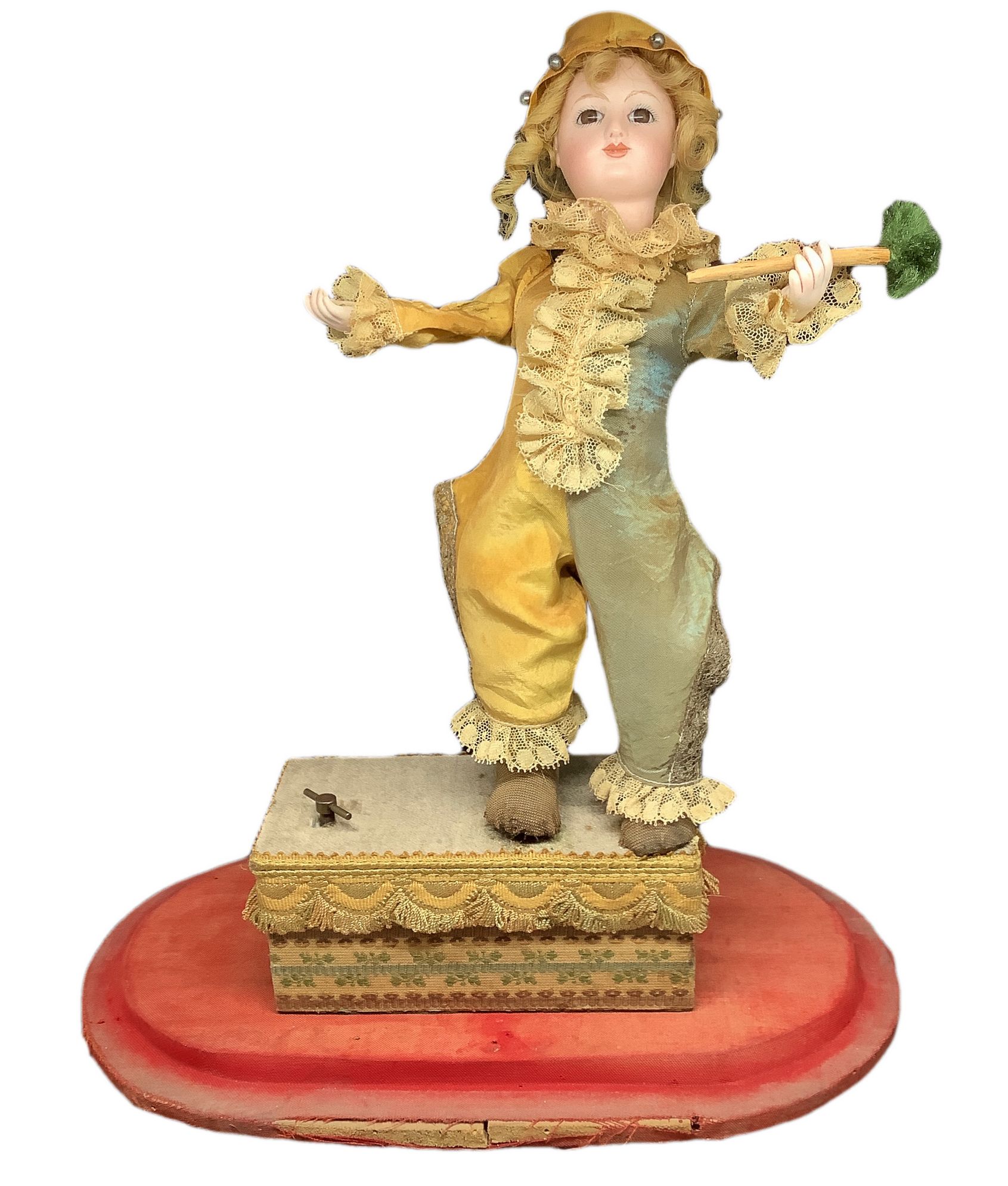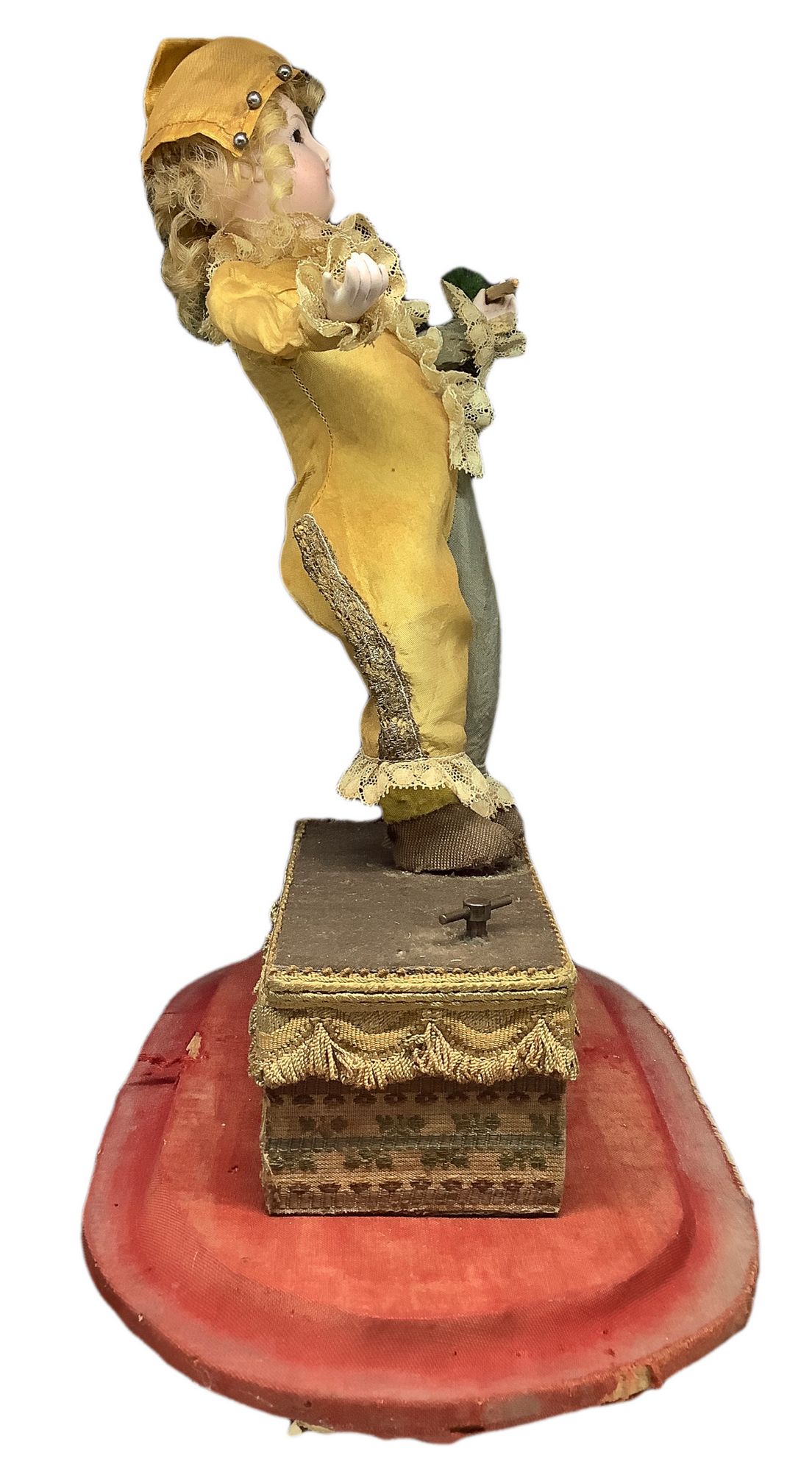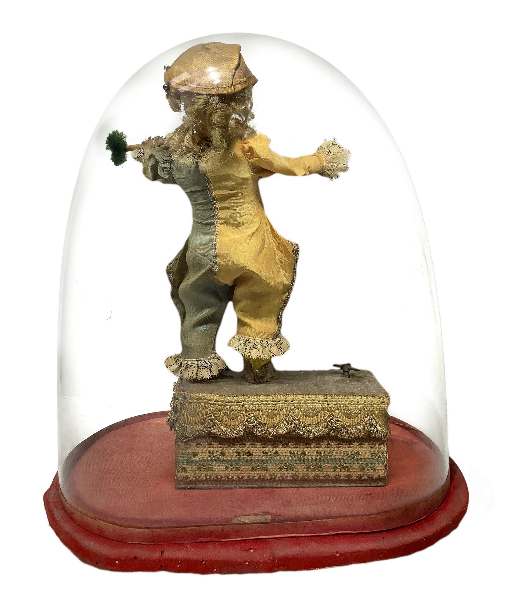 Carillon antico raffigurante clown, in teca di vetro. XX secolo. H cm 26, con teca h cm 36. Funzionante .