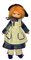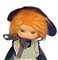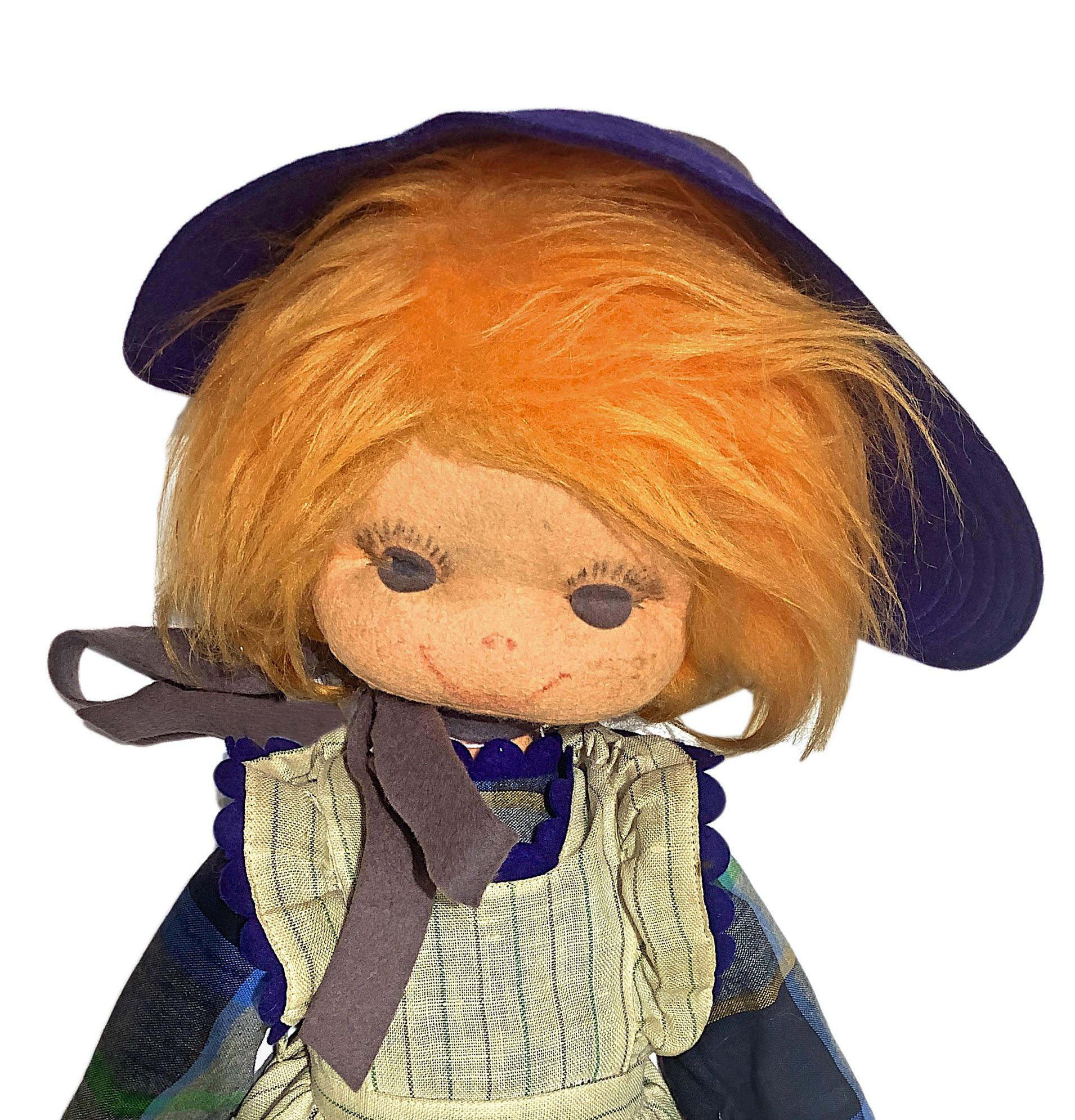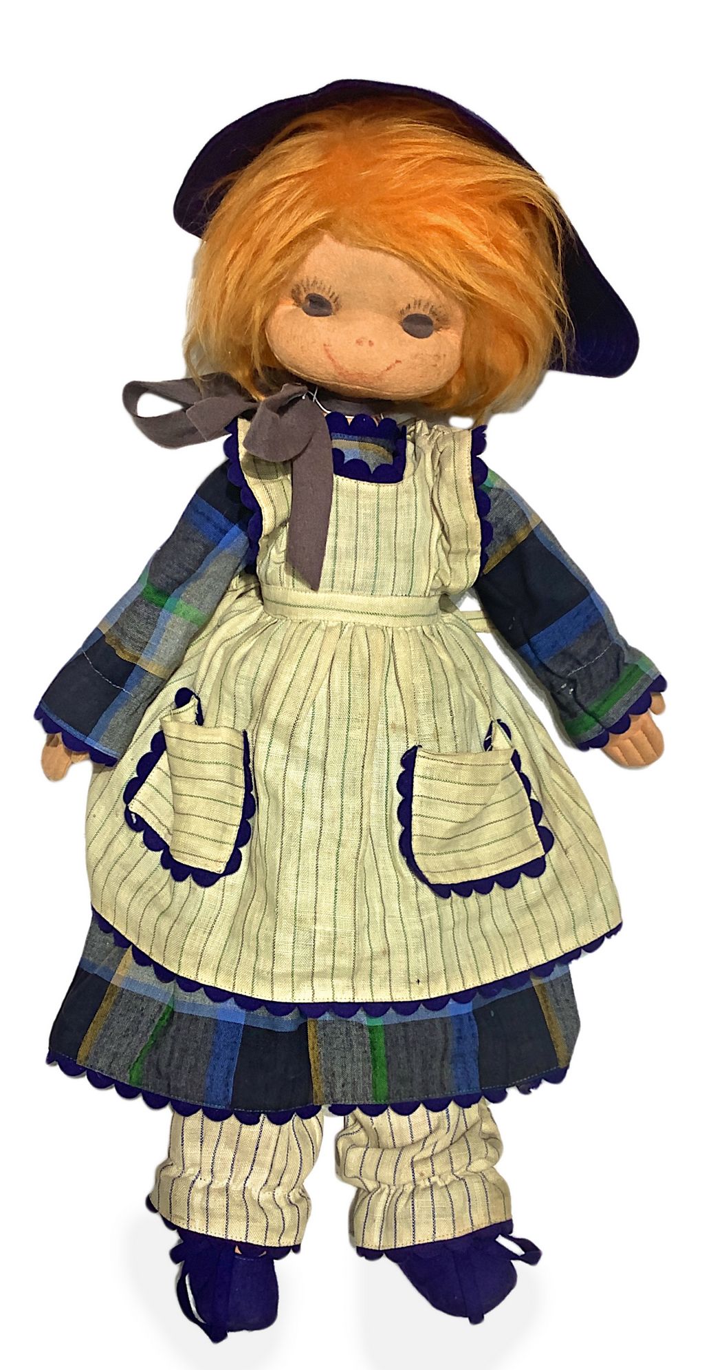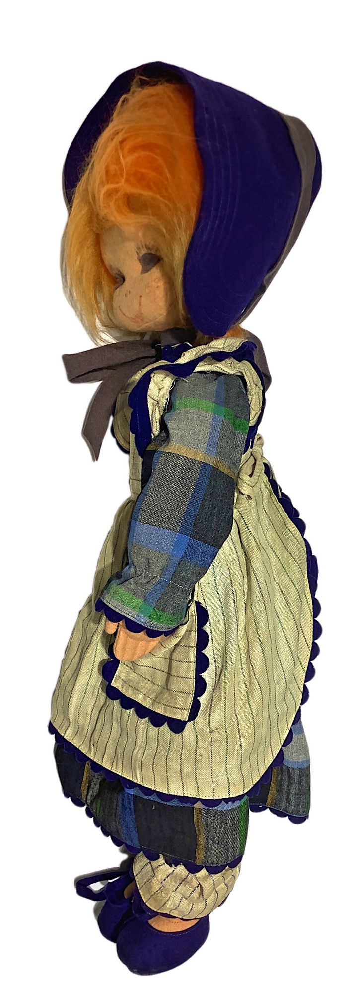 Bambola Lenci, Torino, Italia, 1990 c.ca. Fatta a mano con pantalone e abito bianco con righe blu, abito sottostante a quadrettoni, capelli rossi mohair, occhi dipinti, firma Lenci. H cm 60
