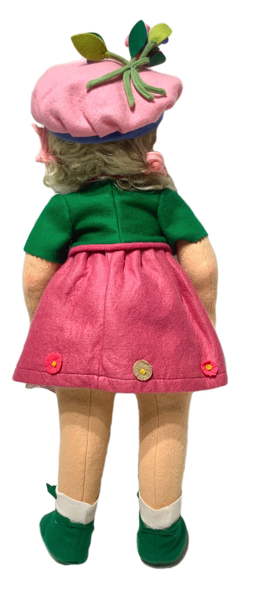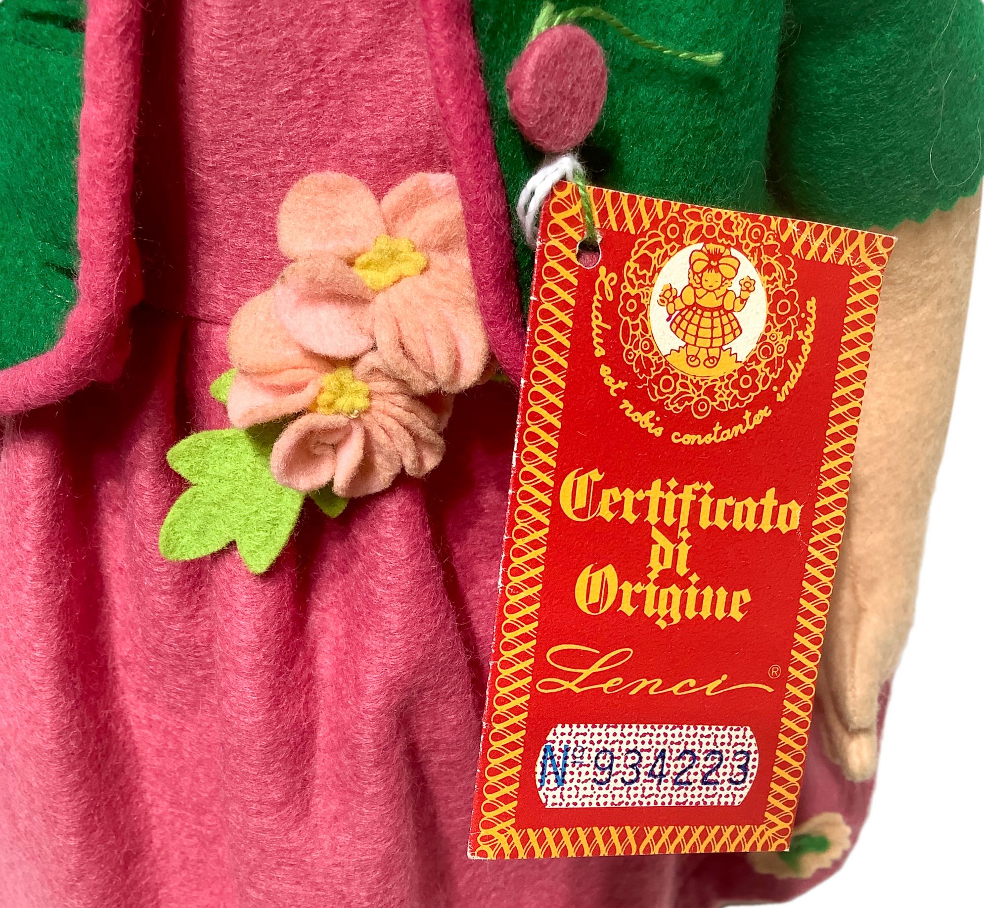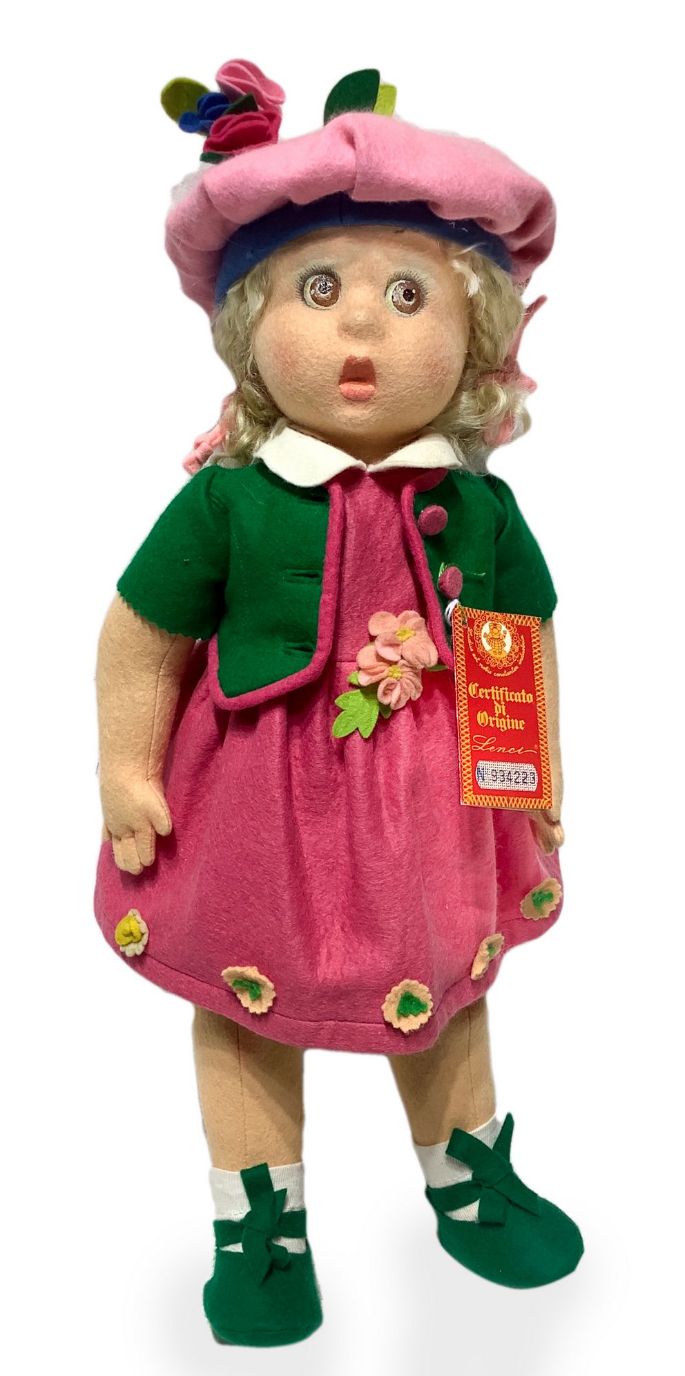 Bambola Lenci, Torino, Italia, 1978-80 c.ca. Fatta a mano con abito e cappellino rosa con fiorellini e giacchino verde, capelli mohair, occhi dipinti, arti rigidi. H cm 50