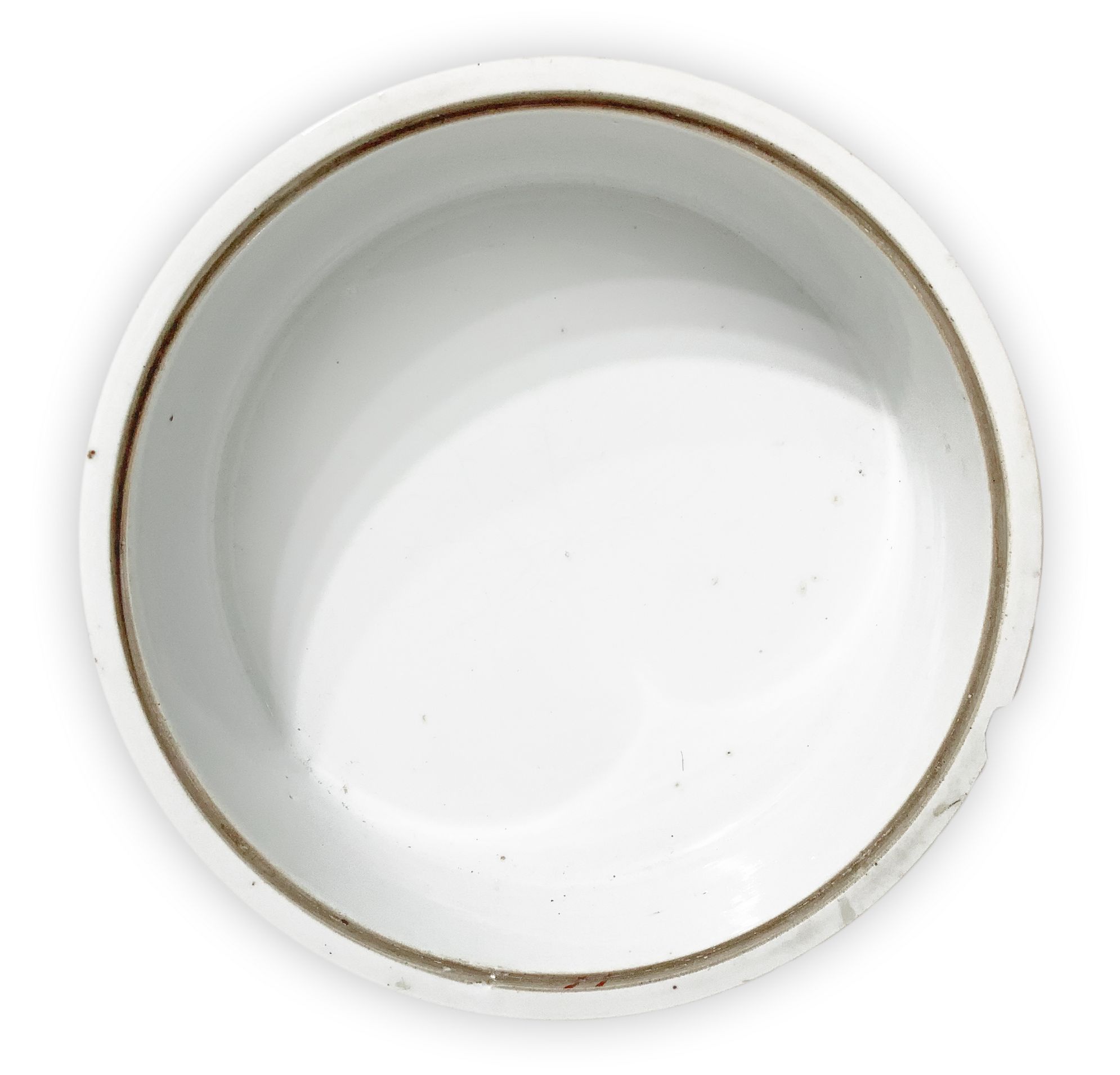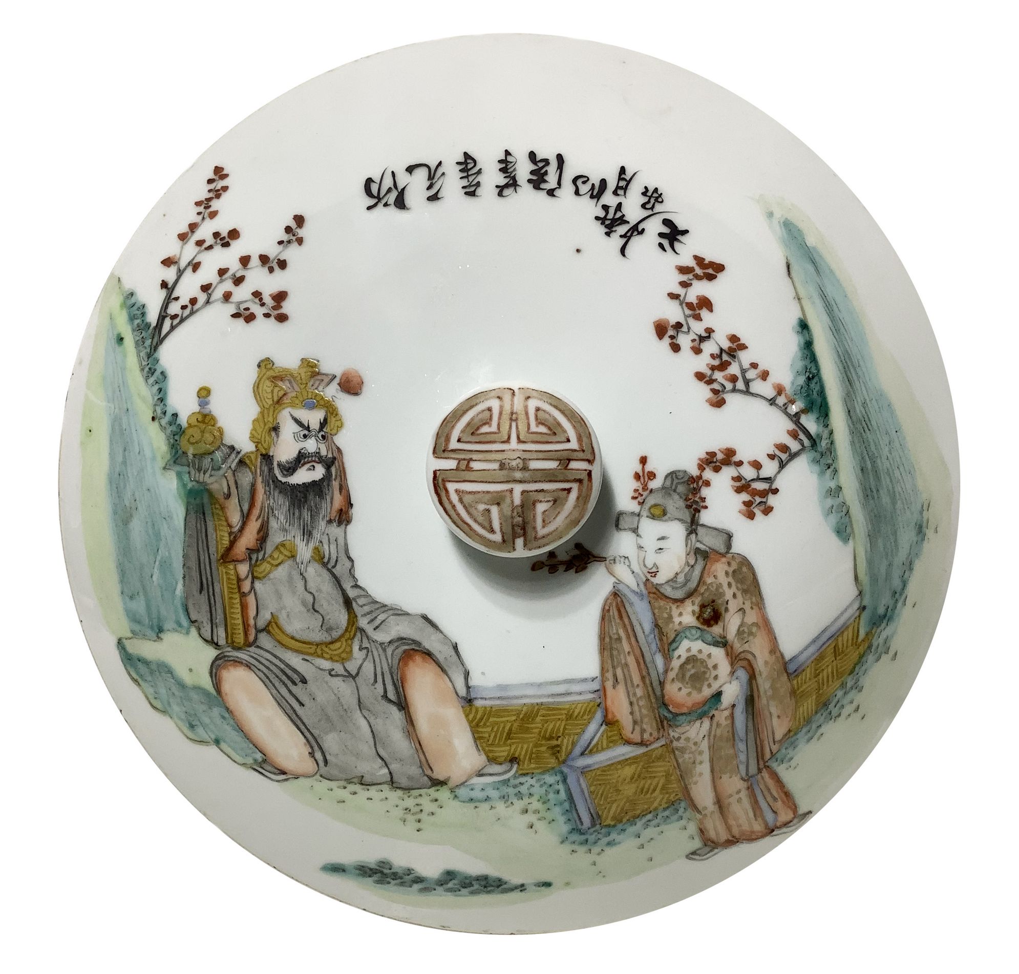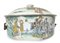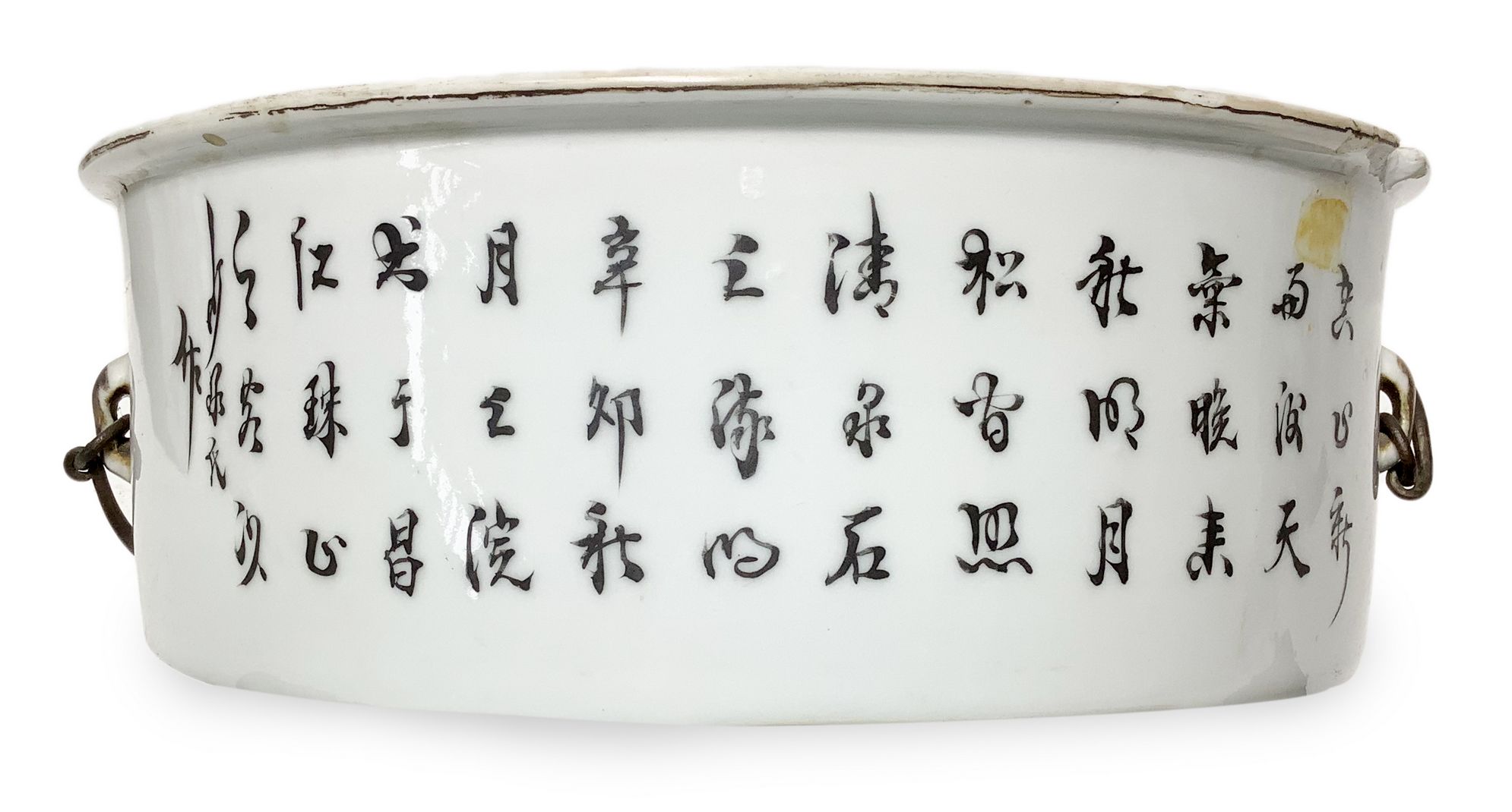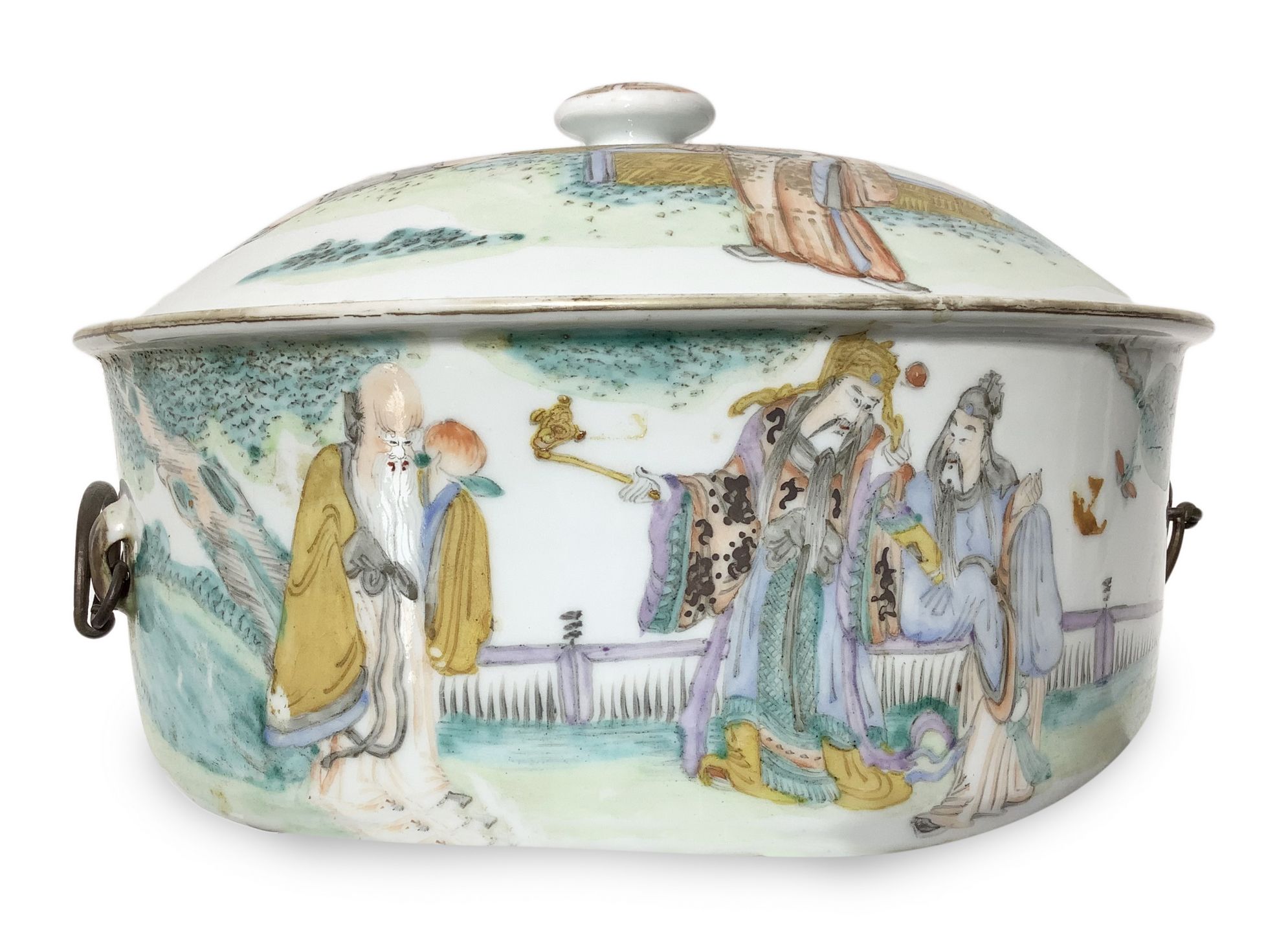 Zuppiera in ceramica con manici in metallo, Cina, inizi XX secolo. Raffigurante scene di genere e scritte in lingua cinese. Diametro cm 28. H cm 17. Sbeccature ai bordi.