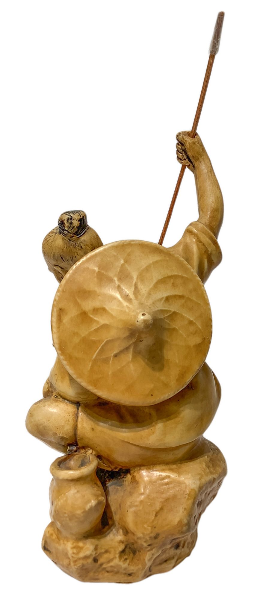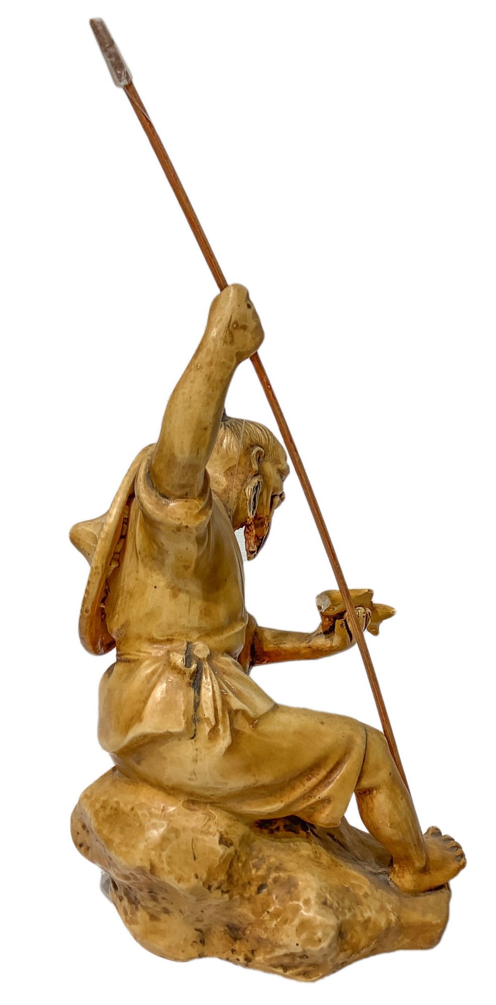 Statuetta cinese raffigurante pescatore con pesce all’amo. XIX secolo. H cm 21. Piccola incollatura.