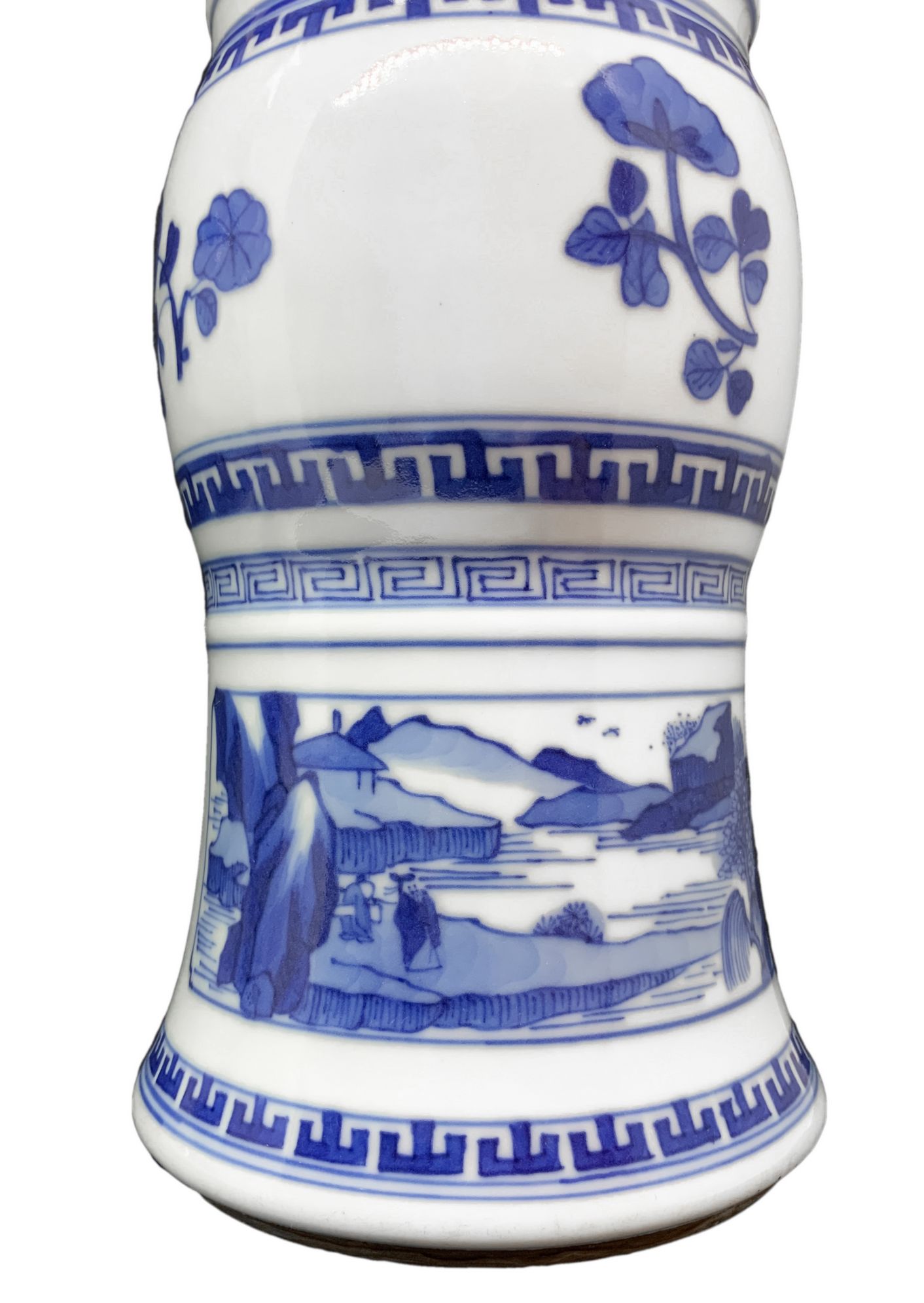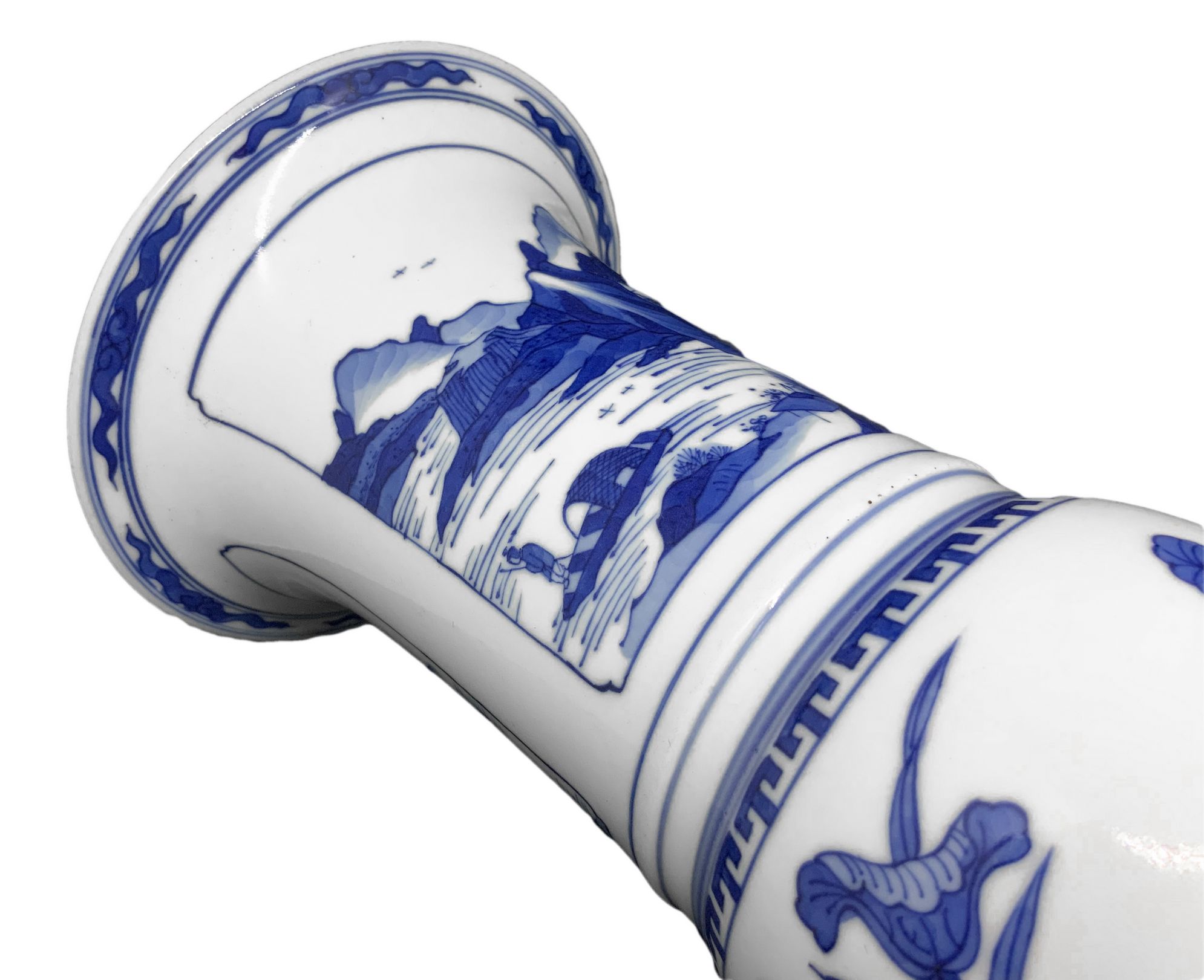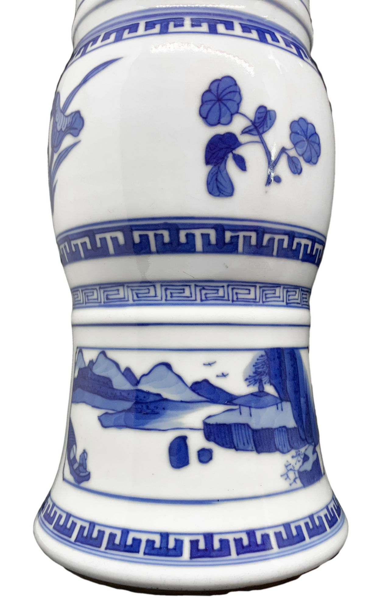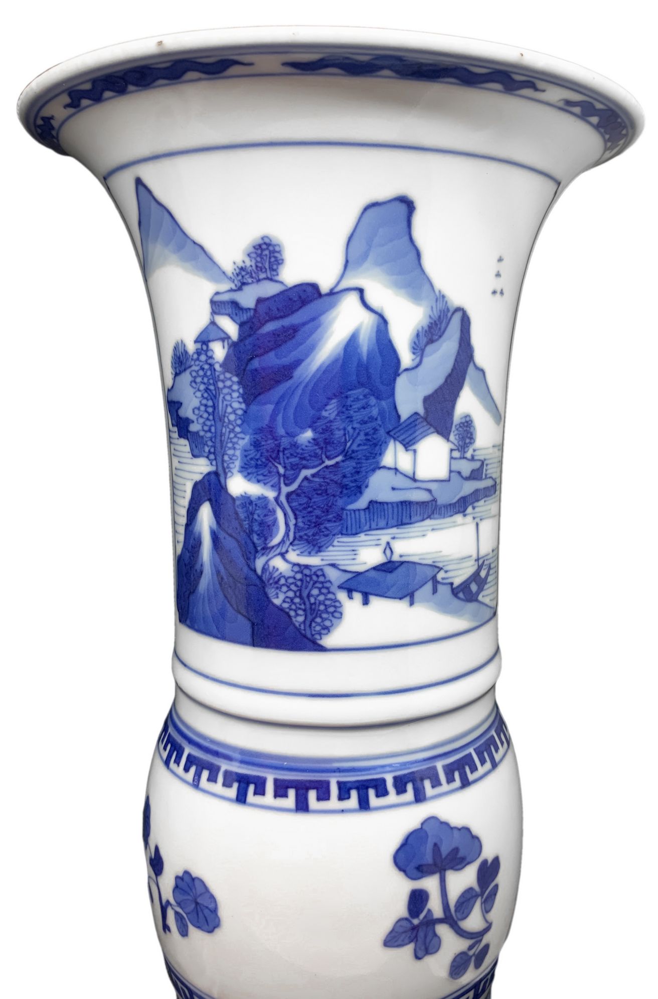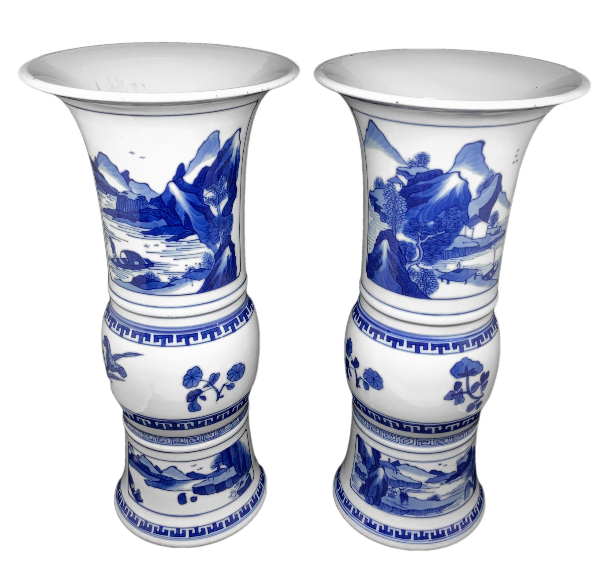 Coppia di vasi a tromba in ceramica cinese bianca blu “Gu” raffiguranti paesaggio. XVIII secolo. Marchio a doppio cerchio dipinto sulla base. H cm 31,5. Bocca cm 15.