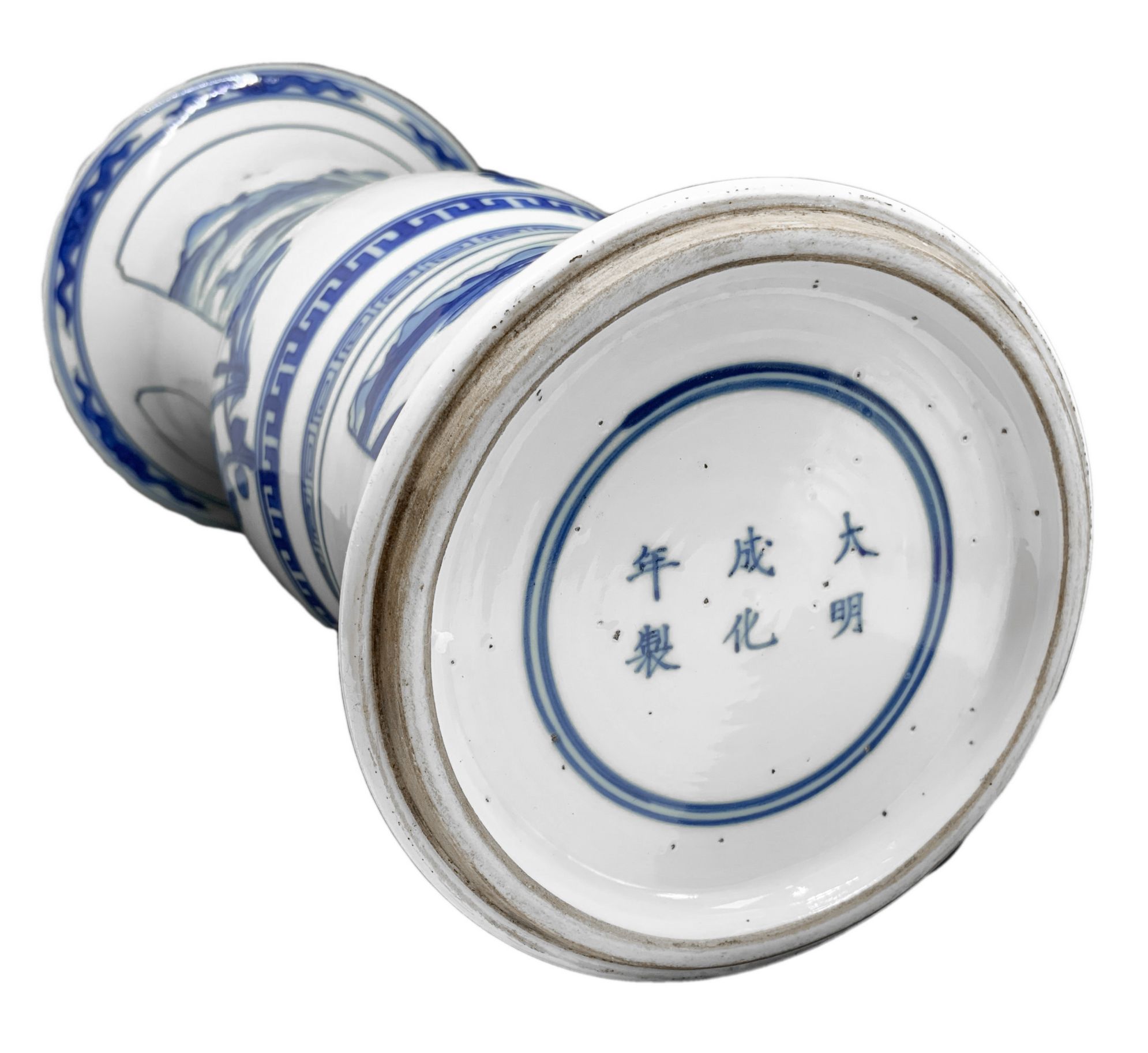 Coppia di vasi a tromba in ceramica cinese bianca blu “Gu” raffiguranti...