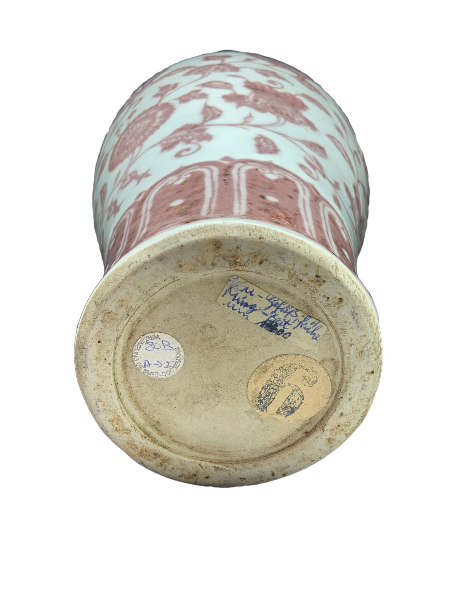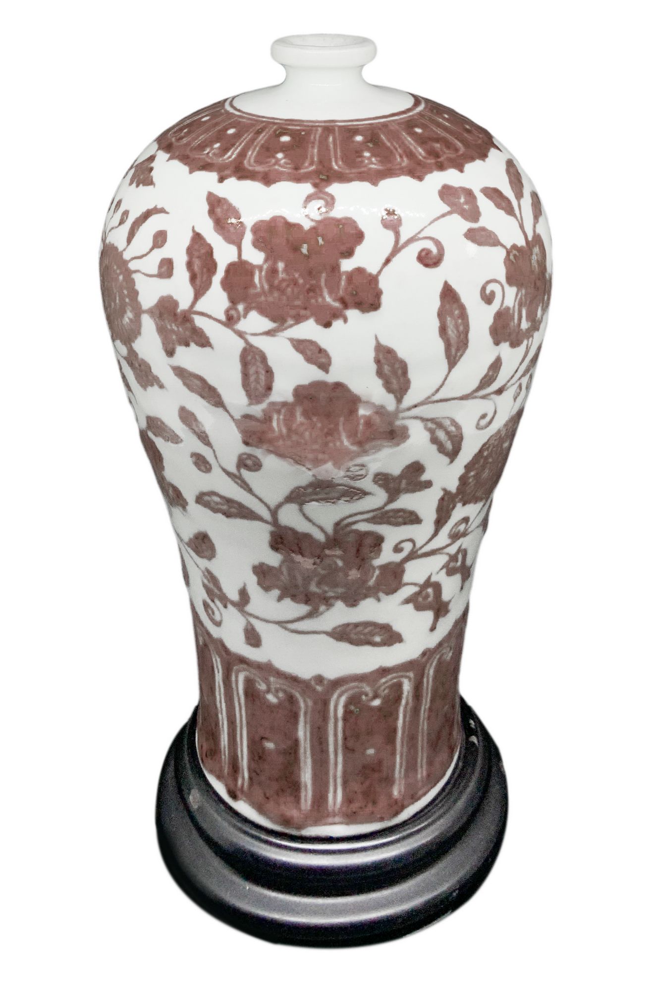 Vaso Meiping con sottosmalto rosso rame, Cina, dinastia Ming (1368-1644). Decorazioni Florence in bordeaux su fondo bianco, da collezione privata olandese. H 30cm. Con base in legno h cm 3.