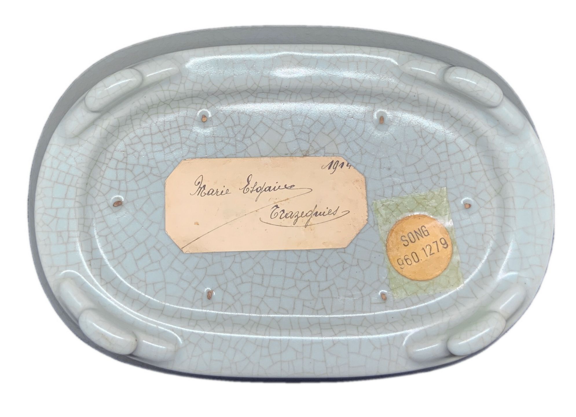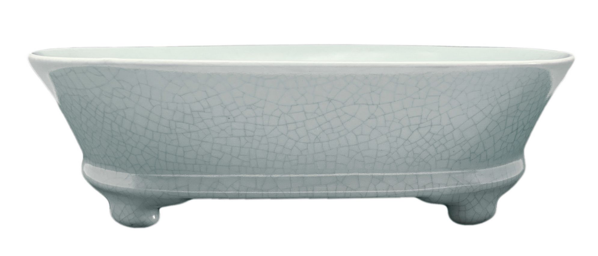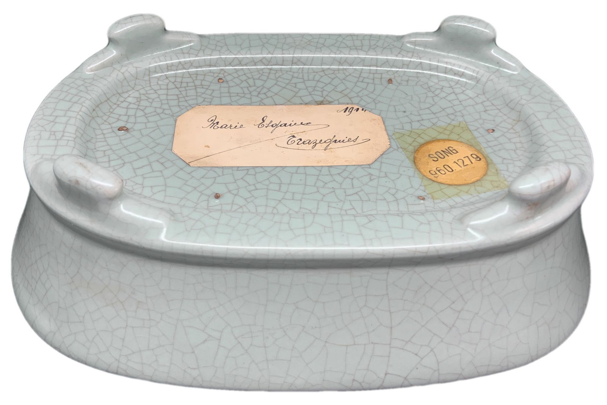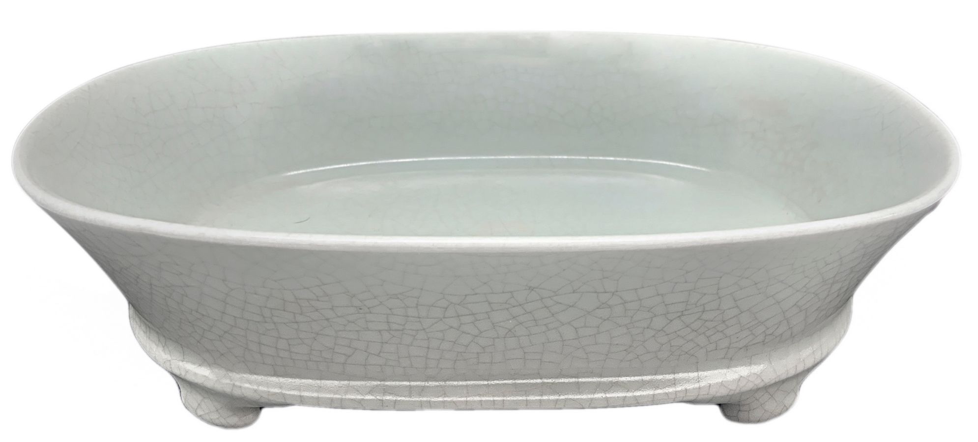 Bacinella lavamani in ceramica verde narciso, probabile dinastia Song. La bacinella é ovale, con i lati obliqui e sottili e quattro piedini a forma di nuvola. É interamente ricoperta da una laccatura brillante verde chiaro. Durante la cottura, il pezzo veniva sorretto da 6 piccoli supporti sottostanti, che alla fine della produzione restavano color crema e senza laccatura.H cm 7. Lunghezza cm 23,4. Profondità cm 16.