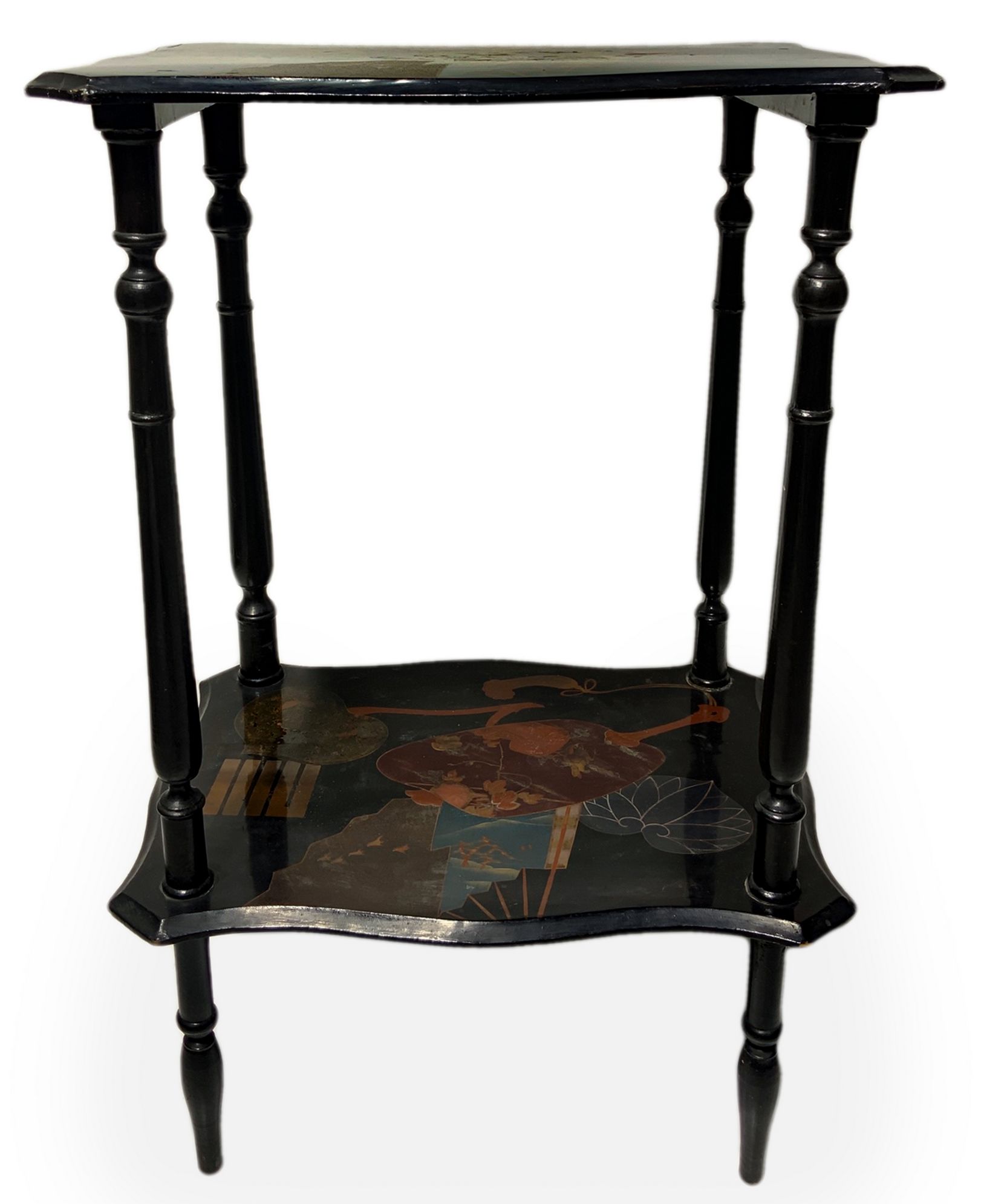 Tavolino laccato nero a chinoiserie, Francia, XIX secolo. A due piani. Cm 76x x37x50
