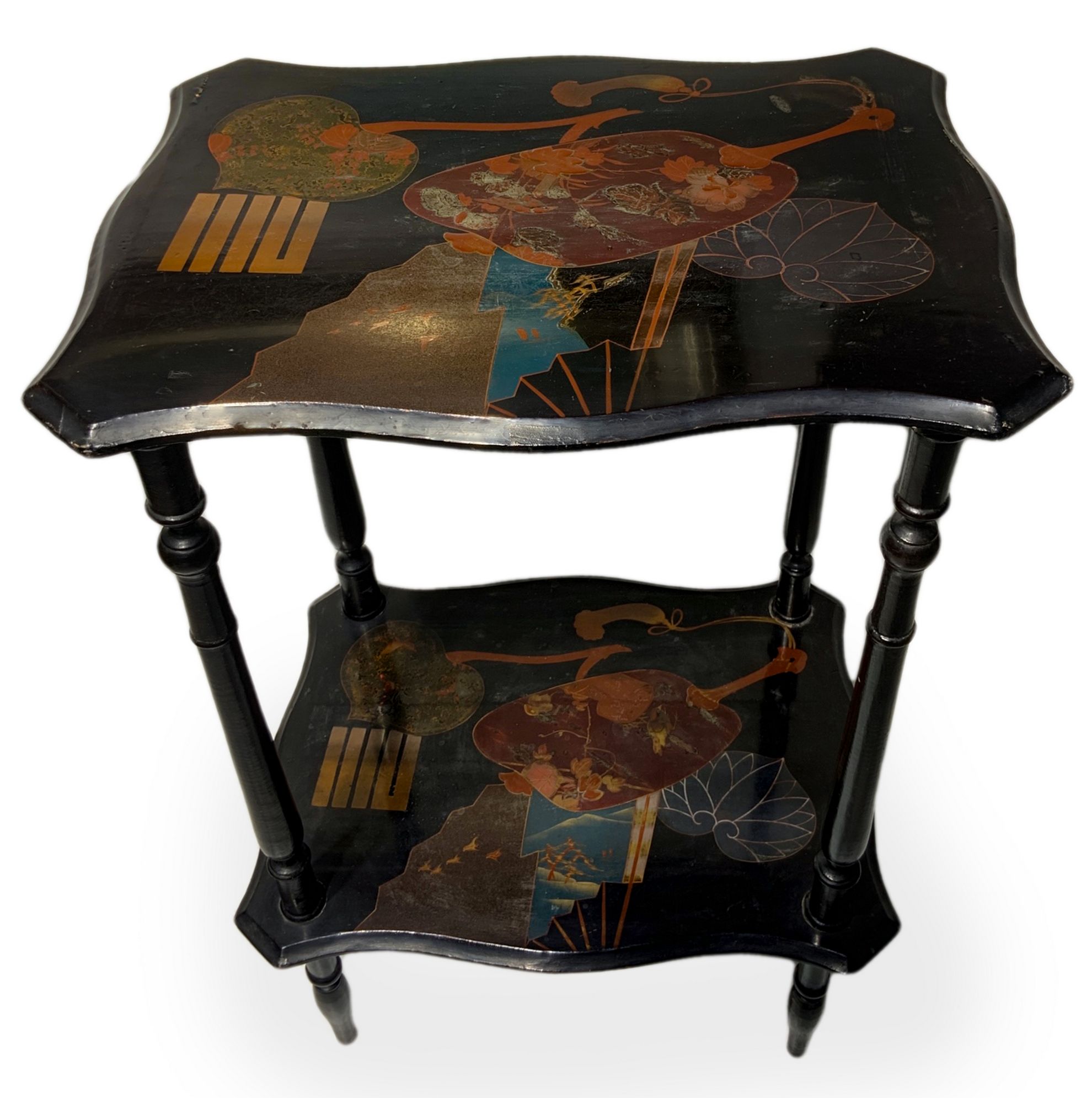 Tavolino laccato nero a chinoiserie, Francia, XIX secolo. A due piani. Cm 76x...