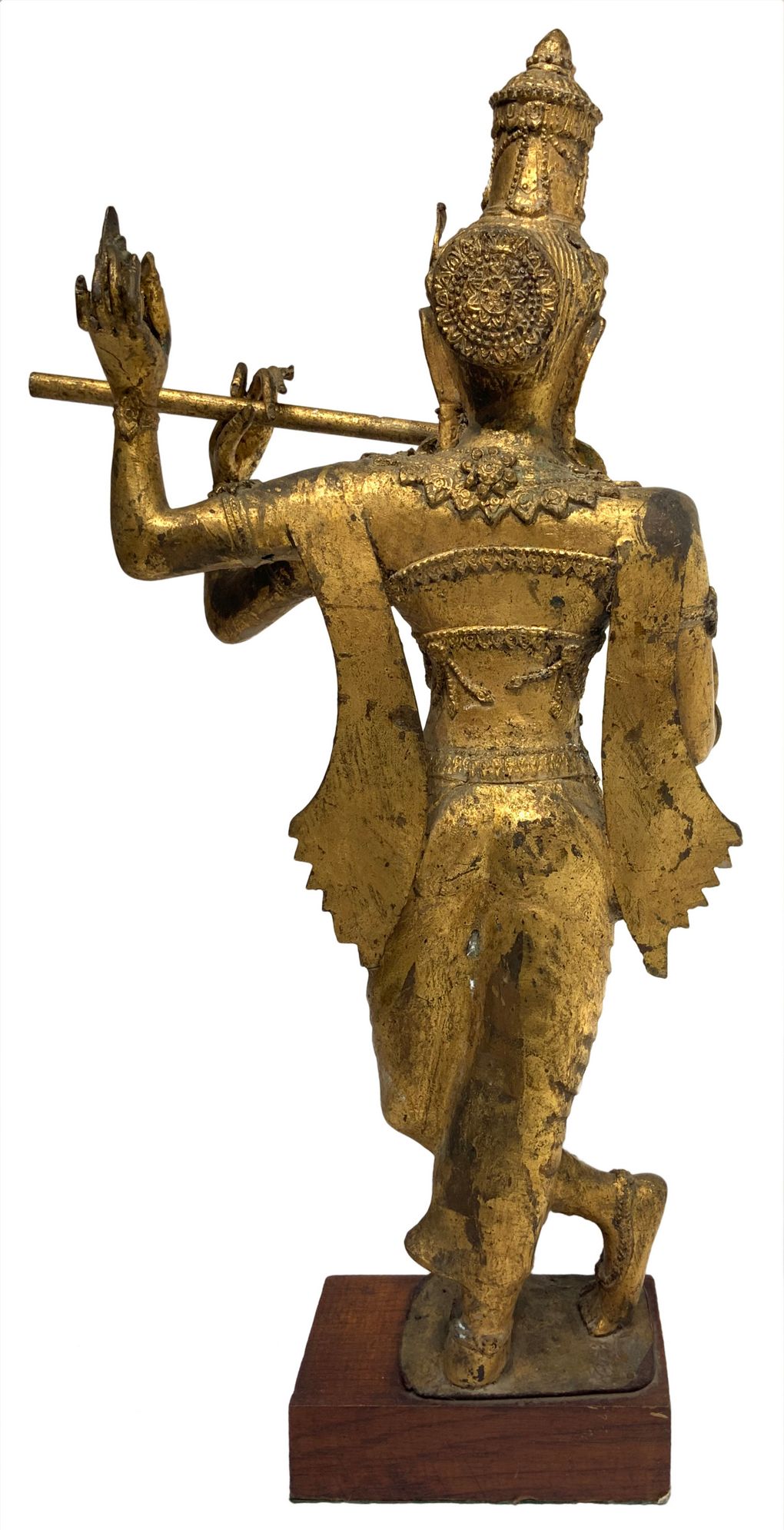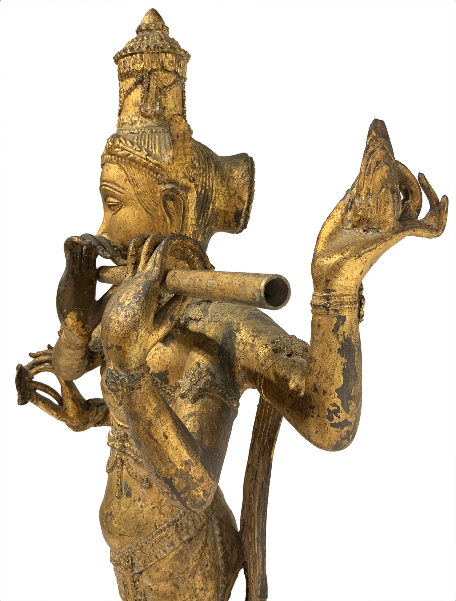 Origine Birmania. Antica statuetta in bronzo dorato. Dea Kali’ con 4 braccia che suona il flauto. H Cm 76. Base in legno H Cm 5