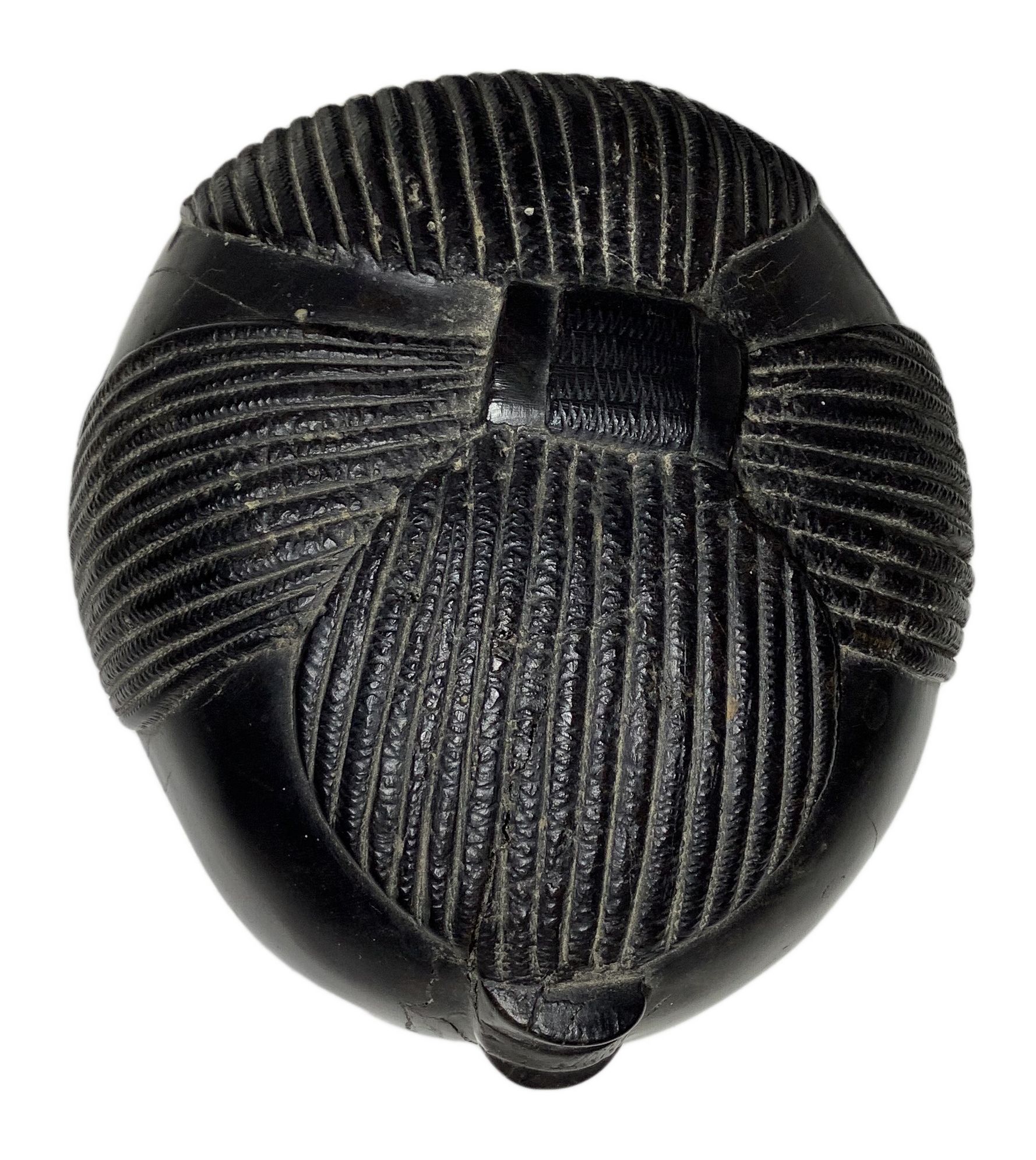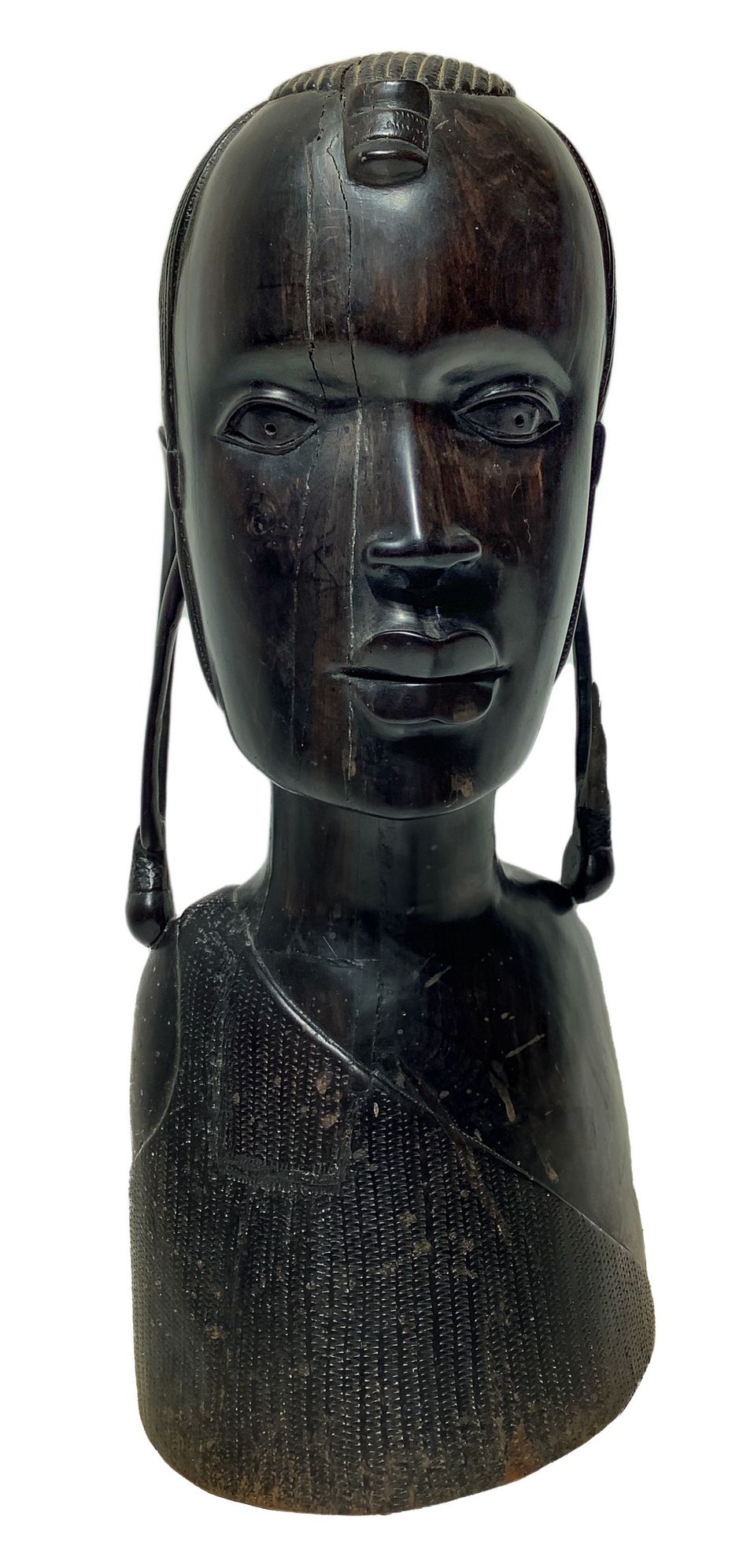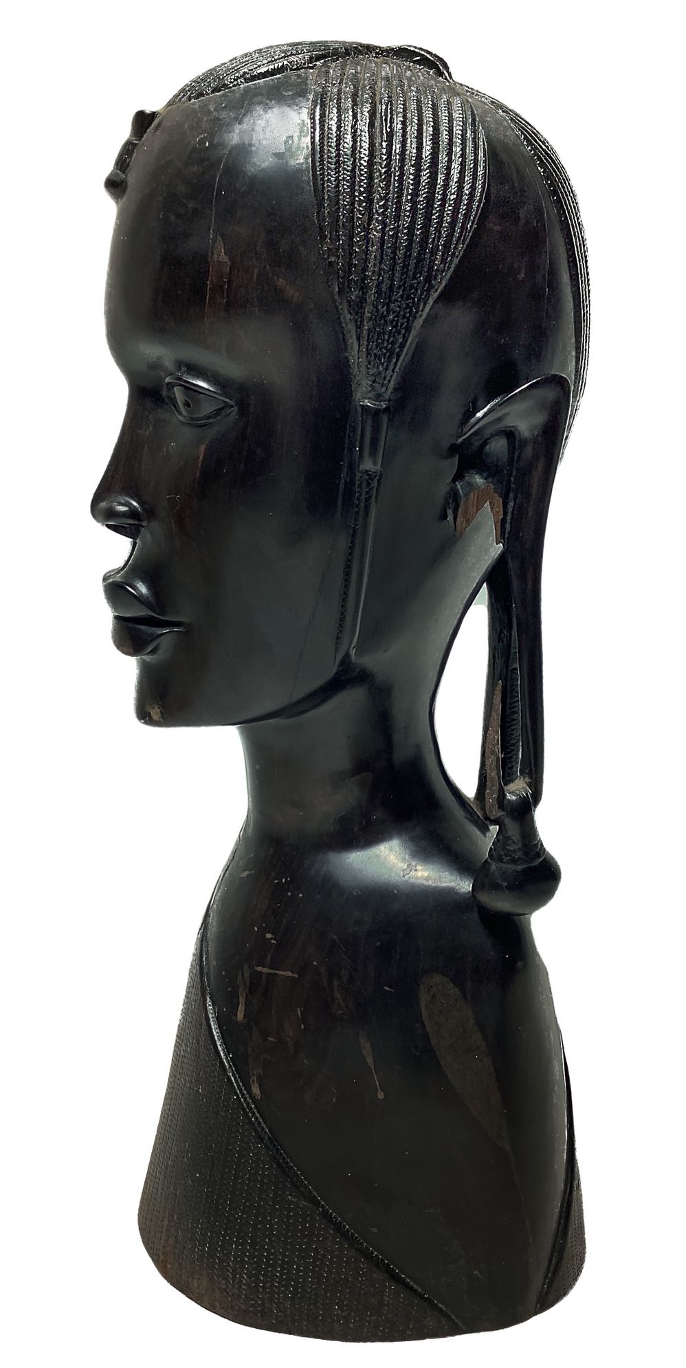 Scultura lignea raffigurante viso di donna con orecchini, Africa. H cm 42, base cm 18. Piccola mancanza in un orecchio.