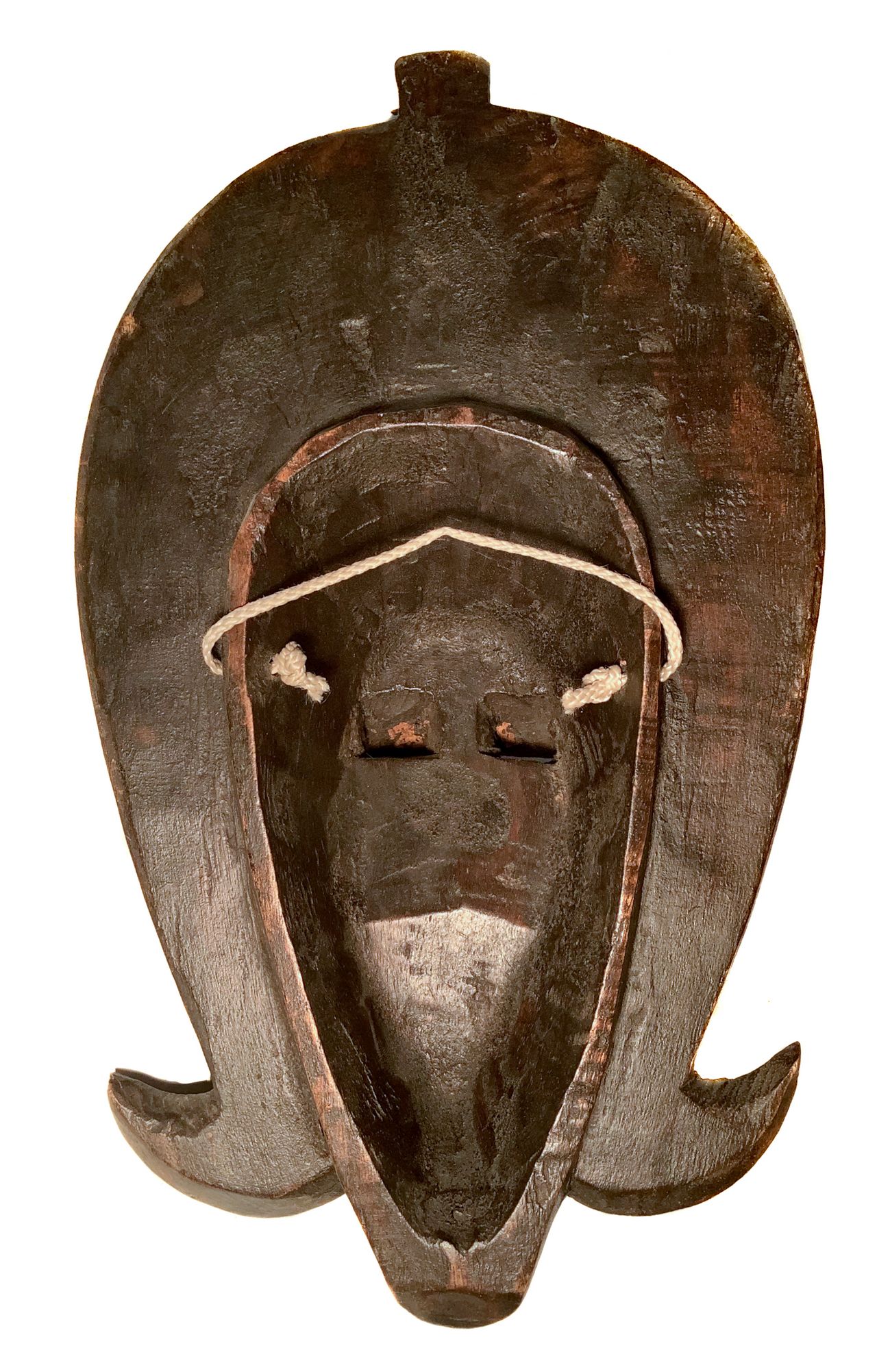 Maschera africana con applicazioni in rame e di tessuto. Cm 34x18,5.