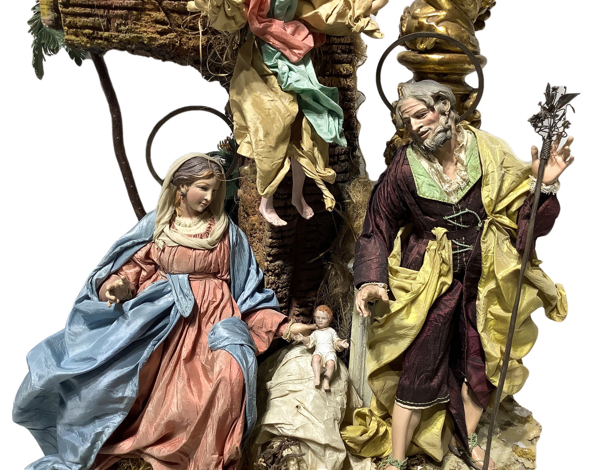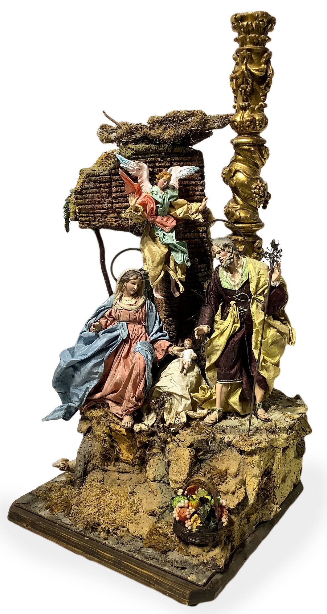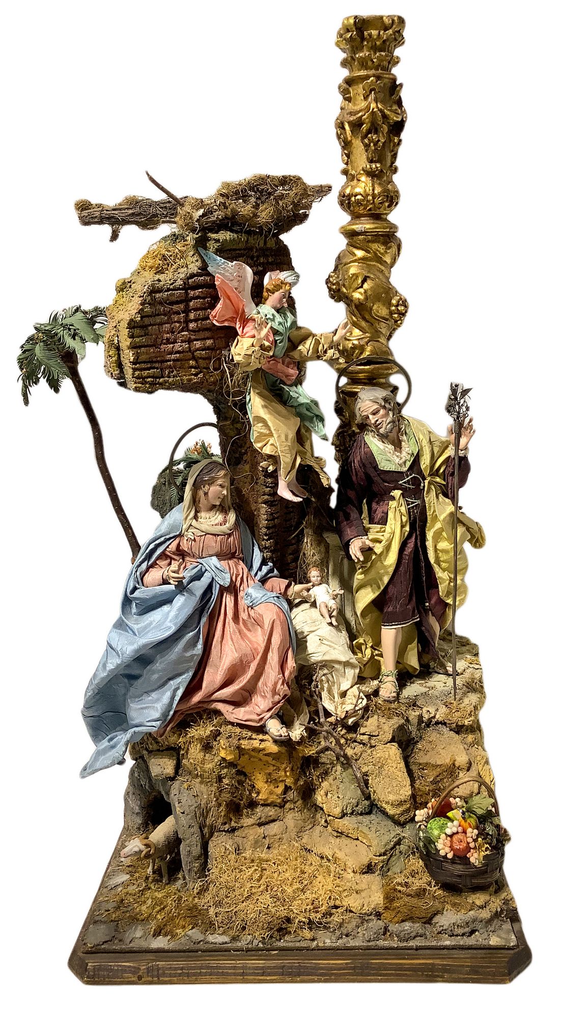 Presepe napoletano, XIX secolo, con colonna tortile, Salomonica in legno dorato (XVII secolo). Viso dei personaggi ed estremità in porcellana, occhi di vetro. Vesti e a cconciature ricondizionate. Hm cm 90, base 43x43