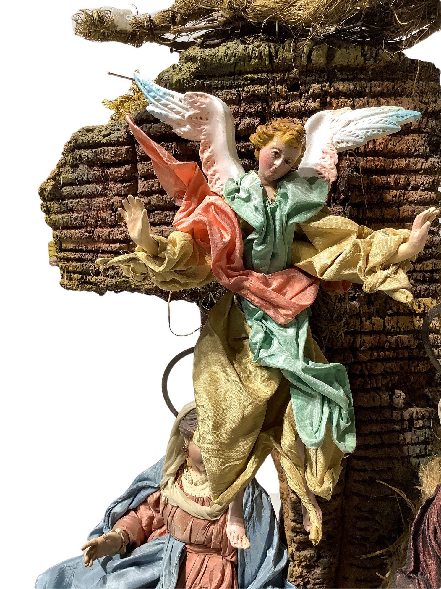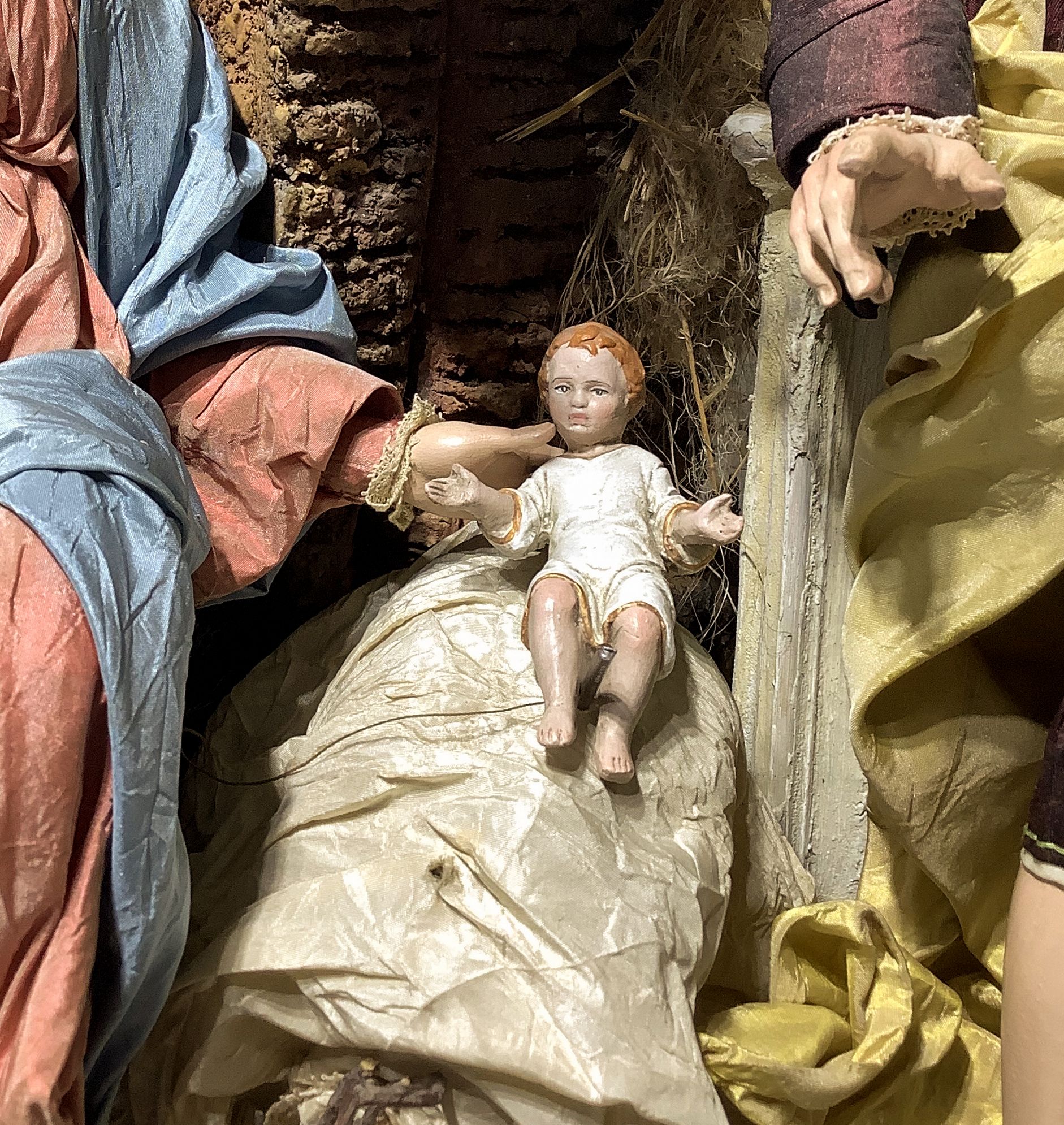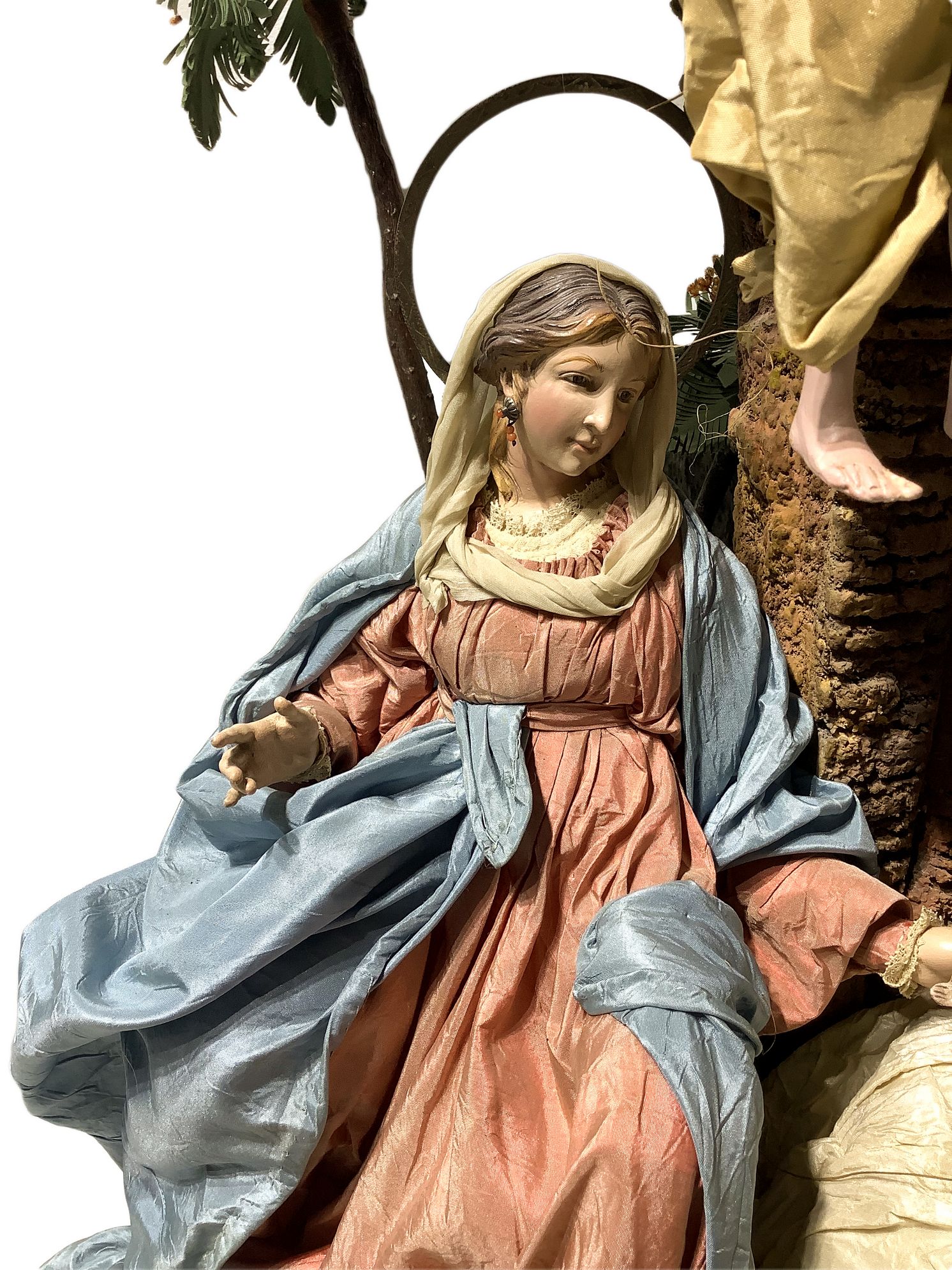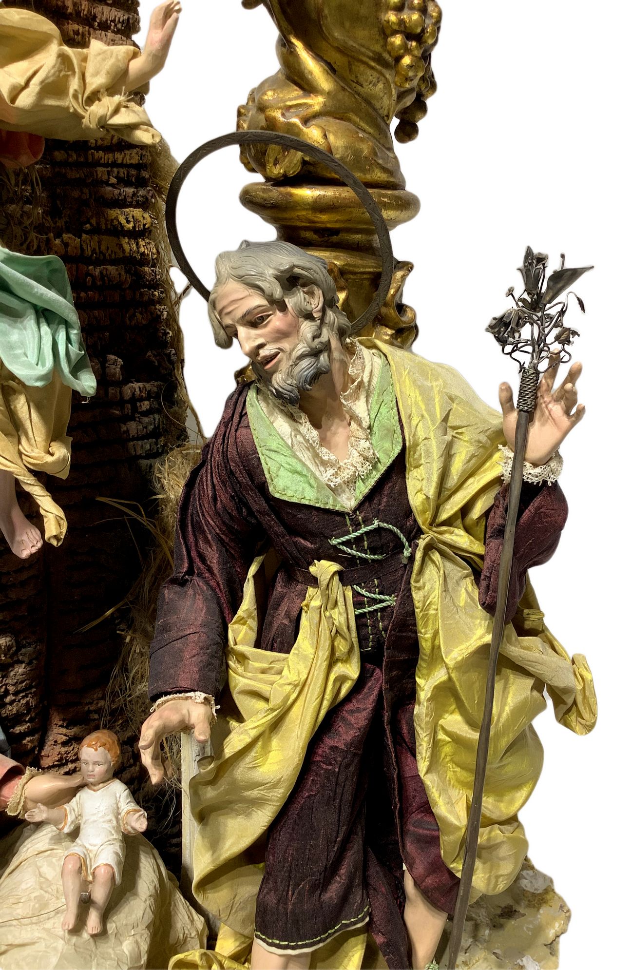 Presepe napoletano, XIX secolo, con colonna tortile, Salomonica in legno dorato (XVII secolo). Viso dei personaggi ed estremità in porcellana, occhi di vetro. Vesti e a cconciature ricondizionate. Hm cm 90, base 43x43