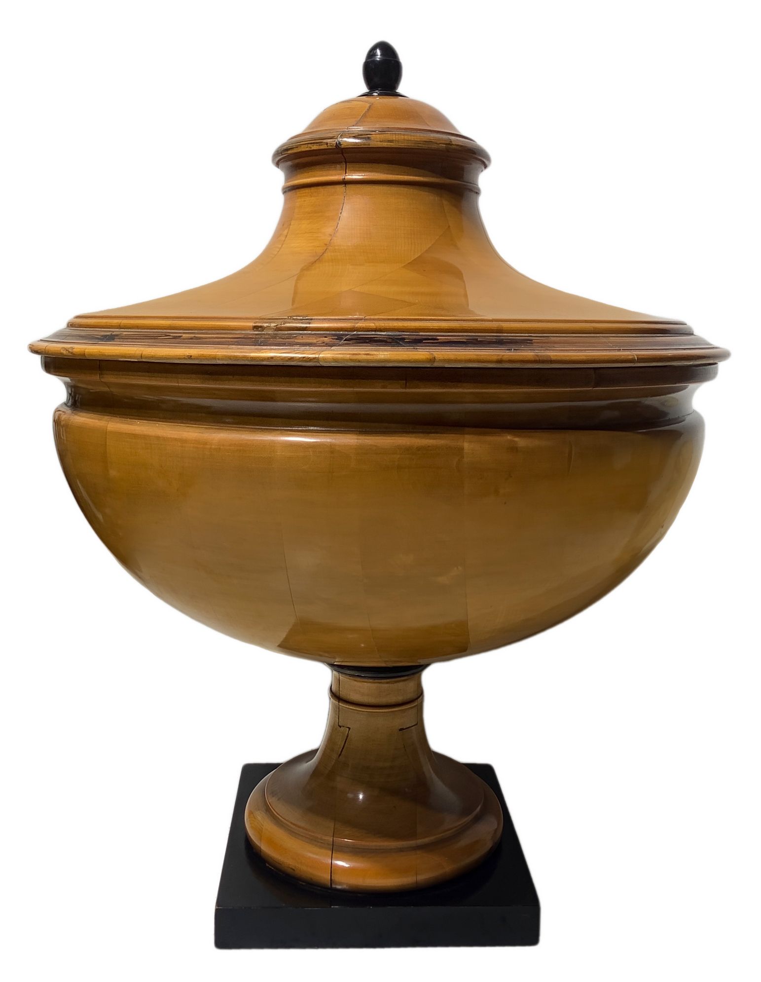 Coppia di potiche biedermeier in legni chiari con dettagli, pomo e base ebanizzati. Con coperchio h 62X50.