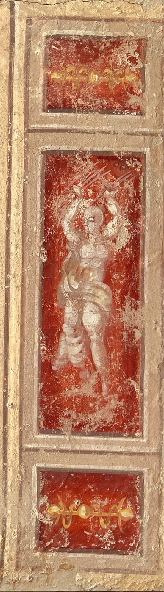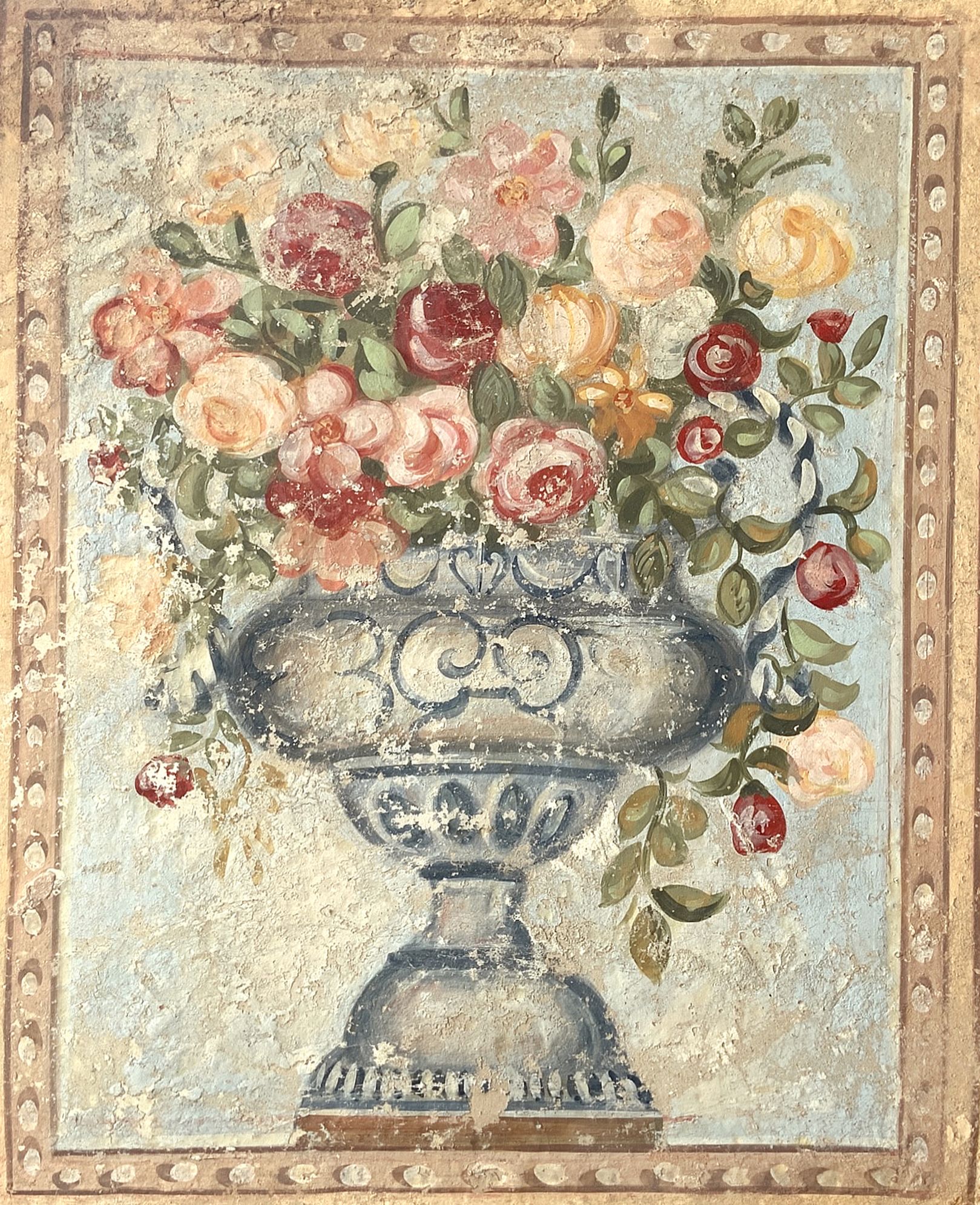 Strappo di affresco riportato su tela rafffigurante natura morta in policromia nello stile pompeiano, applicata su tela, XX secolo. Cm 100x130