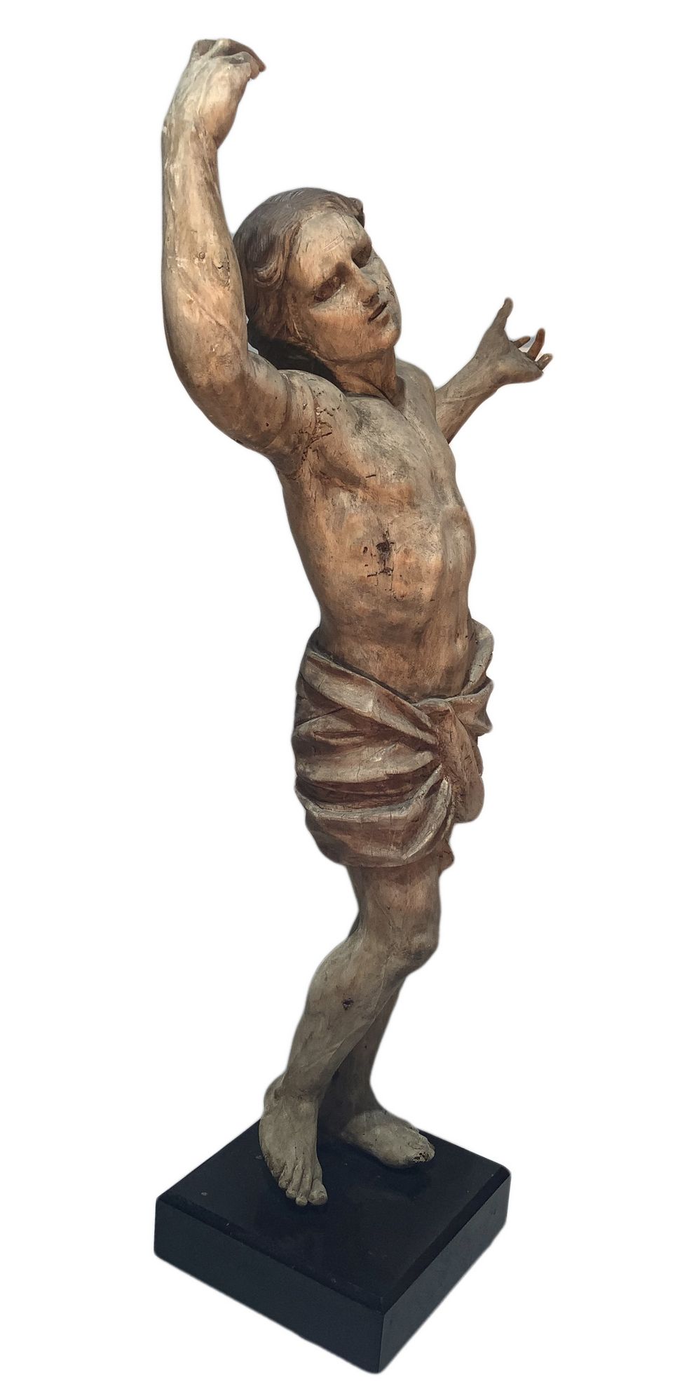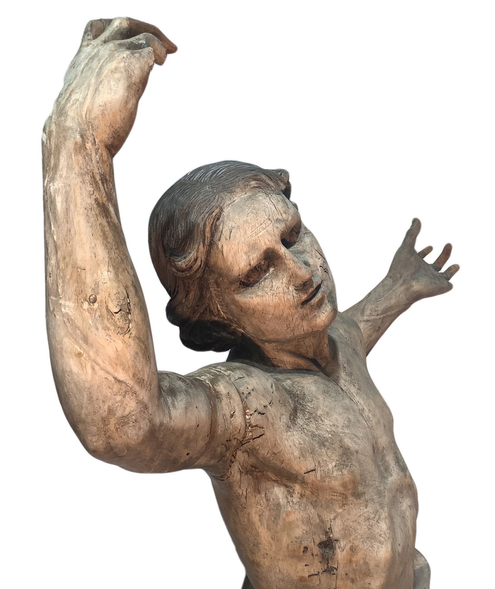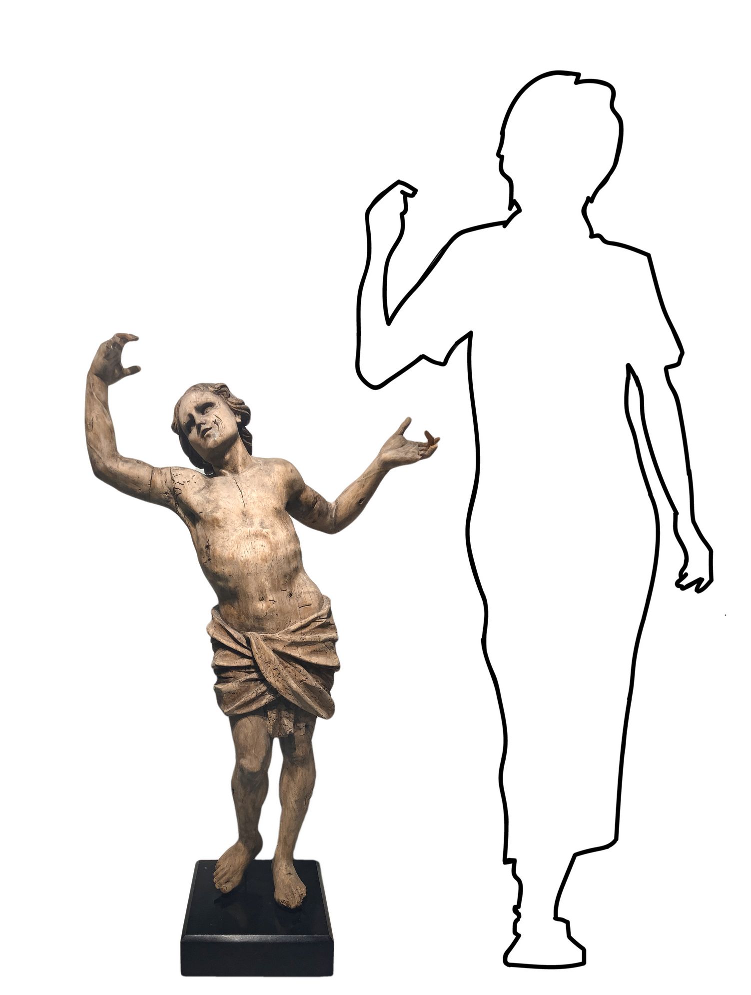 Statua lignea raffigurante San Sebastiano, XVI secolo. H cm 108. Base in marmo. H totale cm 119. Piccole mancanze.