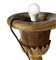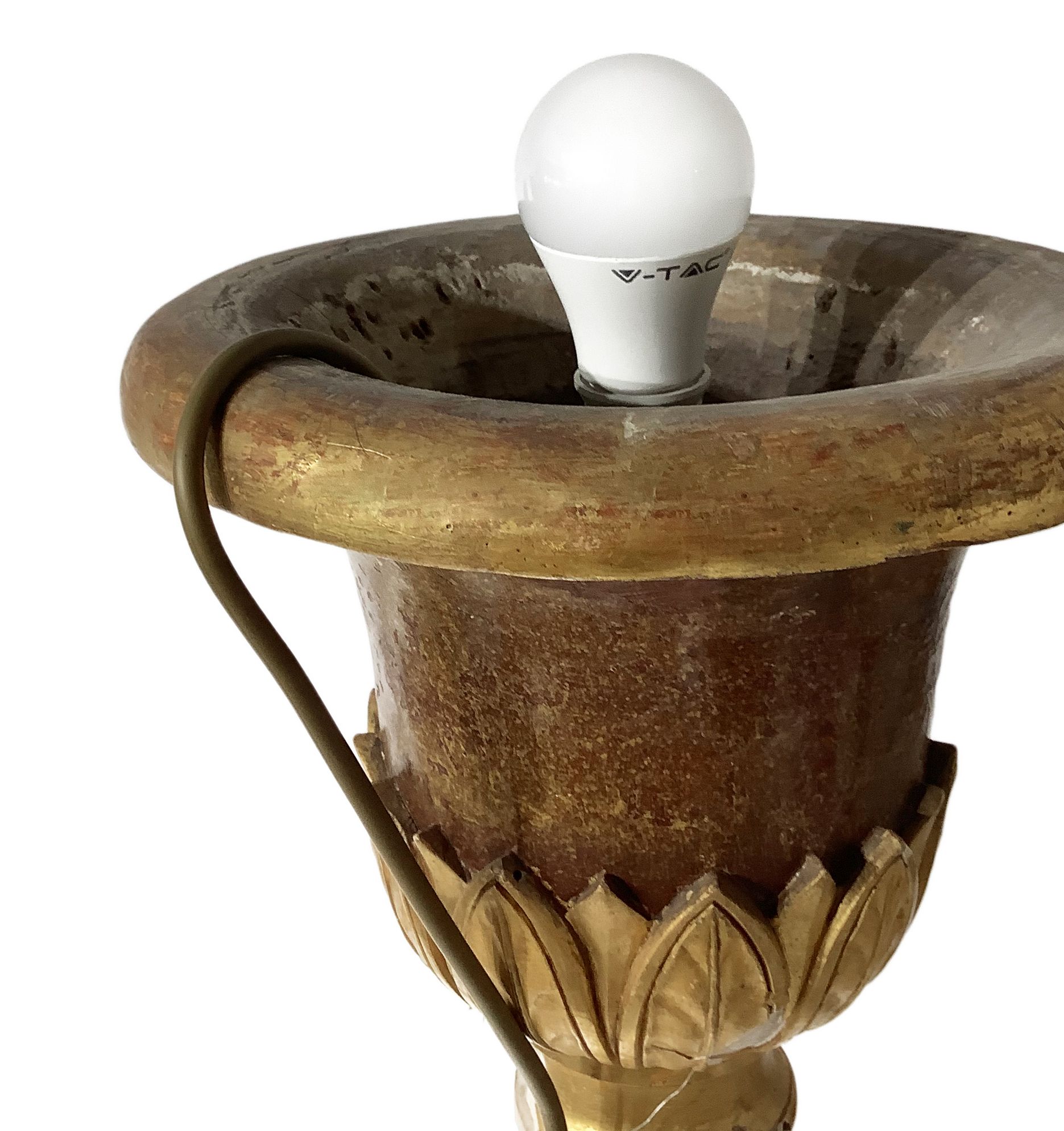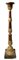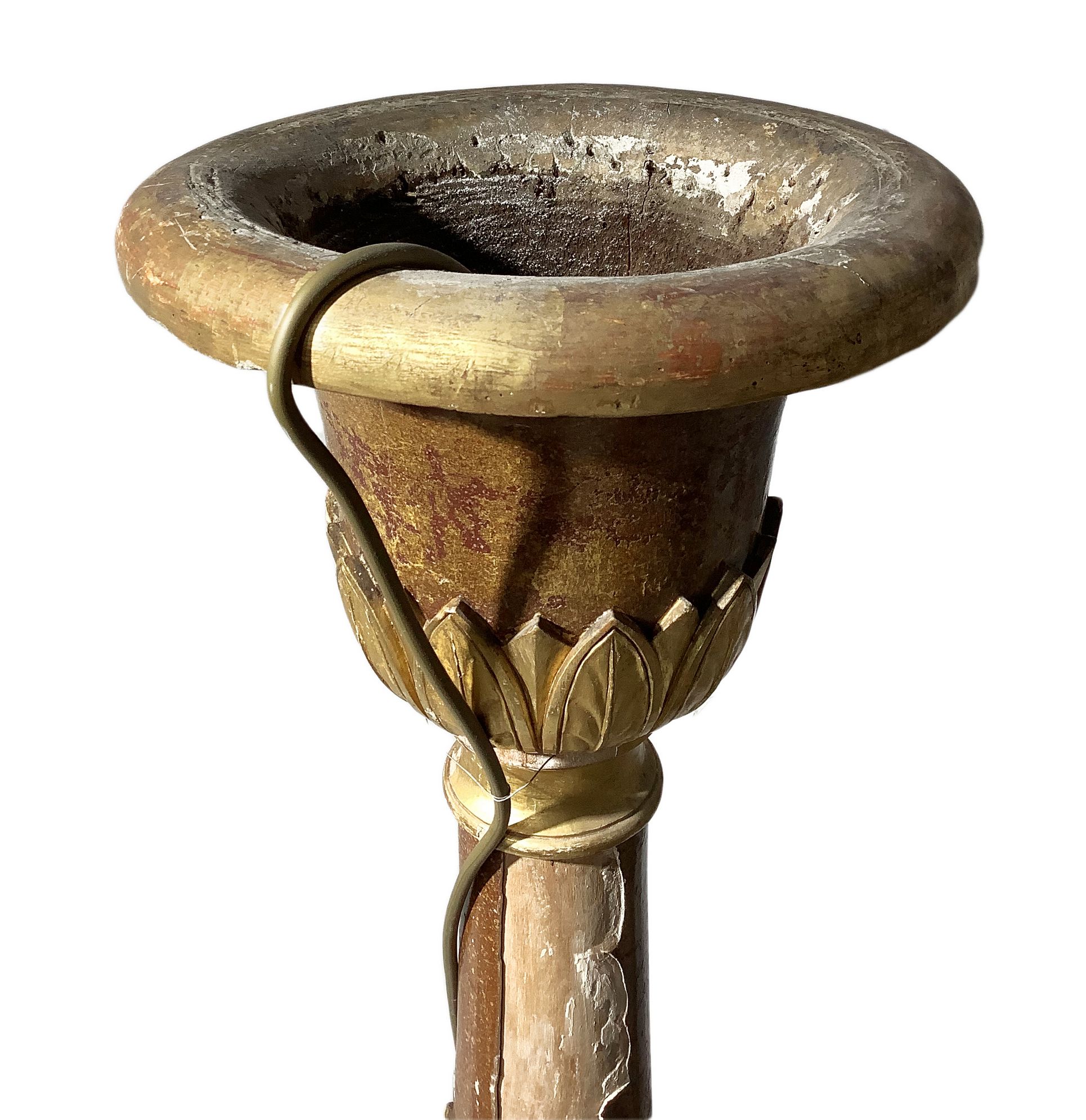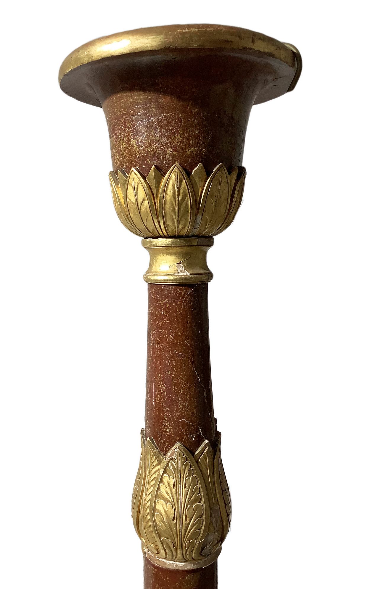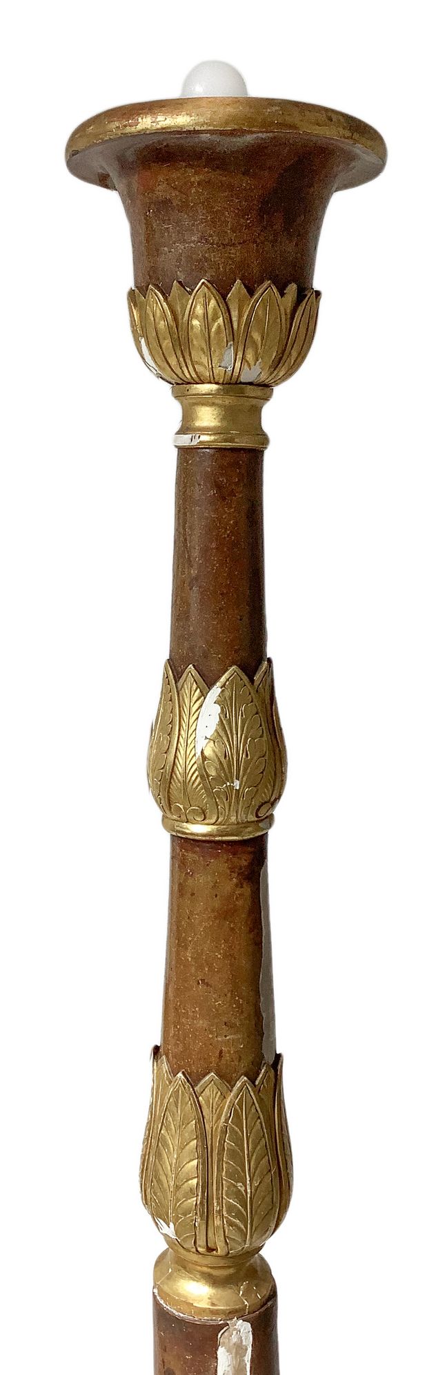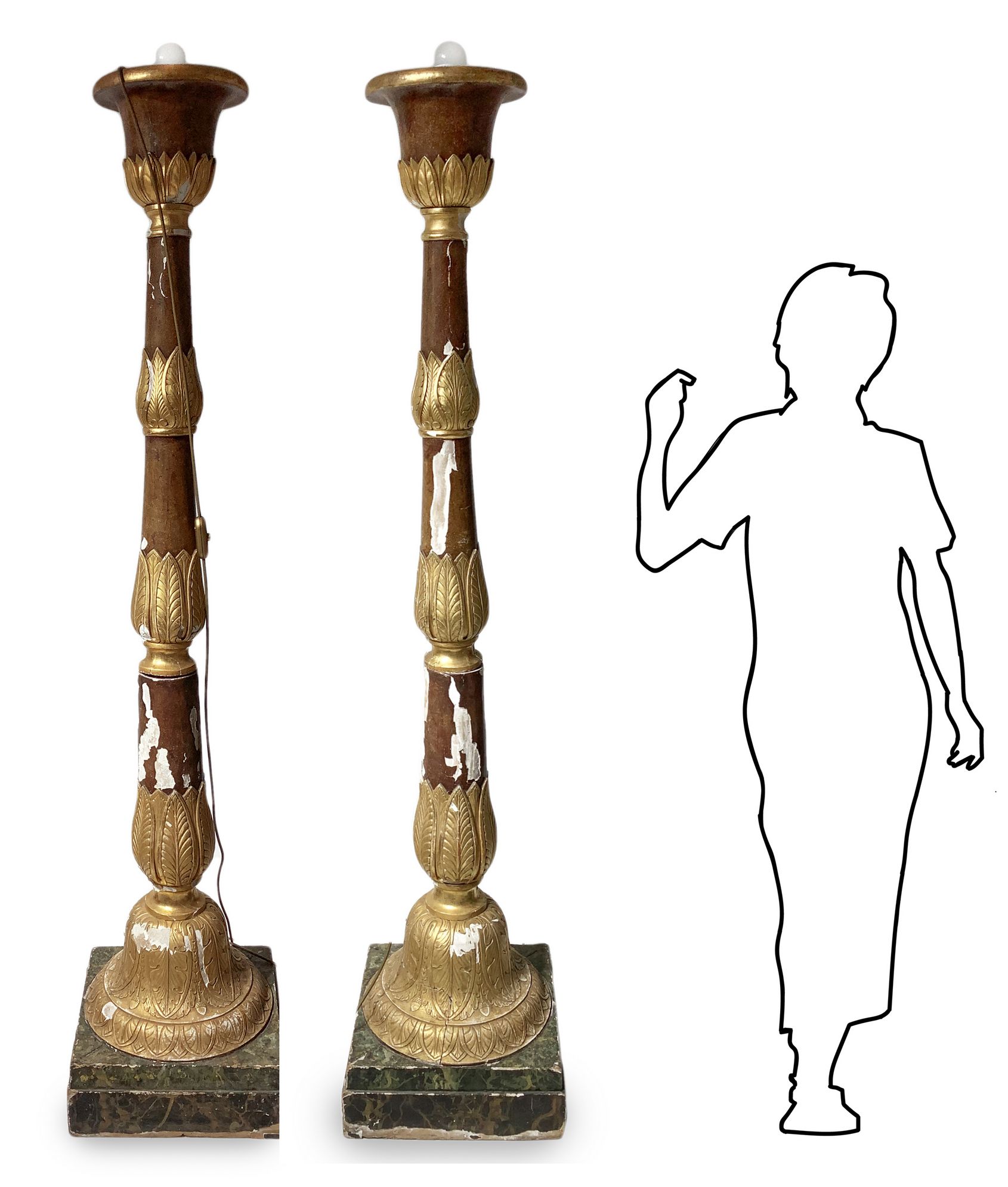 Coppia di torcieri in legno laccato, finitura finto porfido e dorati con foglie d’acanto, periodo Impero, inizi XIX. Finale a calice adattati a lampada. H cm 195. Base quadrata cm 44x44. Cadute di colore. Adattati a lampada