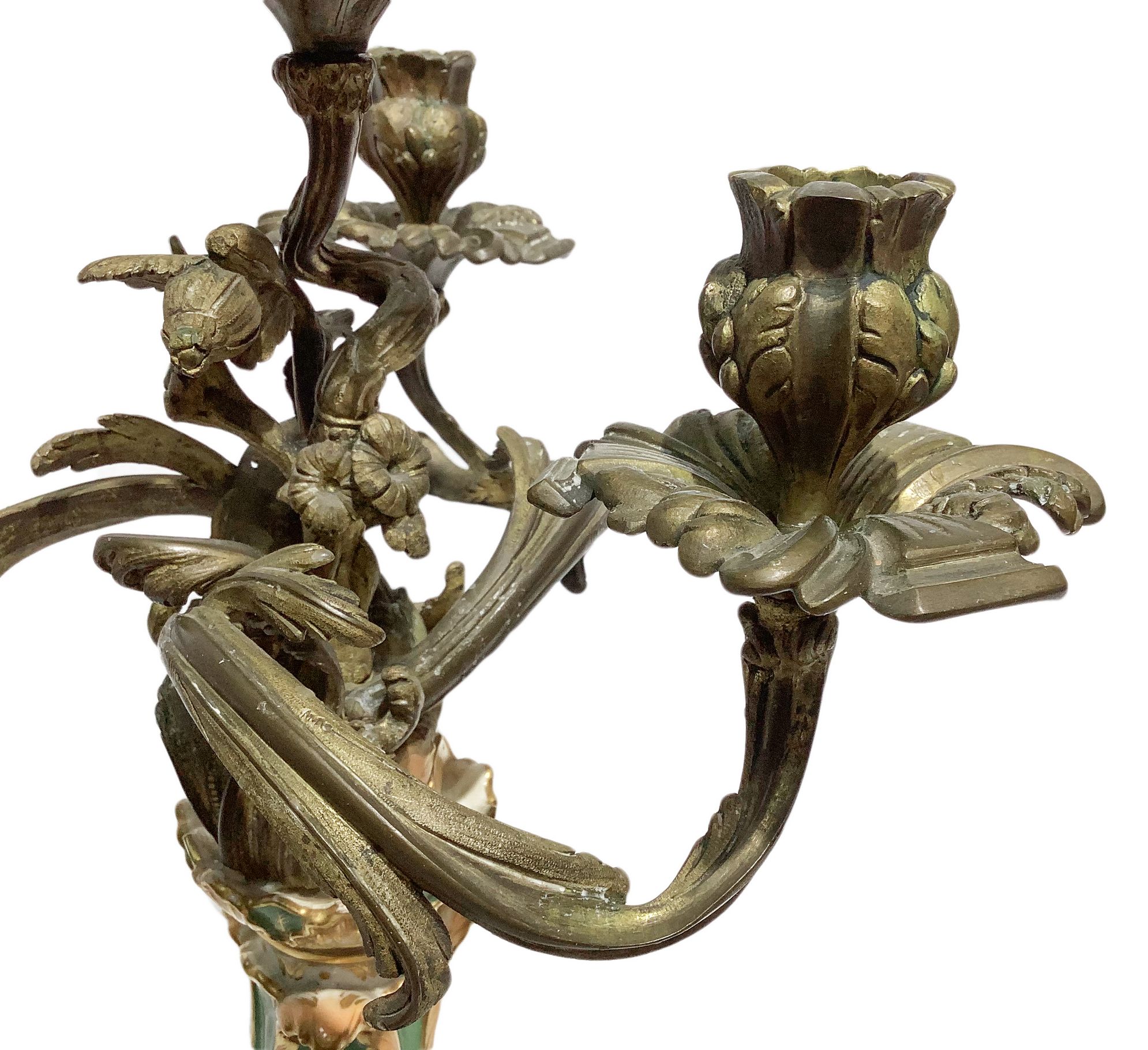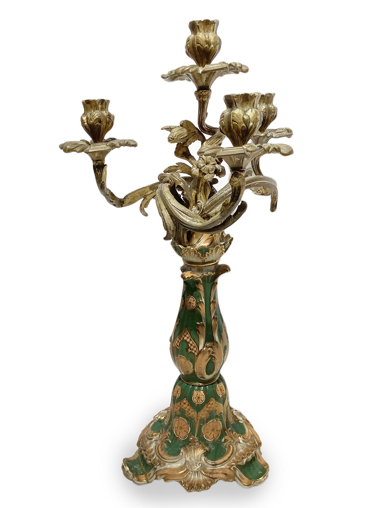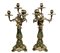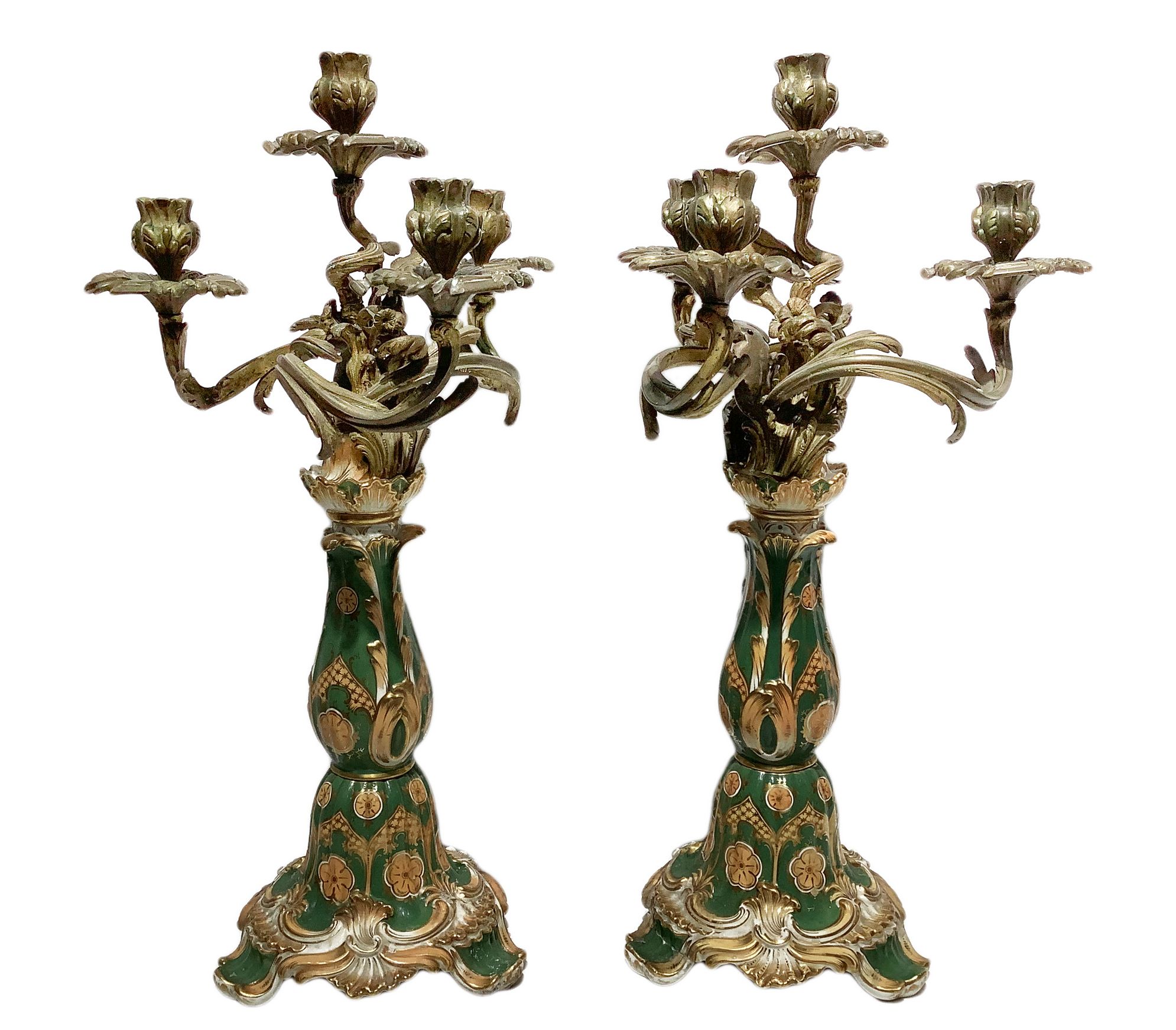 Coppia di candelieri nello stile di Jacob Petit (Parigi 1796-1868), Francia. Con base in porcellana verde decorata oro e 4 braccia in bronzo con volute a larghe foglie. H cm 60.