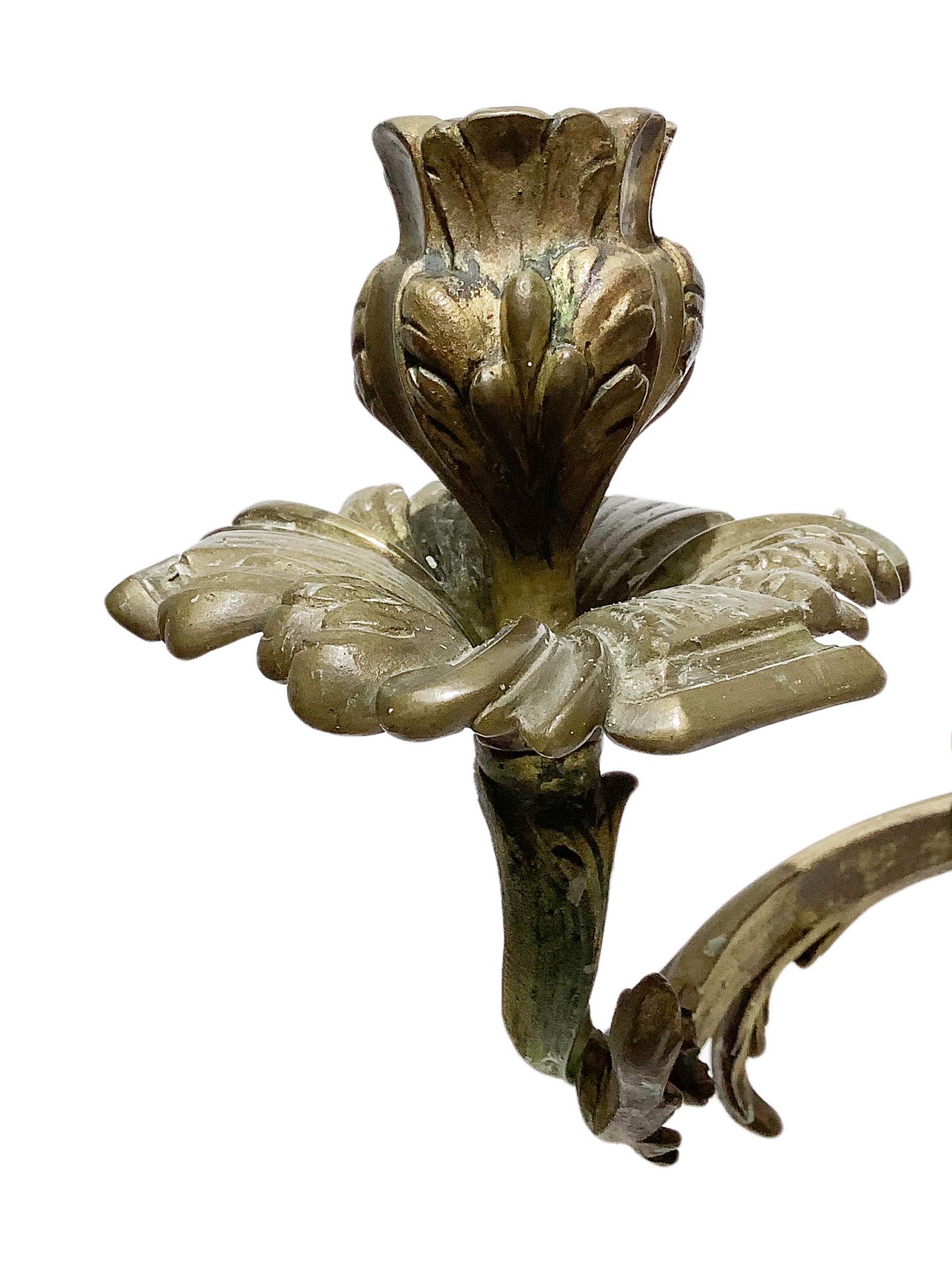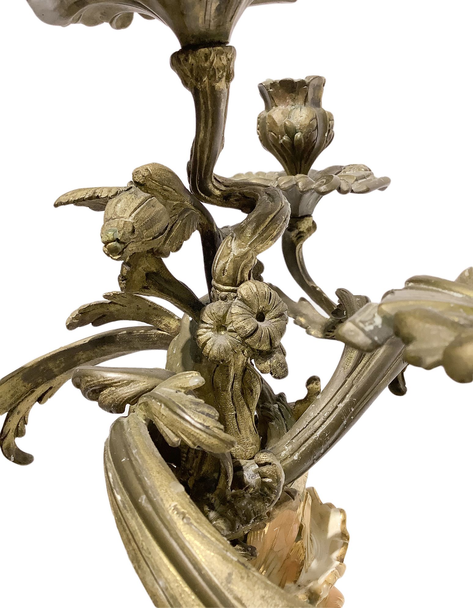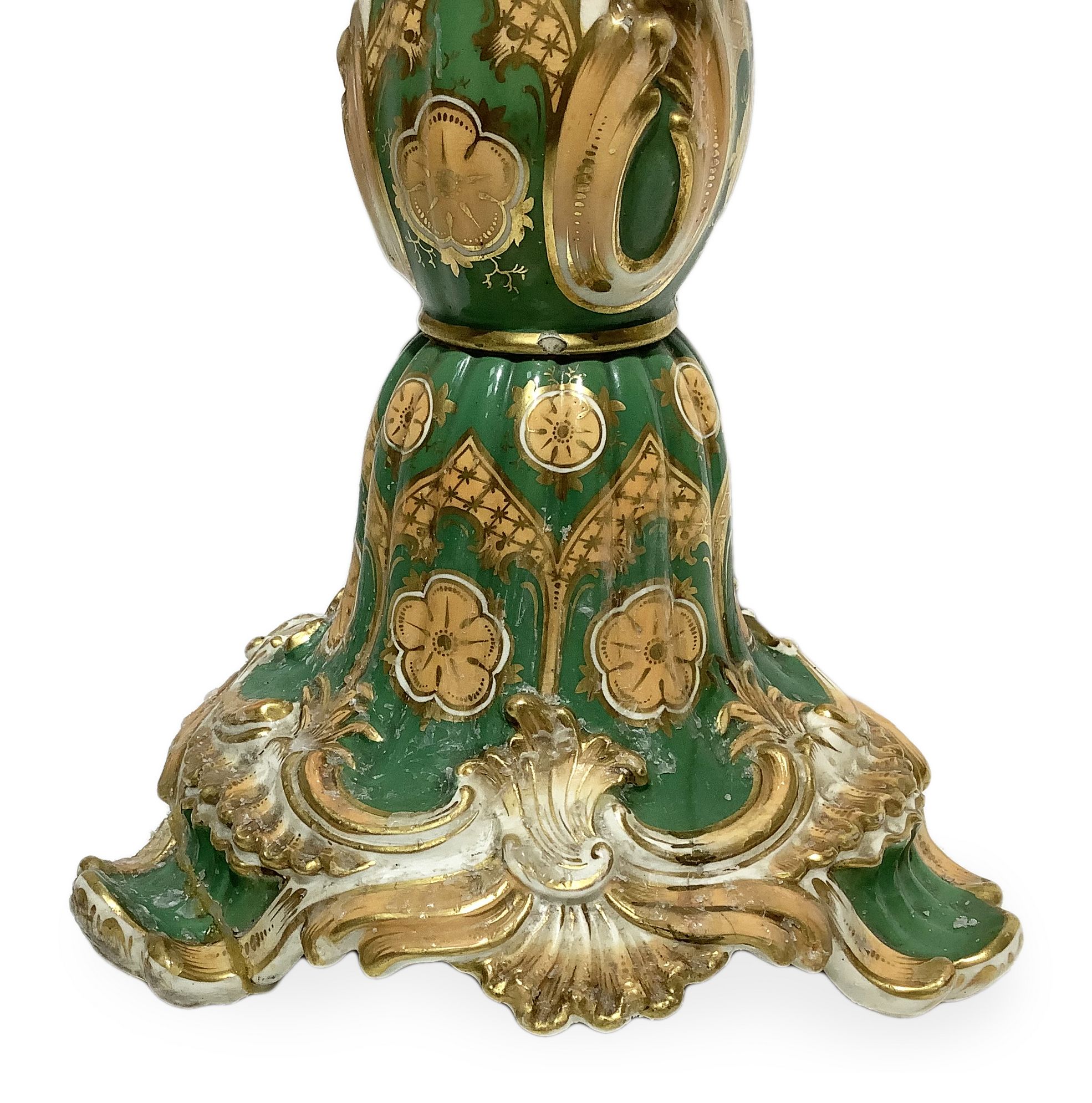 Coppia di candelieri nello stile di Jacob Petit (Parigi 1796-1868), Francia. Con base in porcellana verde decorata oro e 4 braccia in bronzo con volute a larghe foglie. H cm 60.