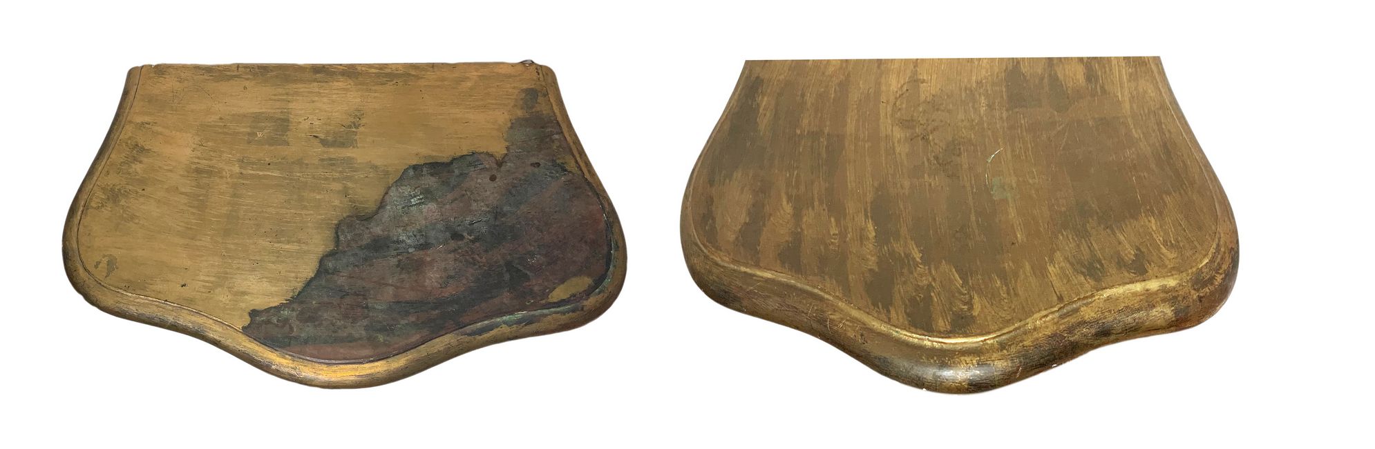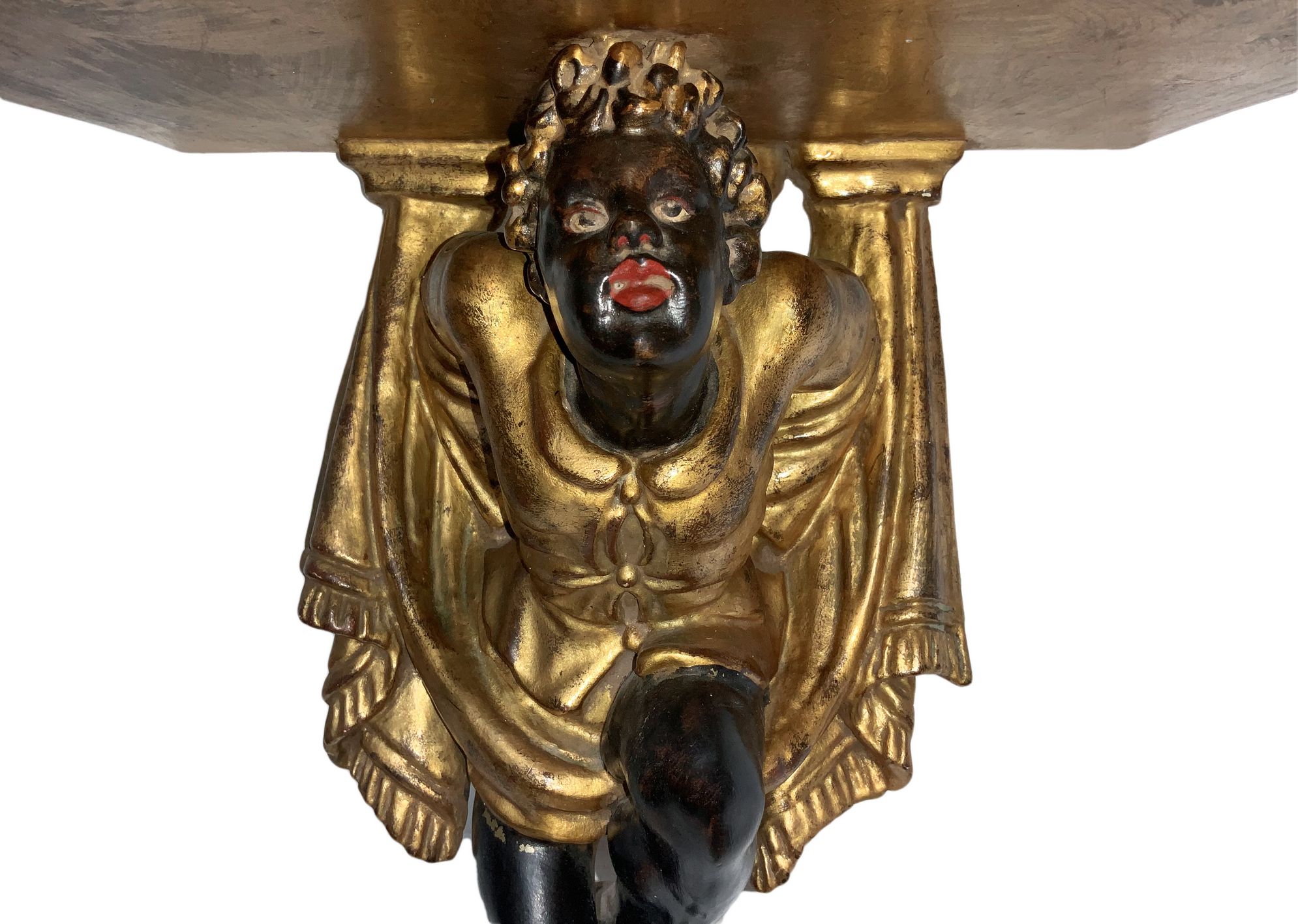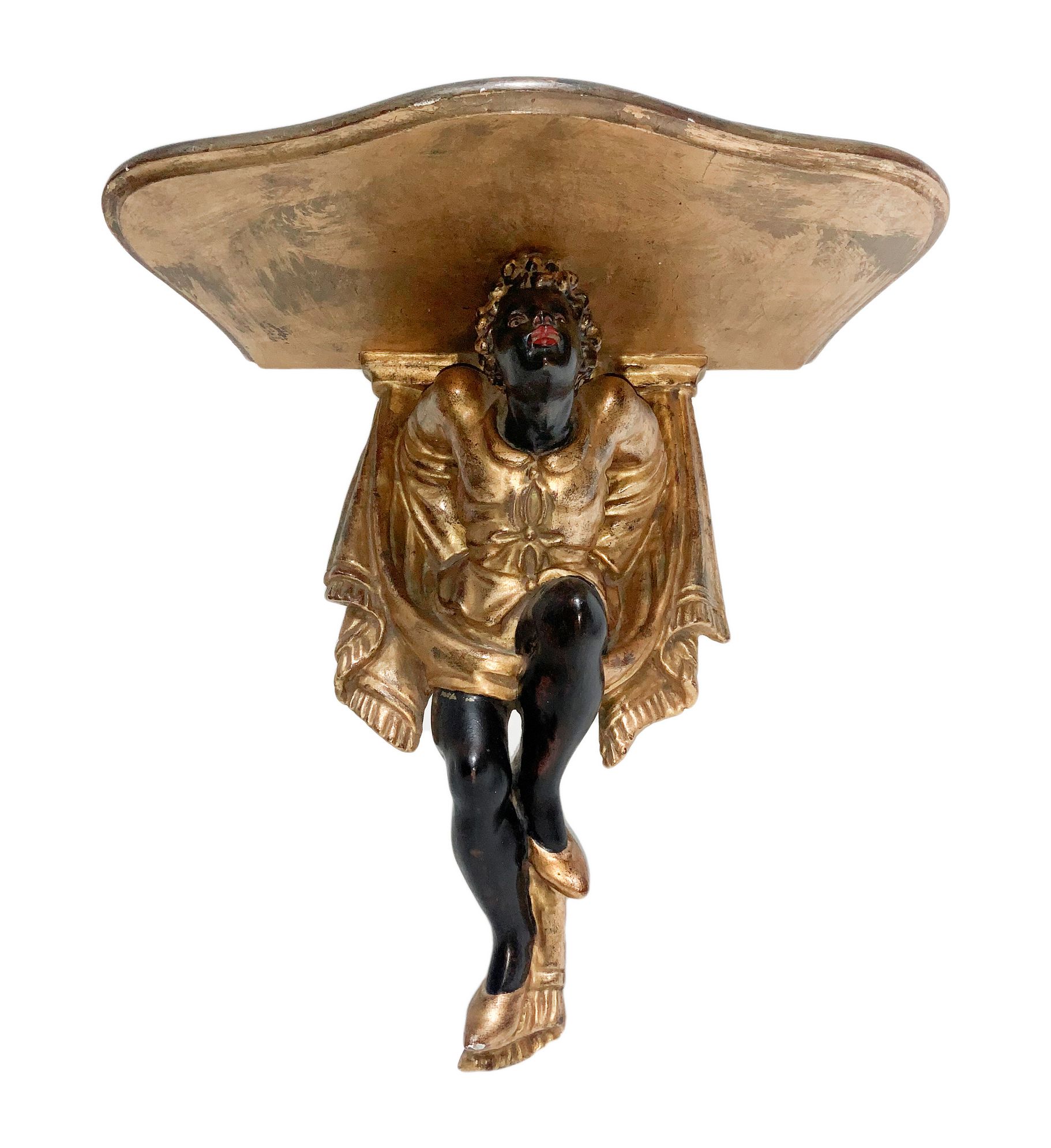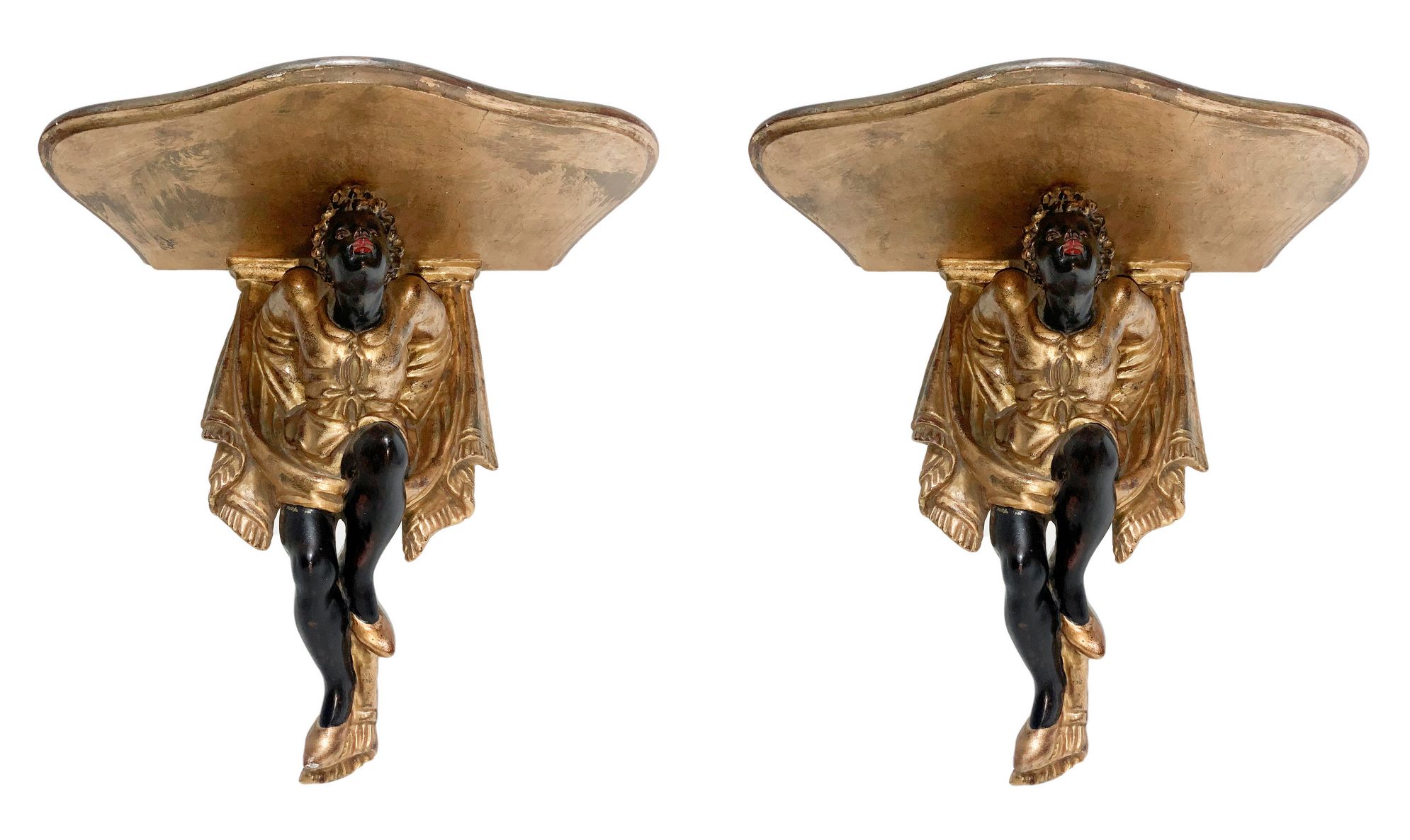 Coppia di piccole mensole sostenute da Mori, XX secolo, Sicilia. H cm 41x41x27. Mancanze di doratura