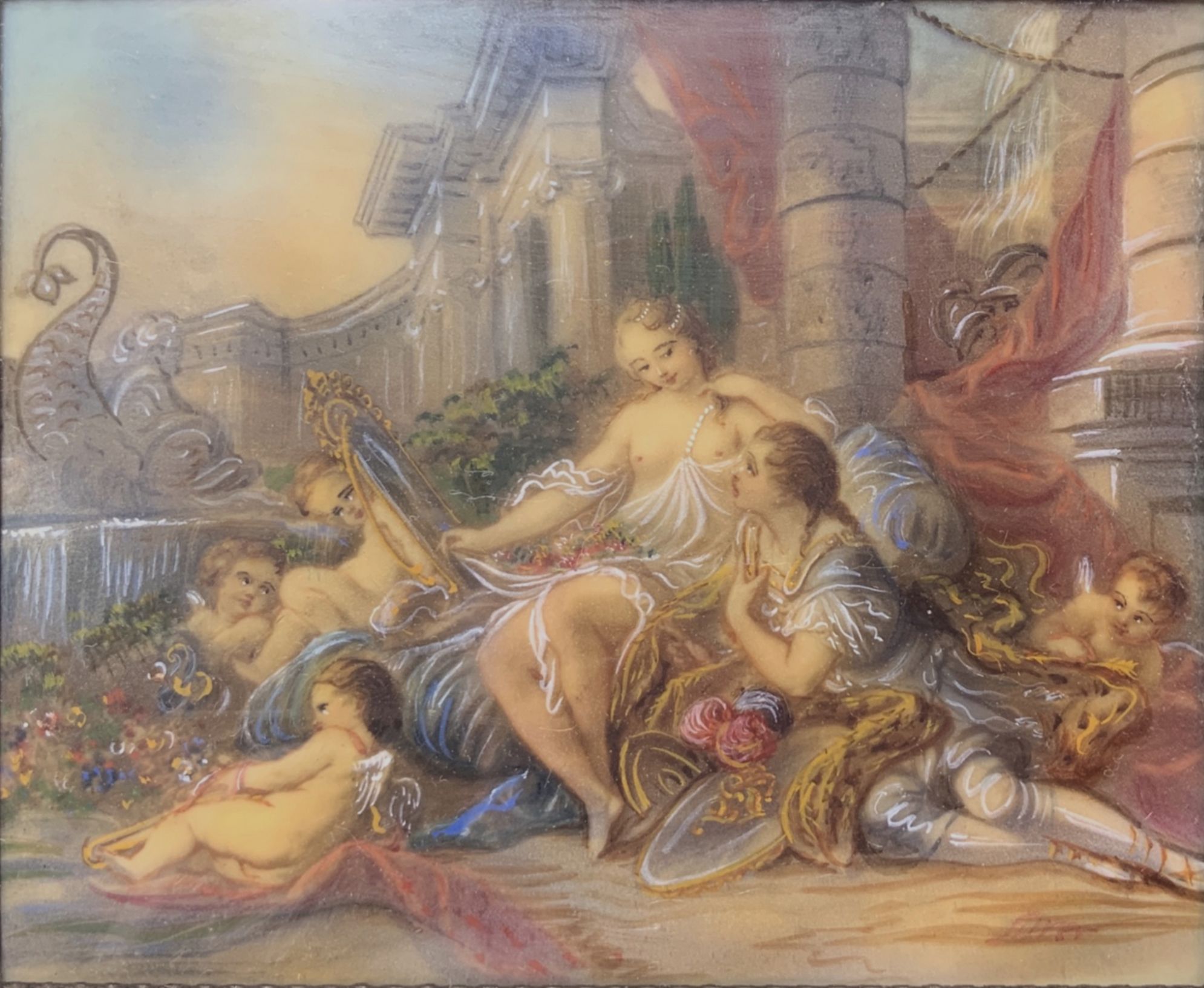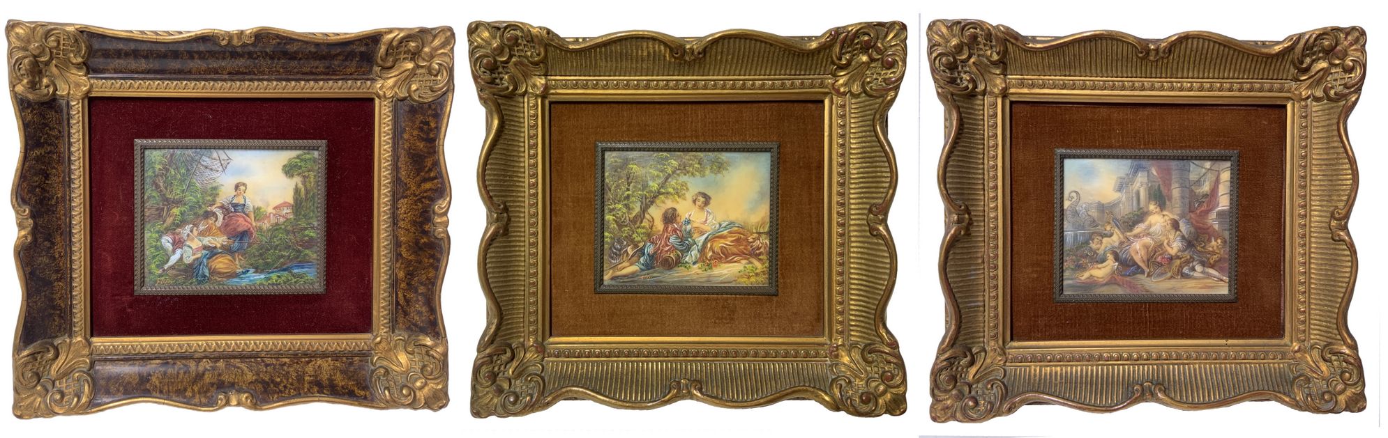 Gruppo di n.3 miniature su avoriolina raffiguranti scene di genere, XIX secolo. Cm 8x10. In cornice cm 21x23.