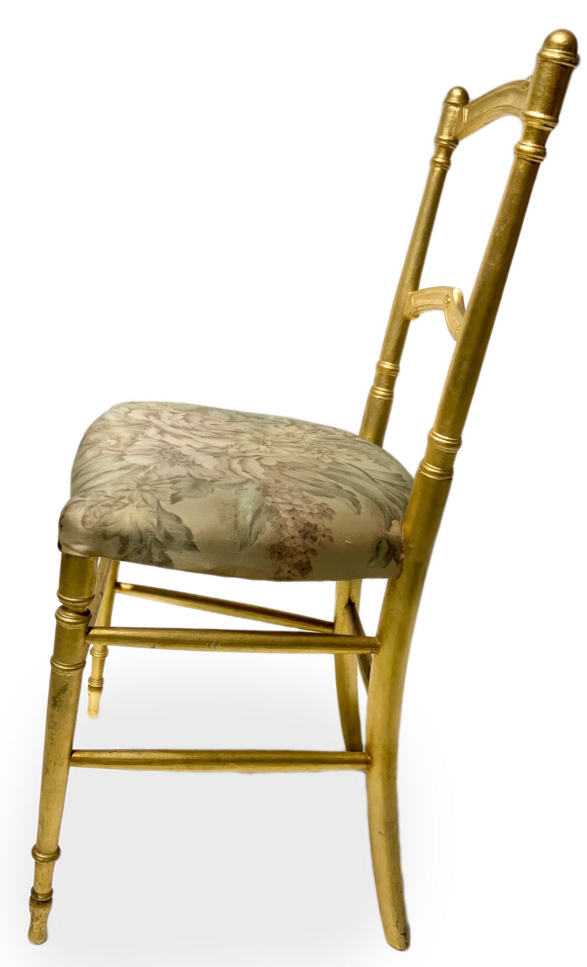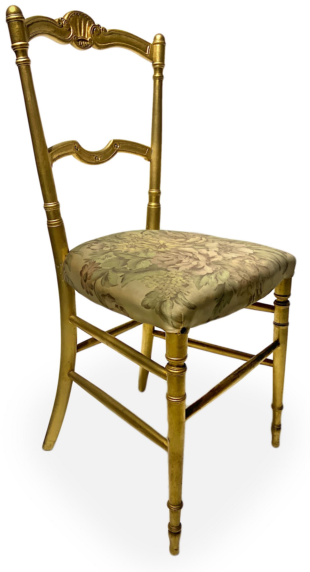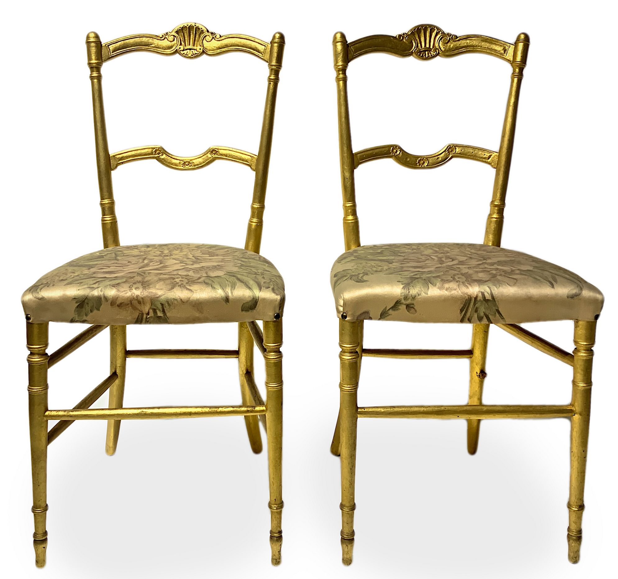 Coppia di sedie chiavarine in legno dorato, fine XIX secolo. Seduta in stoffa di seta. Mancanza di una barretta laterale in una sedia.