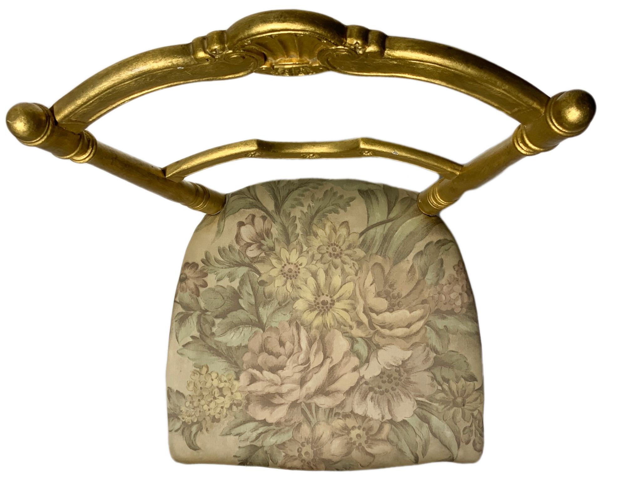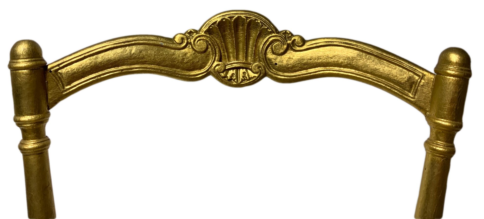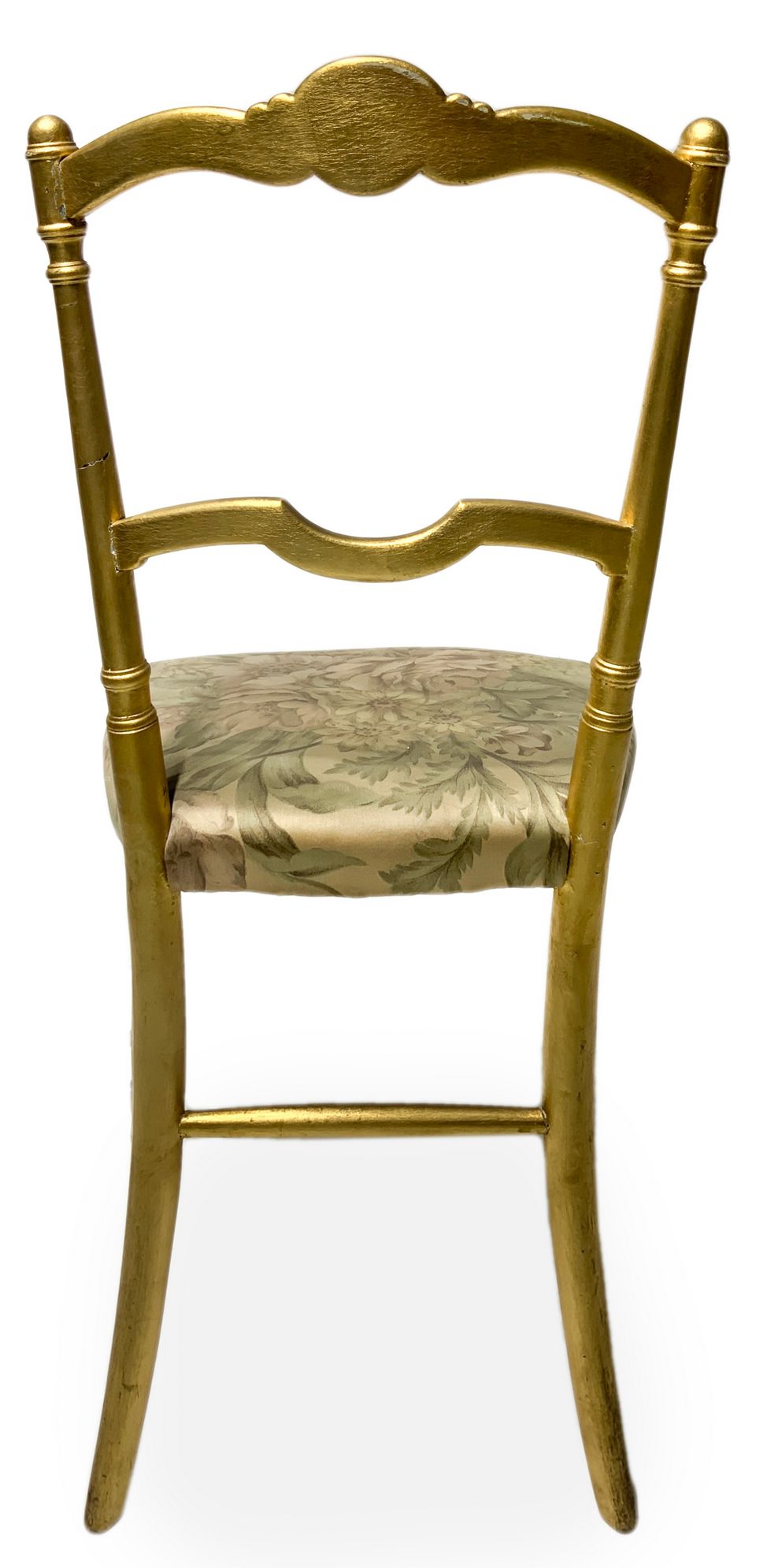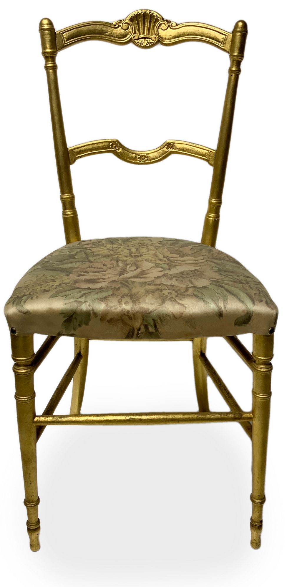 Coppia di sedie chiavarine in legno dorato, fine XIX secolo. Seduta in stoffa di seta. Mancanza di una barretta laterale in una sedia.