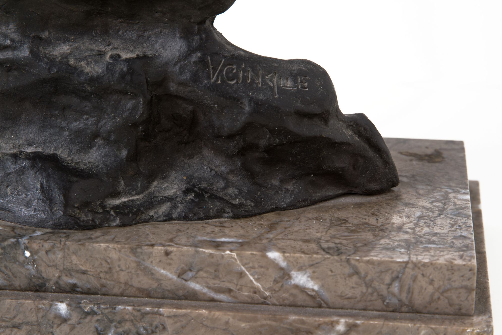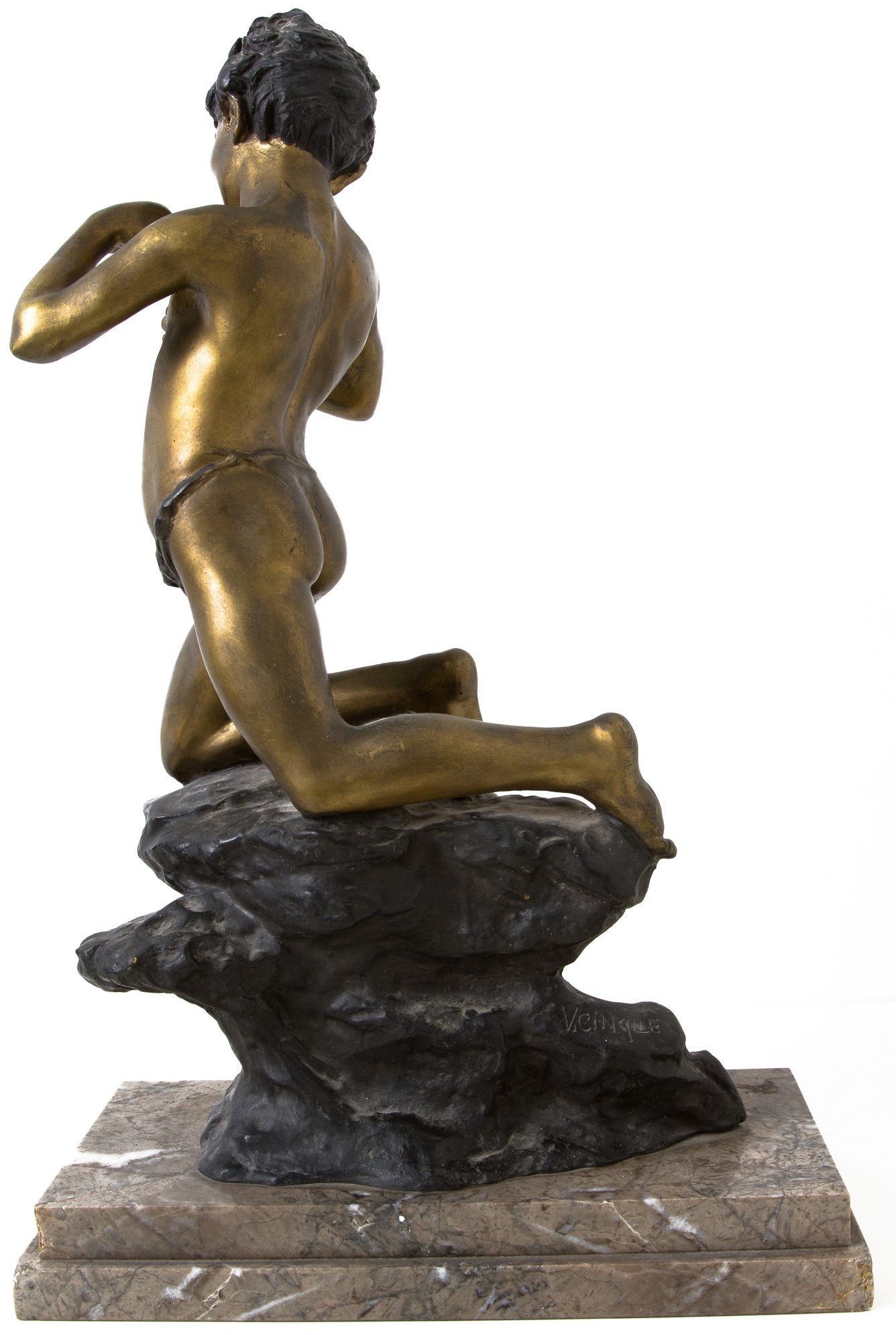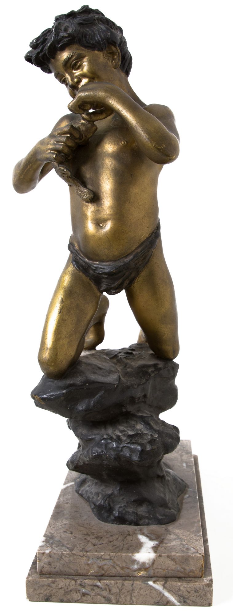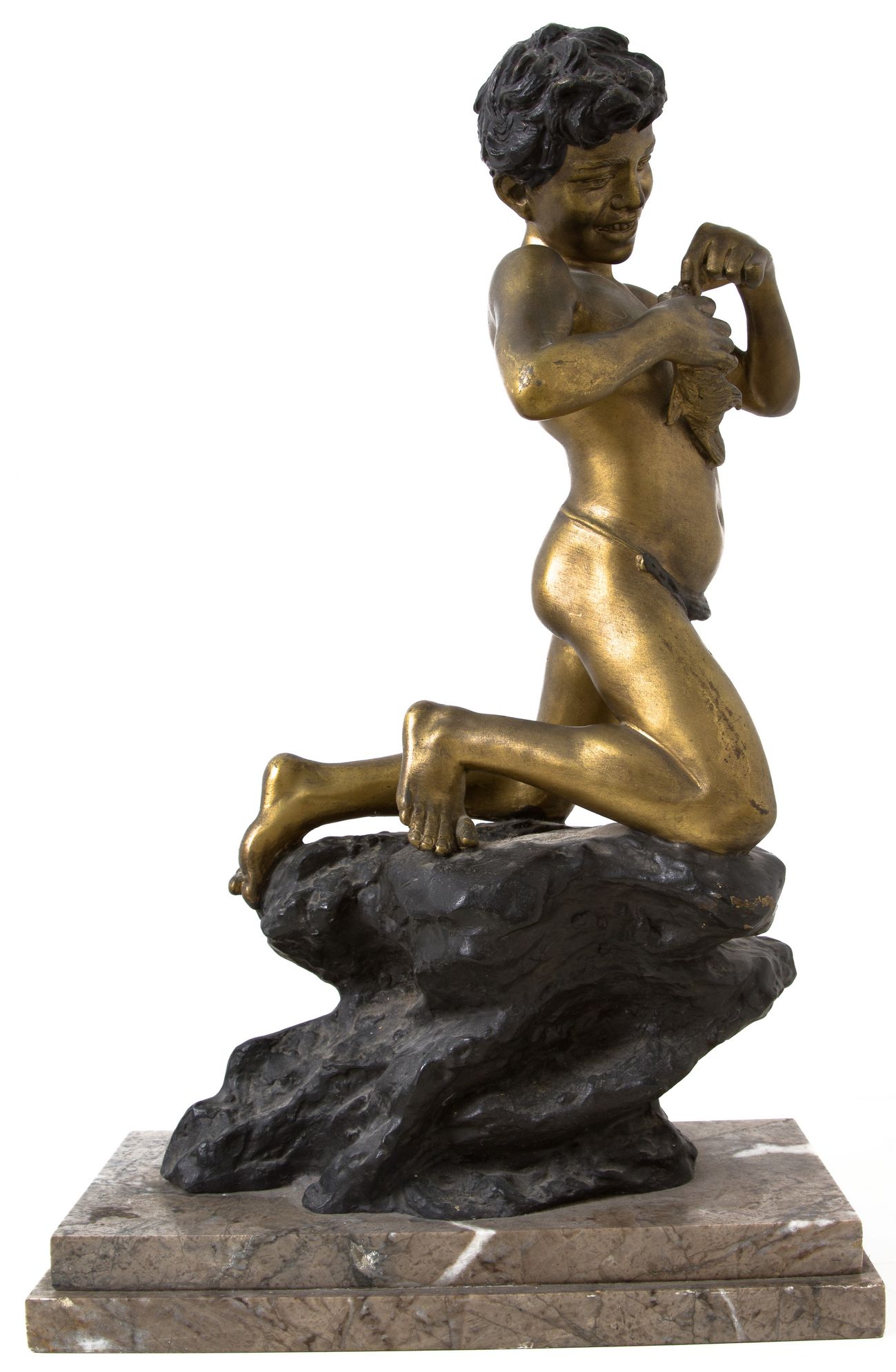 Bronzo patinato oro raffigurante scugnizzo napoletano con pesce. Base in marmo. H cm 48. Firmato V.5