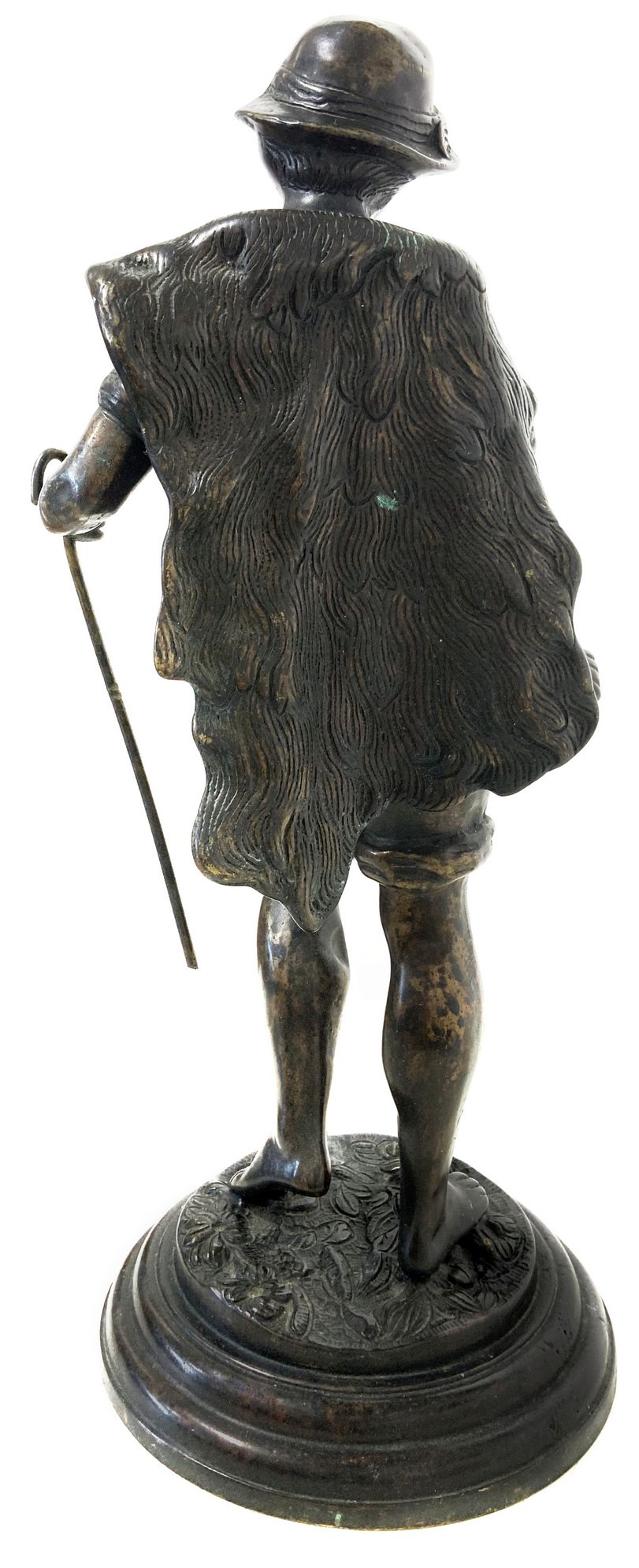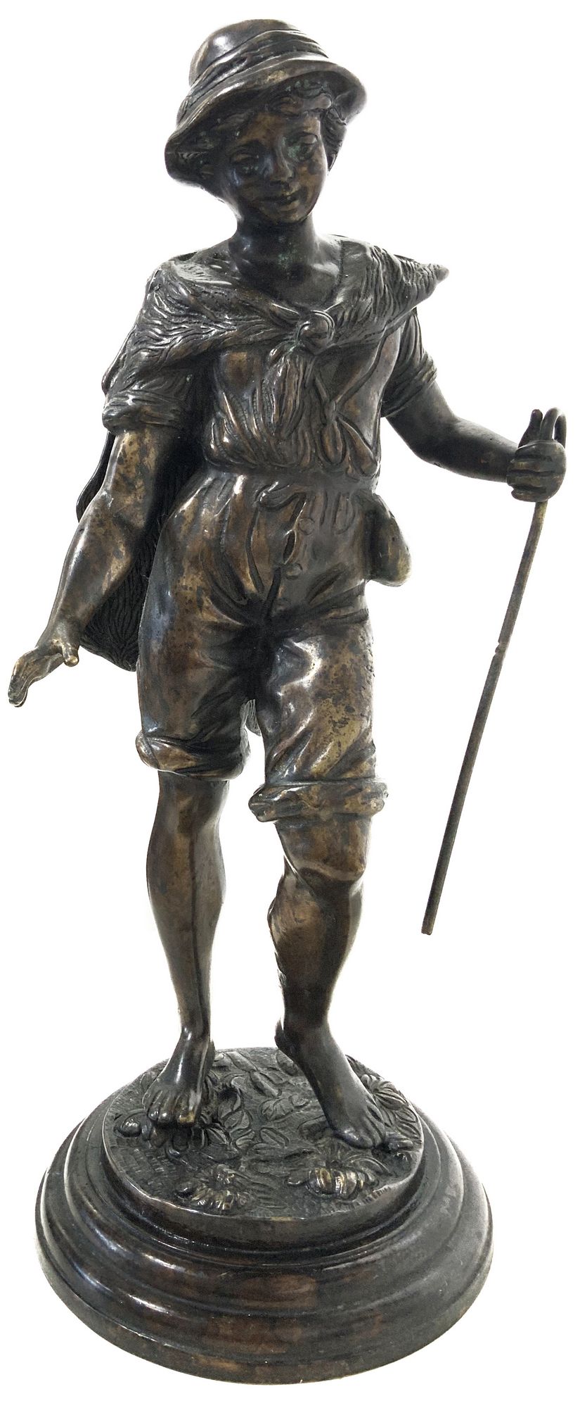 Bronzo patinato raffigurante giovane pastore con bastone, XIX Secolo. H cm 43