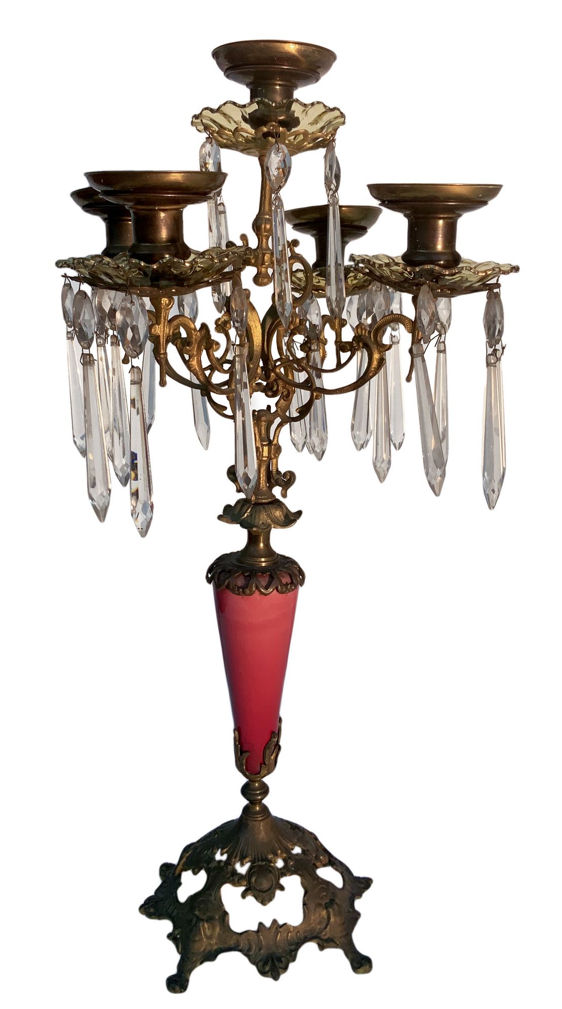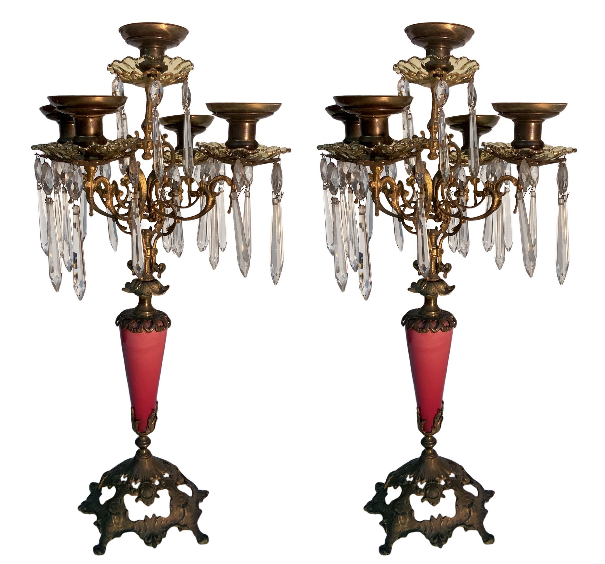 Coppia di candelieri a 5 luci in bronzo con brindoli a lacrima molati a mano,...
