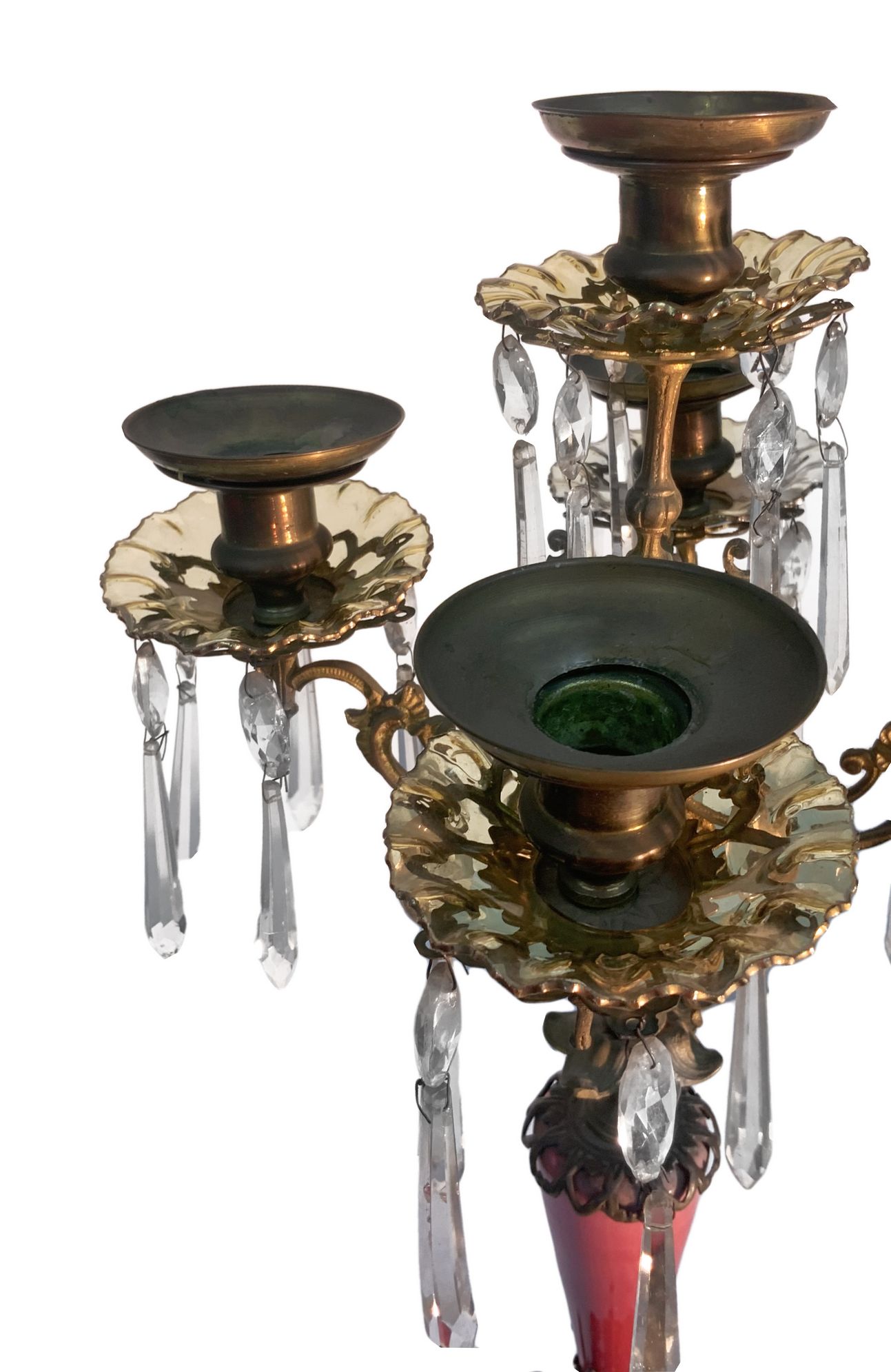 Coppia di candelieri a 5 luci in bronzo con brindoli a lacrima molati a mano, fine XVIII secolo. H cm 48. Mancante di un piattino in vetro.