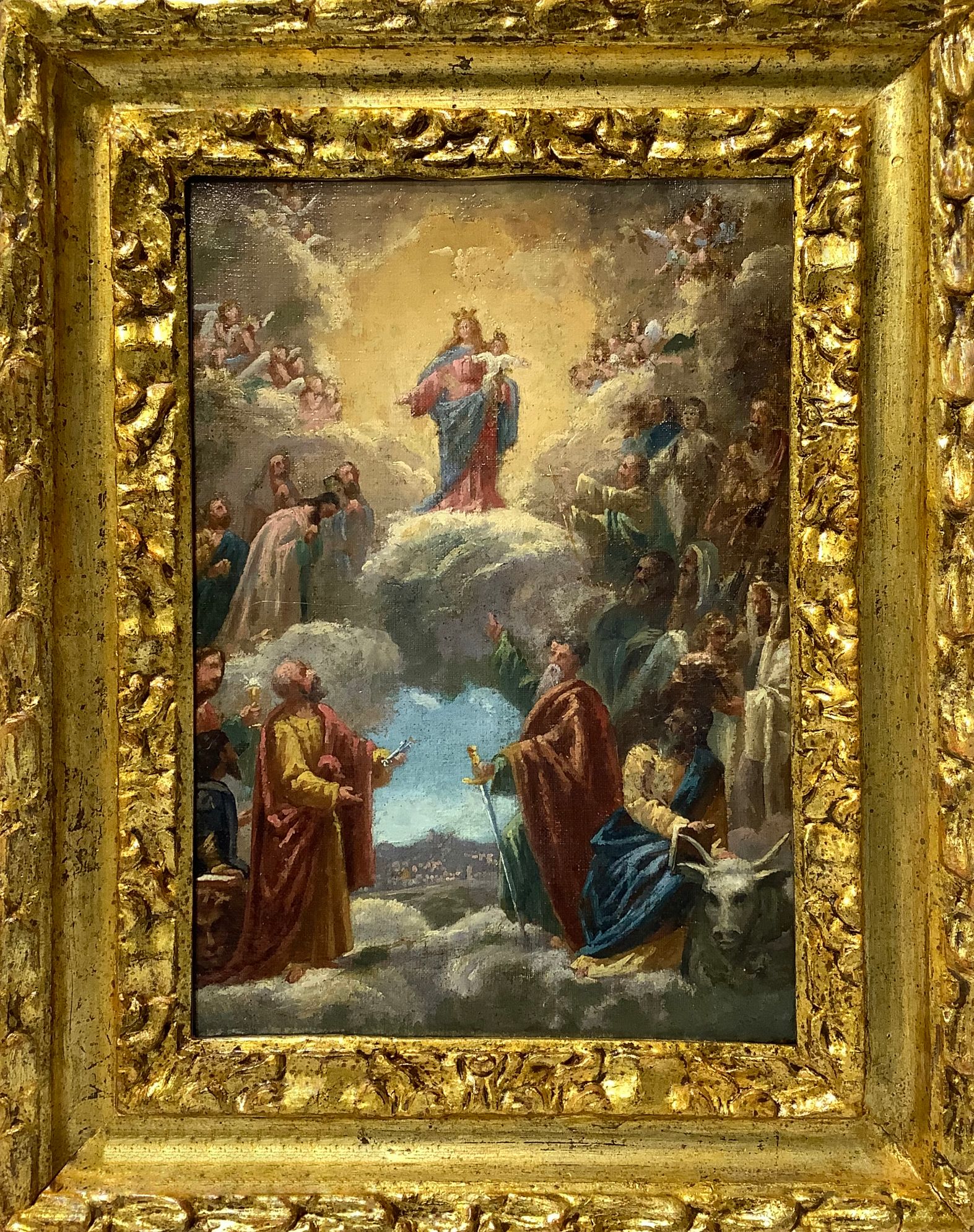 Dipinto ad olio su tela raffigurante celebrazione della Madonna in Cielo tra gli Angeli e i Santi, Tommaso Andrea Lorenzone (Pancalieri, 1824 – Torino, 1902). Bozzetto della pala che sita sull’Altare maggiore della Chiesa Santa Maria Ausiliatrice di Torino. Cm 42x32. In cornice di legno scolpito dorato 58x46.