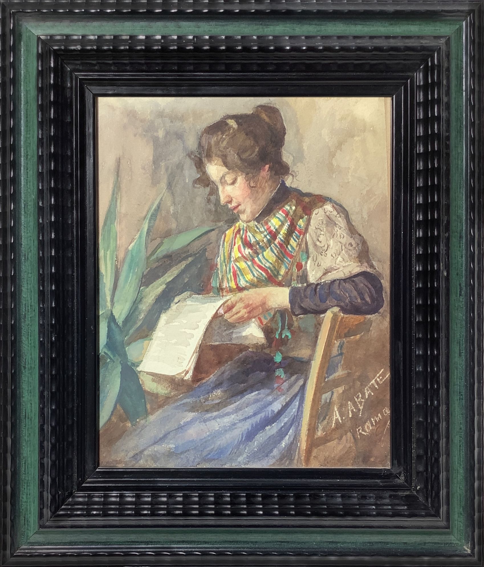 Gouache raffigurante giovane donna che legge. A. Abate (Roma, 1946 – Roma, 2012). Cm 21x17, in cornice cm 32x29. Guache su cartoncino. Firmata in basso a destra Abate Roma.
