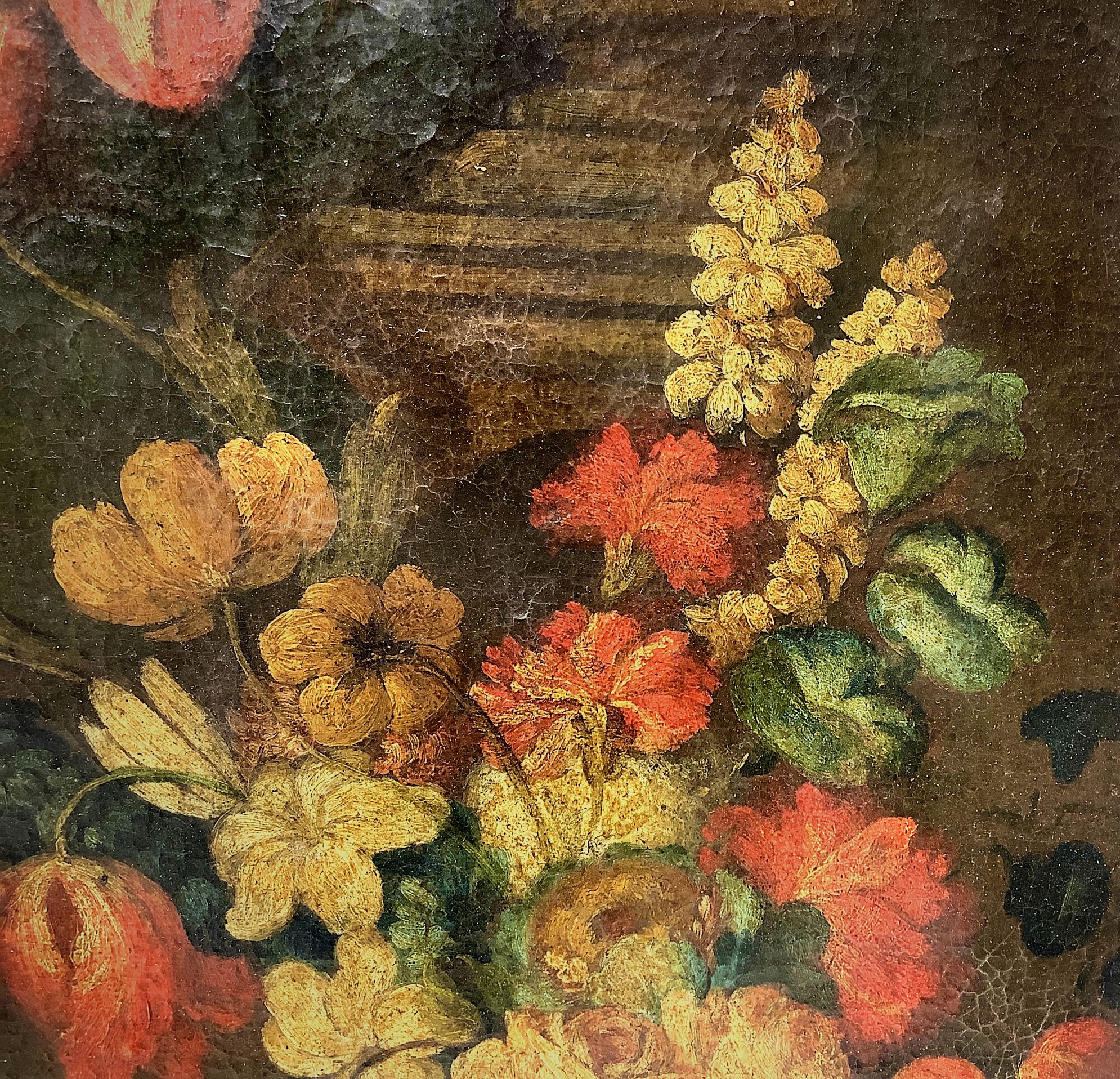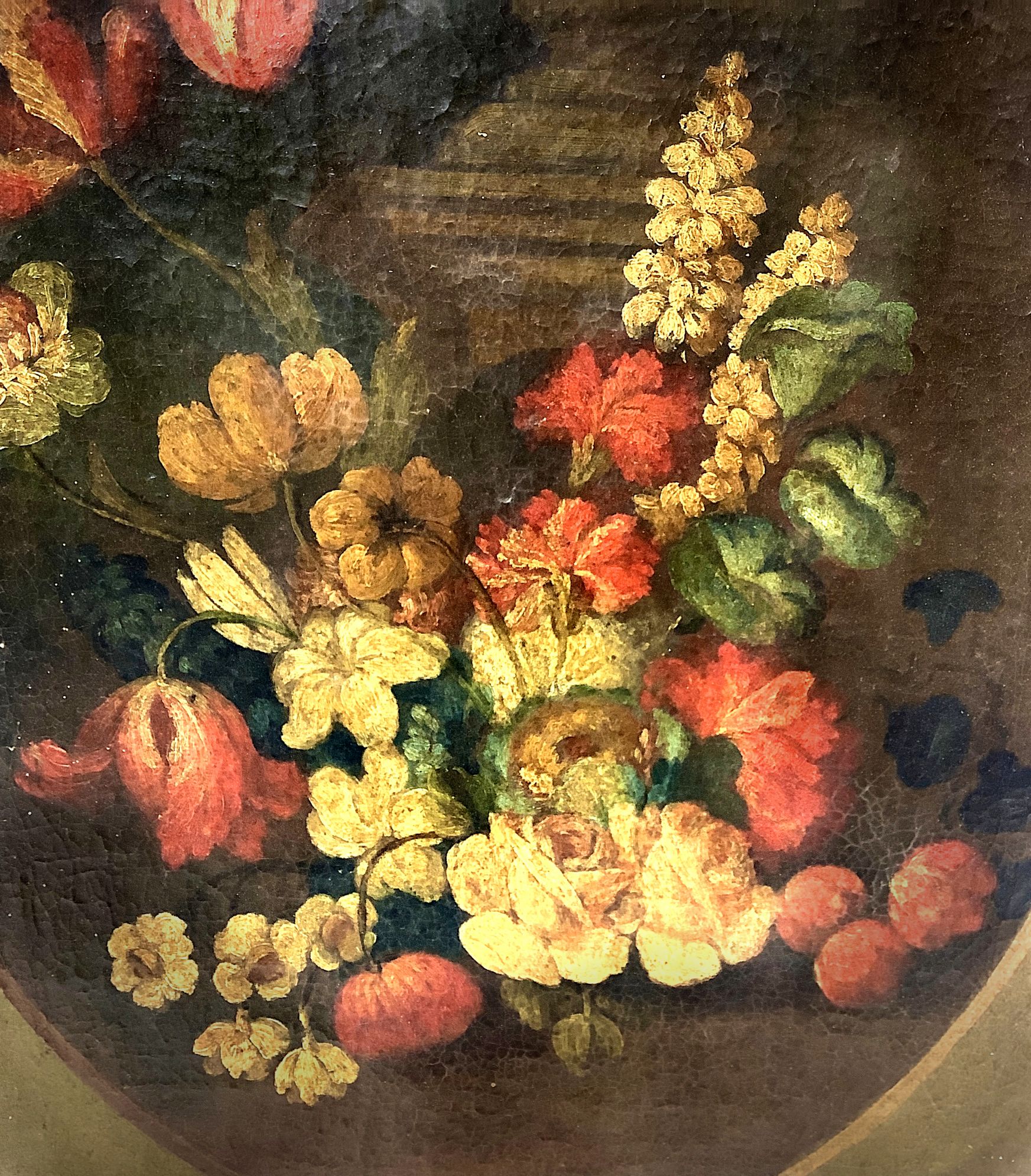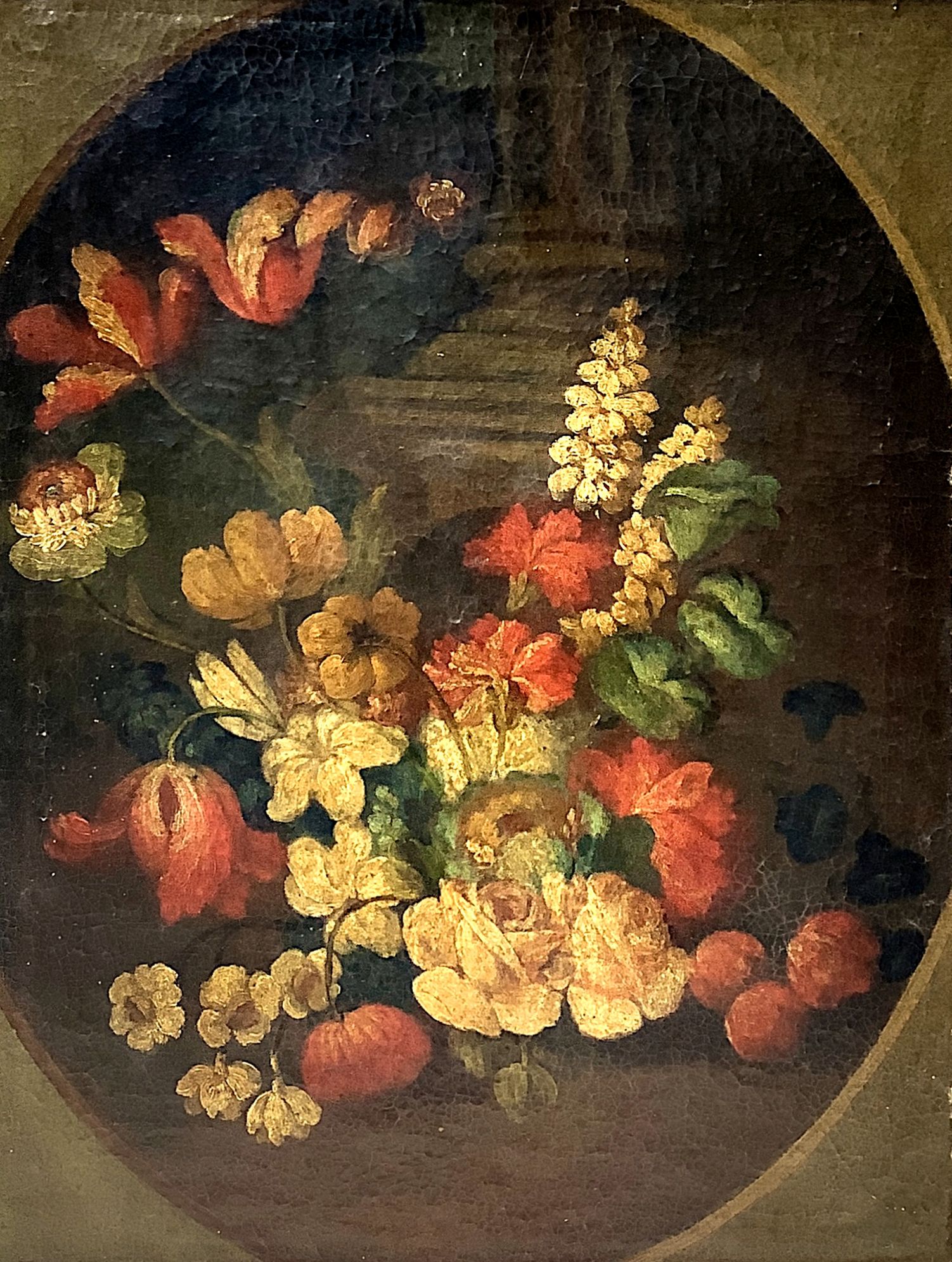 Olio su tela raffigurante natura morta di fiori, XVII-XVIII Secolo. Cm 50x36, olio su tela applicata su tavola.
