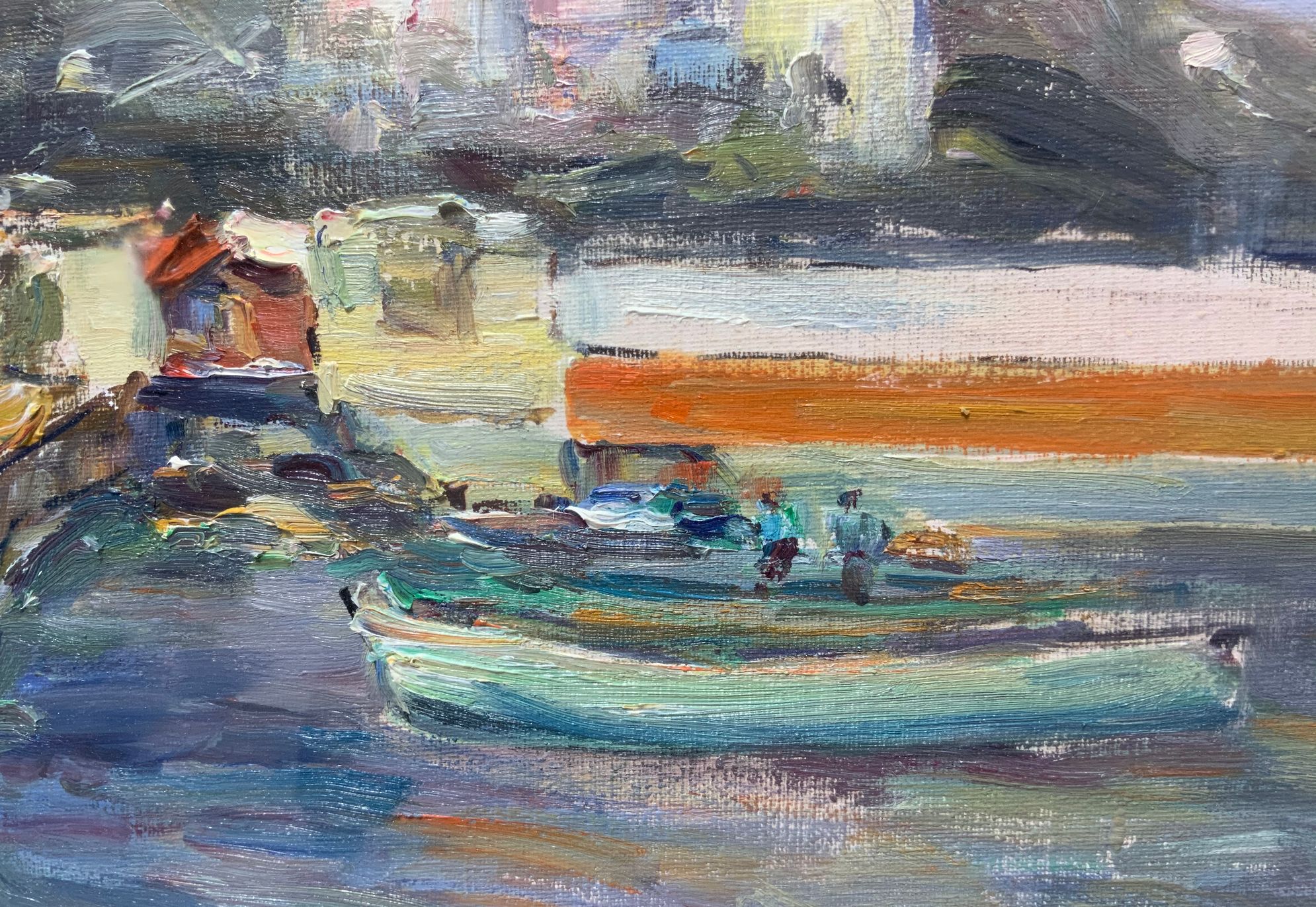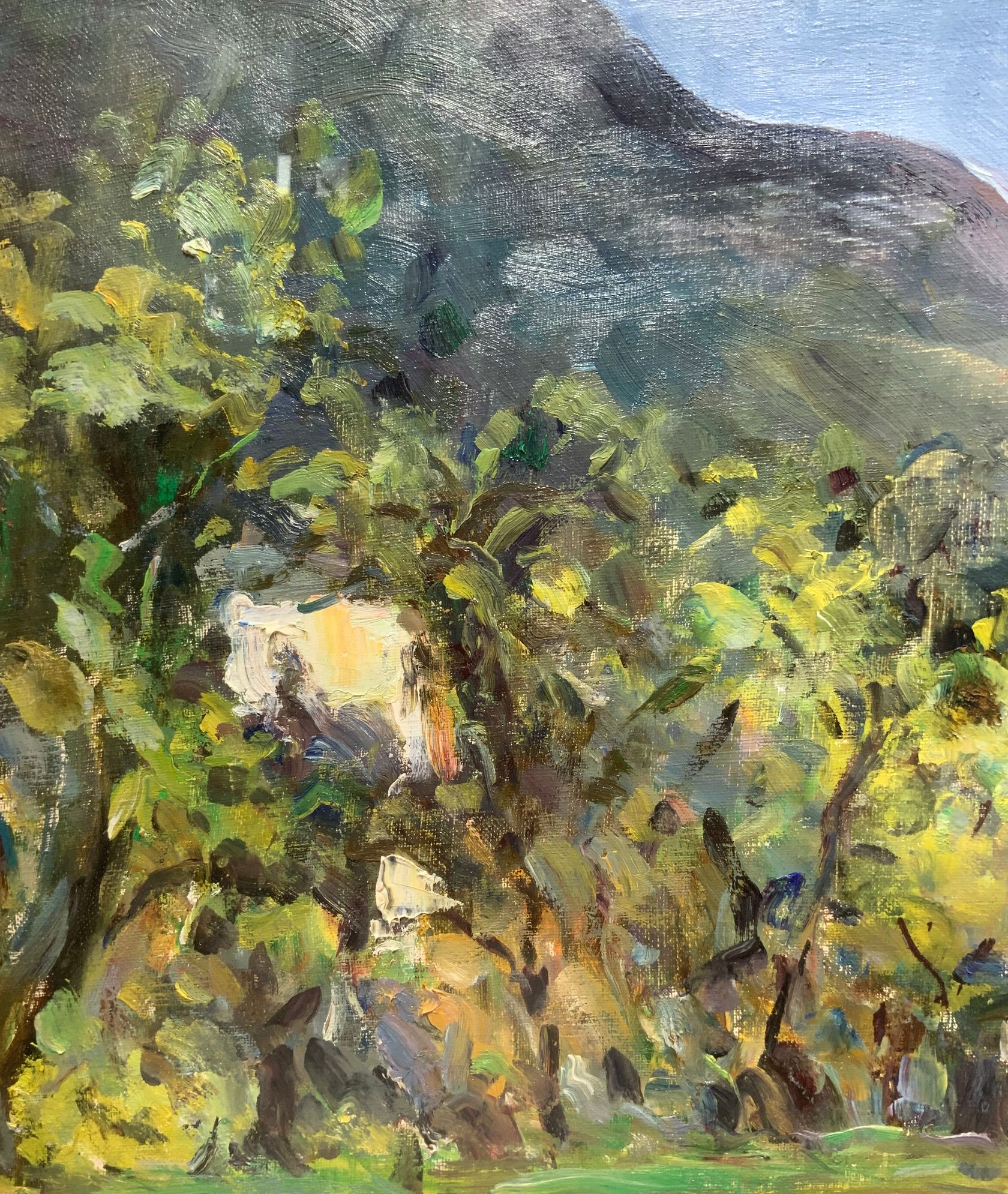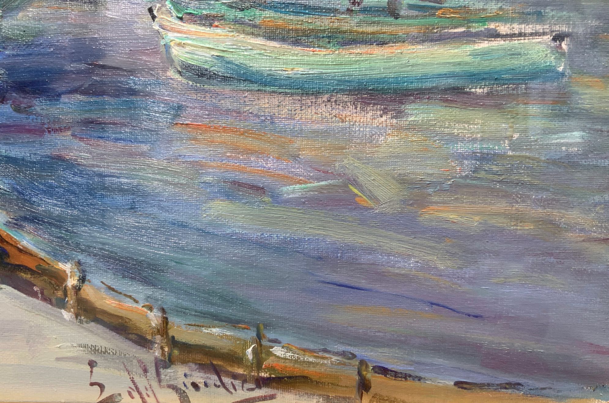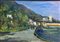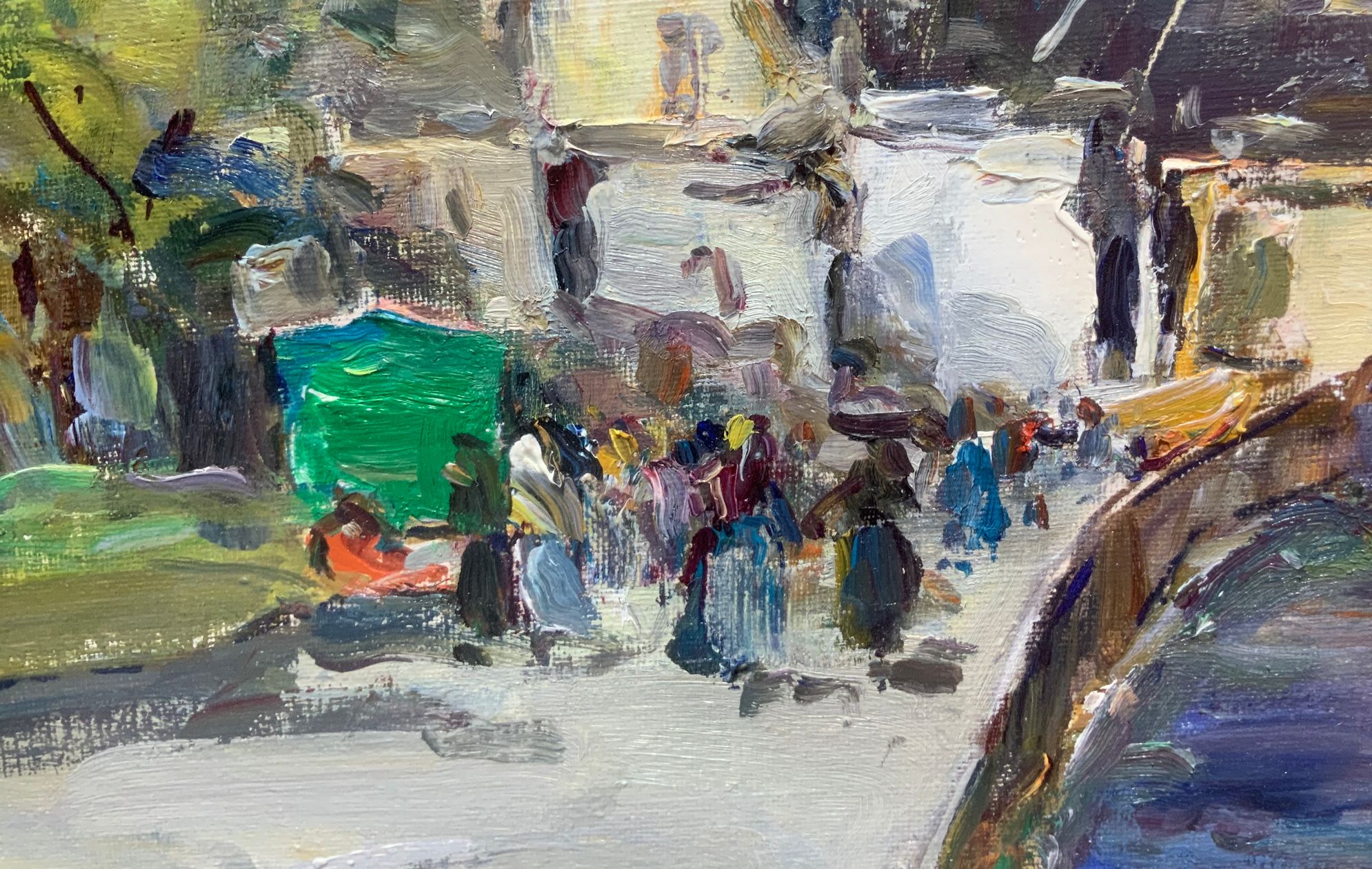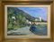 Dipinto ad olio su tela raffigurante viale sul mare, Elvira Del Giudice. Cm 48x69. Firmato in basso a destra.