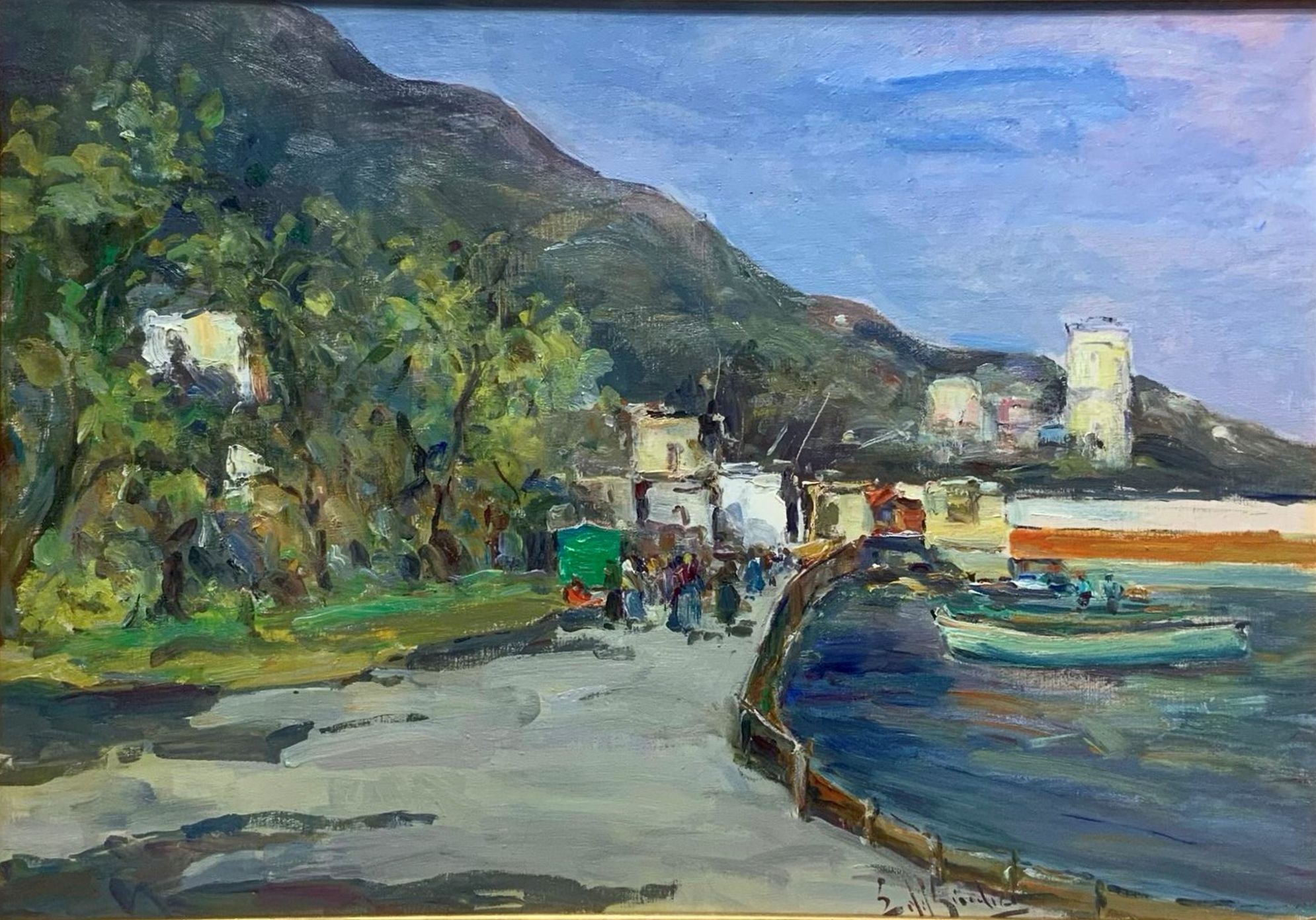 Dipinto ad olio su tela raffigurante viale sul mare, Elvira Del Giudice. Cm...