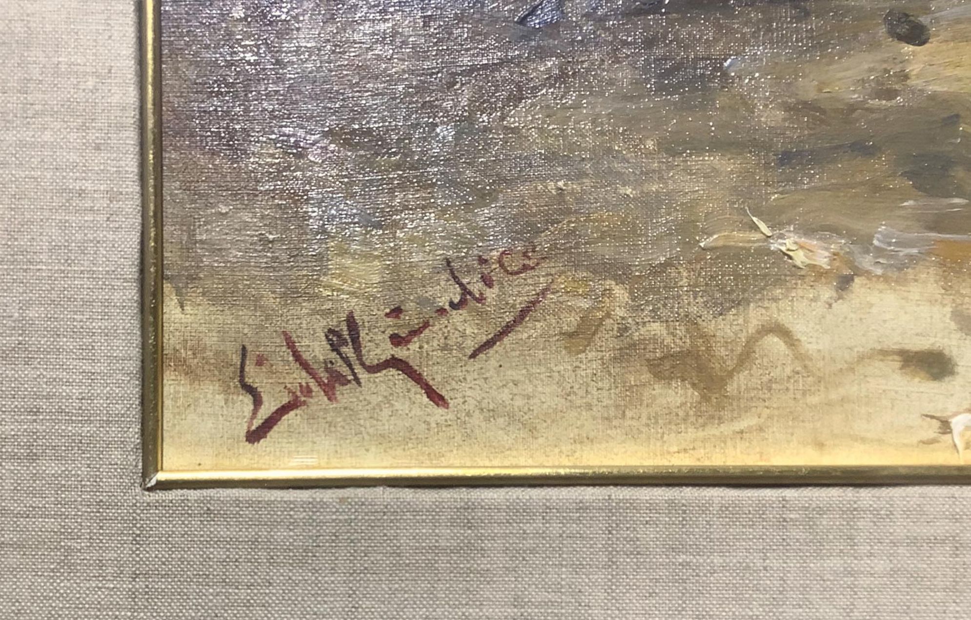 Dipinto ad olio su cartone telato raffigurante borgo, Elvira Del Giudice. Cm...