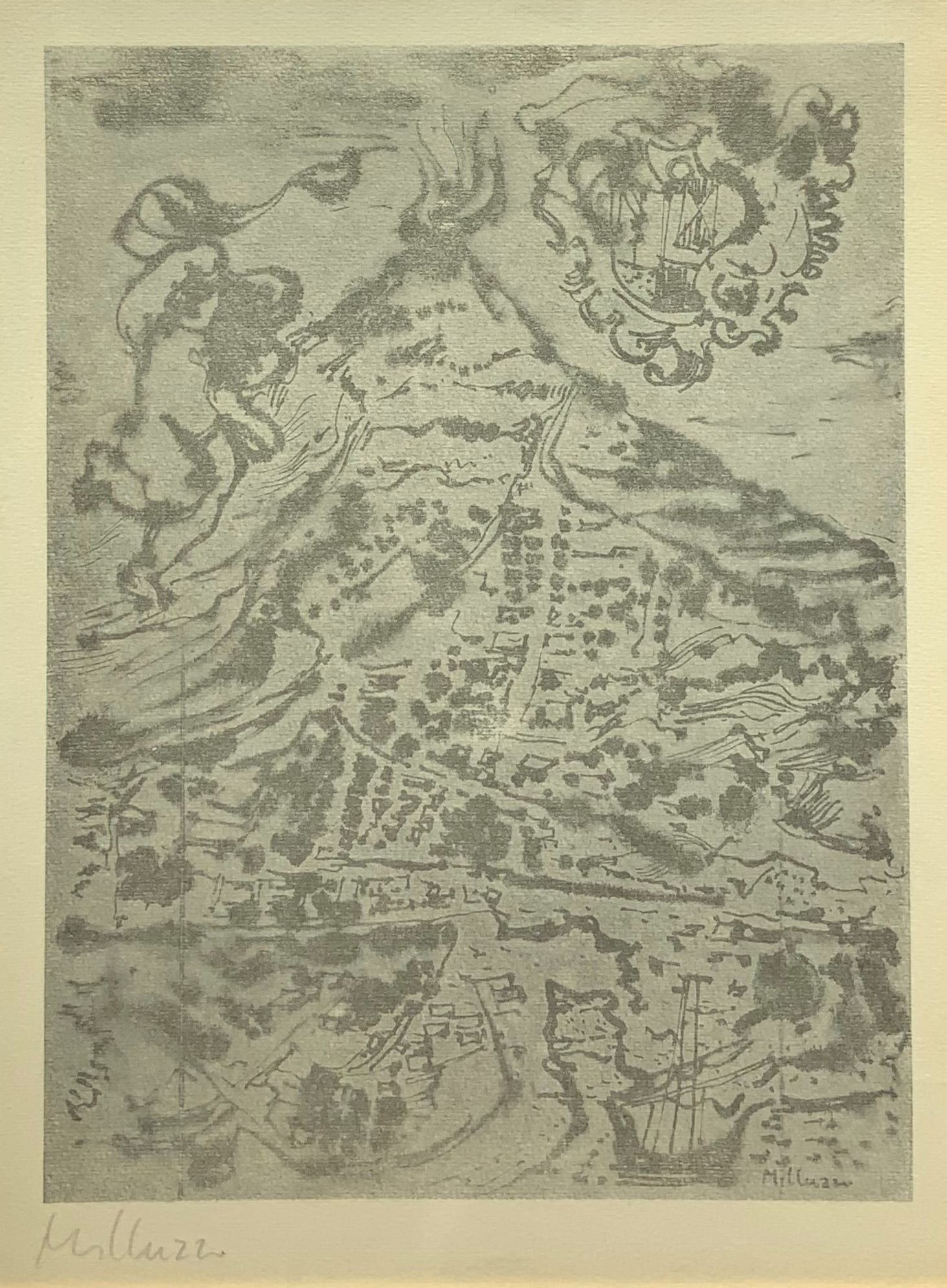 Stampa raffigurante Etna su Catania, Sebastiano Milluzzo (Catania, 1915 – Catania,2011). Cm 34 x24. In cornice cm 48x38.
