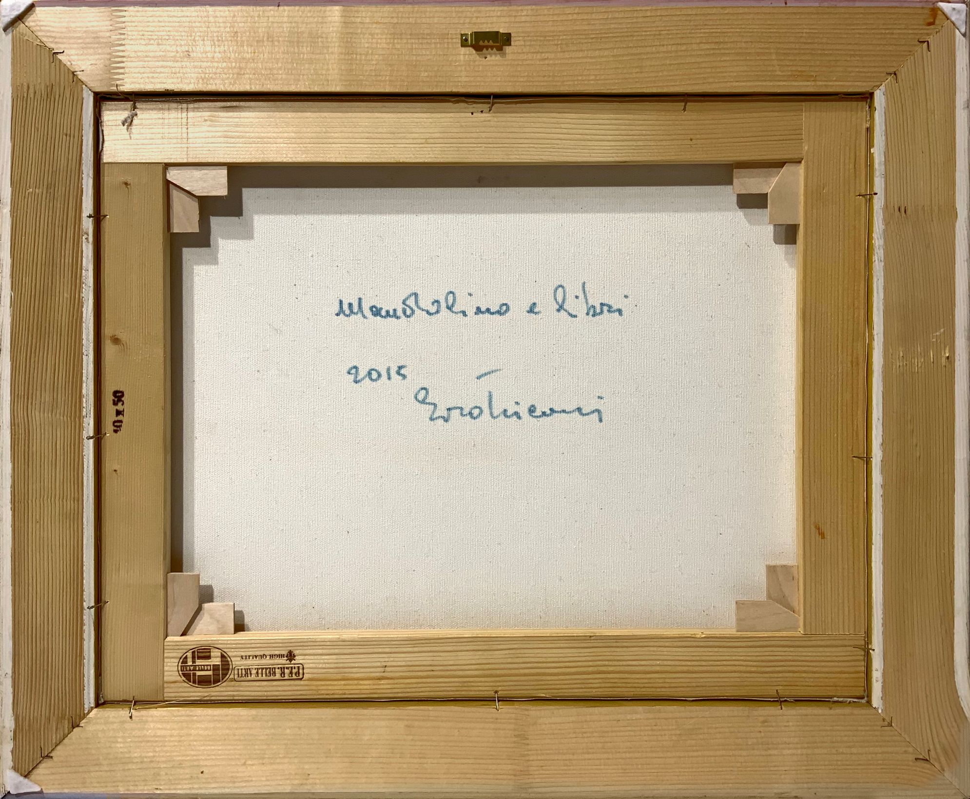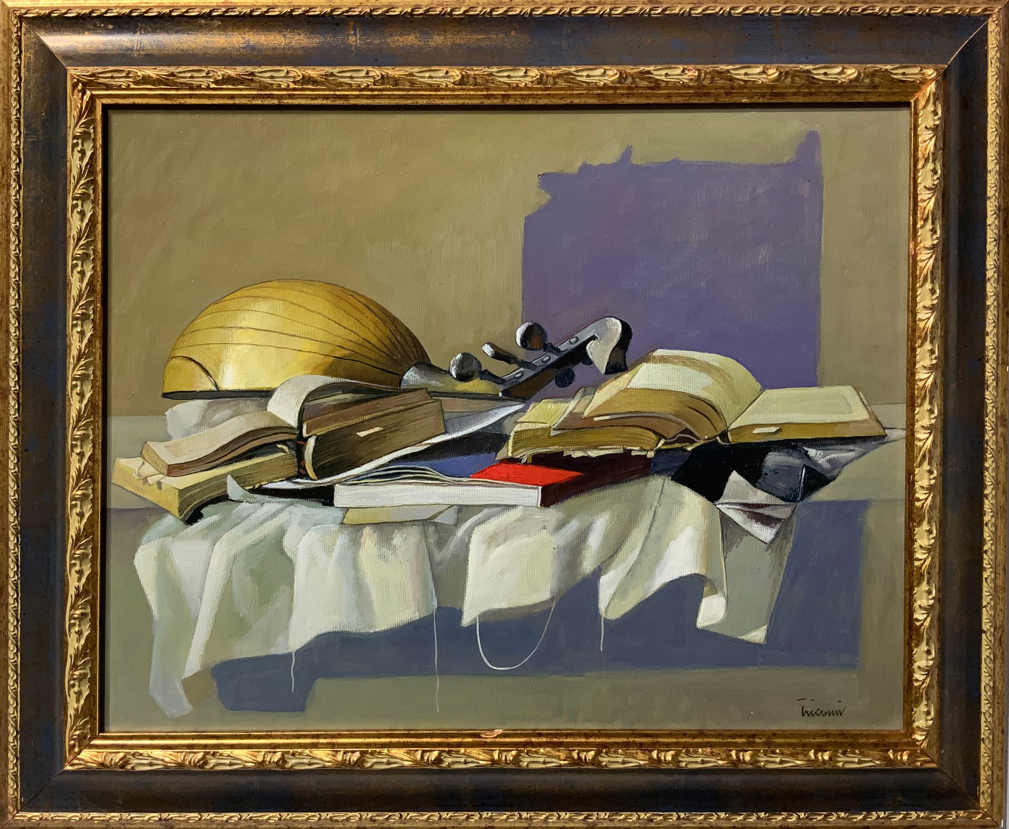 Dipinto ad olio su tela raffigurante mandolino e spartiti, Saro Tricomi (Catania, 1937). Cm 40x50. Firmato in basso a destra. Datato 2015 e firmato sul retro.