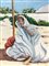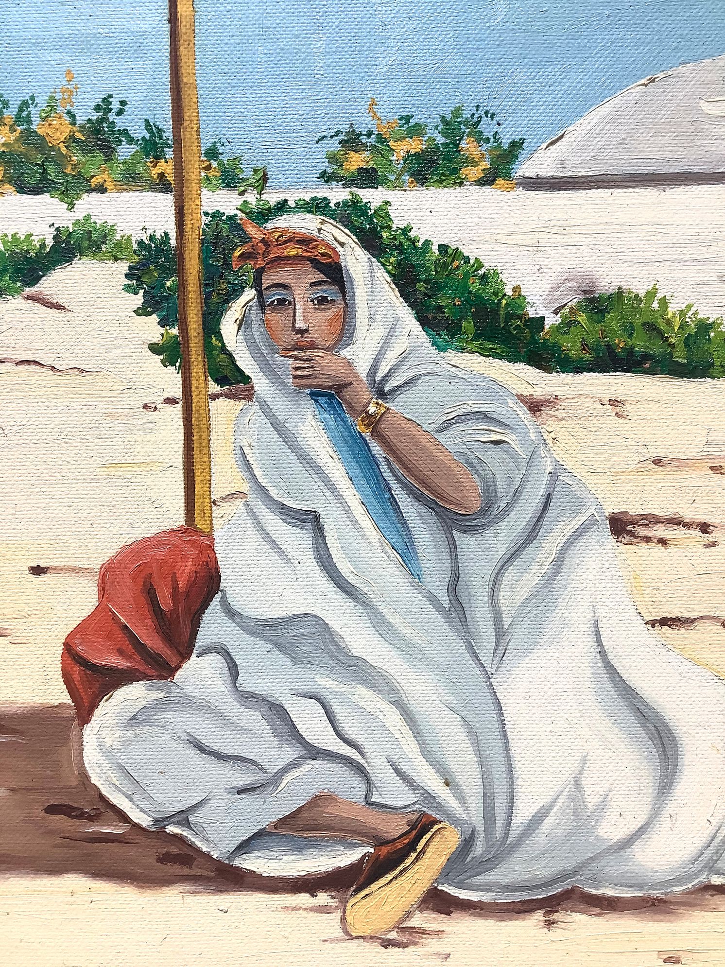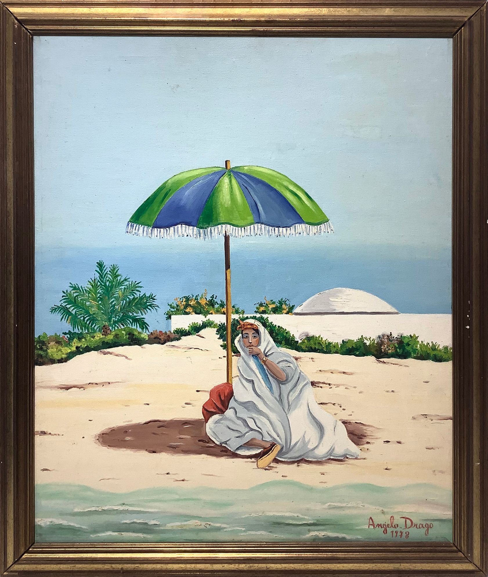Dipinto naif ad olio su tela raffigurante donna araba sulla spiaggia, Drago...
