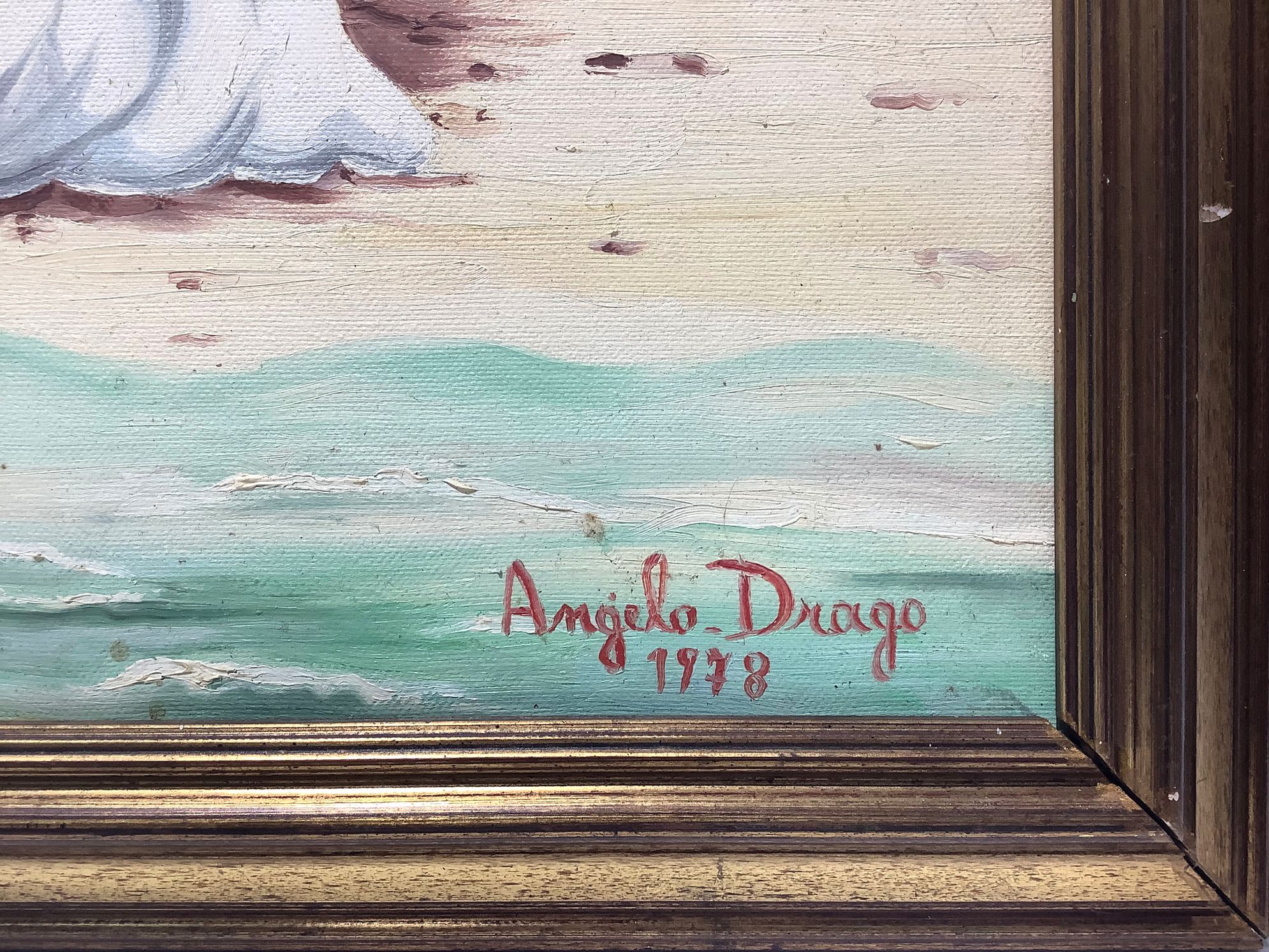 Dipinto naif ad olio su tela raffigurante donna araba sulla spiaggia, Drago Angelo (Catania 1930- Catania 2020). Angelo Drago vince il Premio Leone d'oro a Firenze 1979, 1° Premio internazionale Occasionart , Milano ai frati "Naif". Bibiliografia: "I naifs italiani", Mario De Micheli, Renzo Margonari, Ed. Passera e Agosta Tota, prefazione di Cesare Zavattini pg 156. Catalogo Bolaffi dei Natif Italiani, Giulio Bolaffi Editore 1973, pg 60. Cm 60x50. Misure con la cornice cm 68x59. Firmato e datato in basso a destra. Accademia tiberina unione della Legion d’oro. Opera esposta a Roma nella Sala di Via del Fiume.