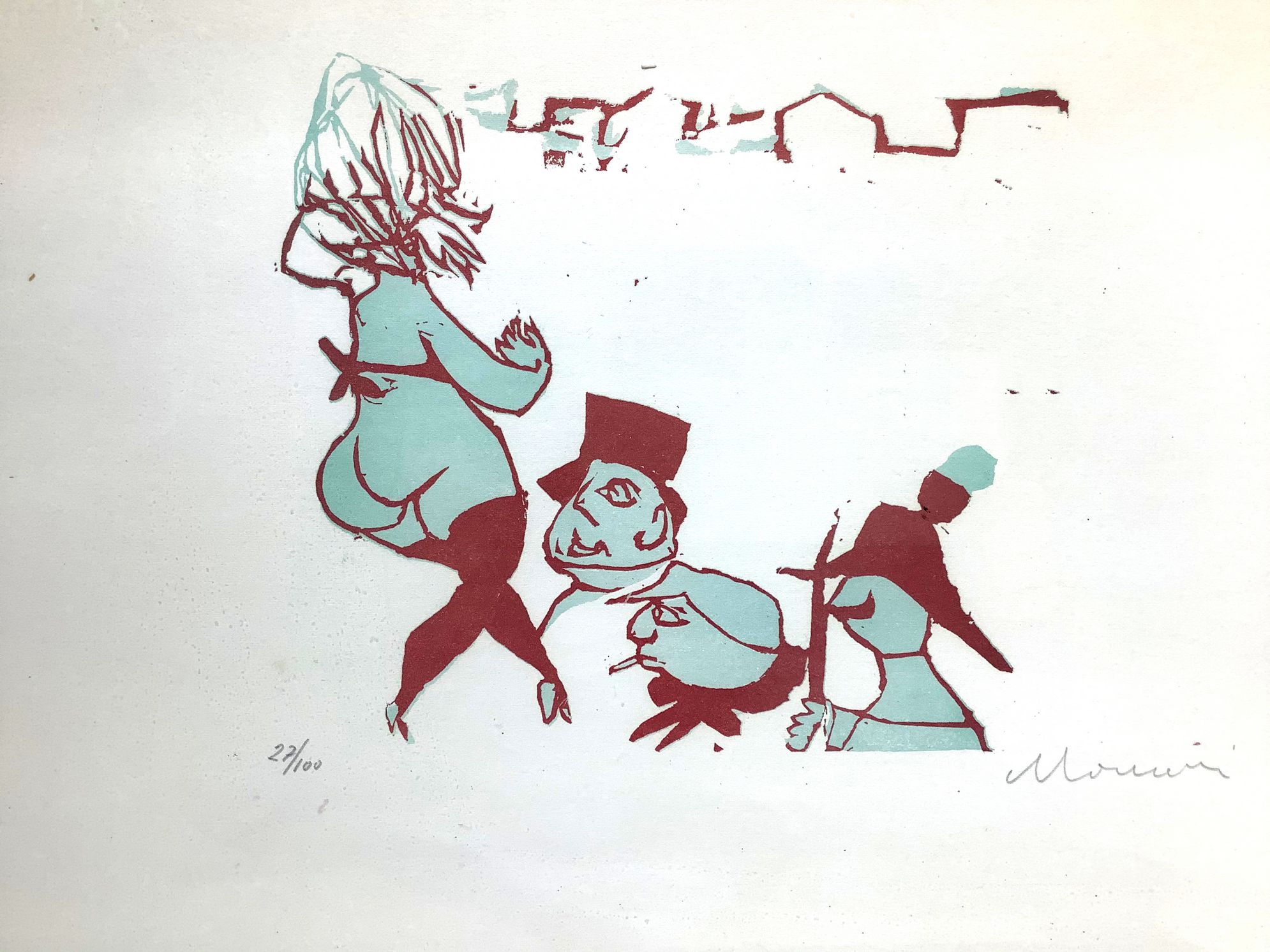 Litografia raffigurante scena amorosa, Mino Maccari (Siena,1898 – Roma,1989),...