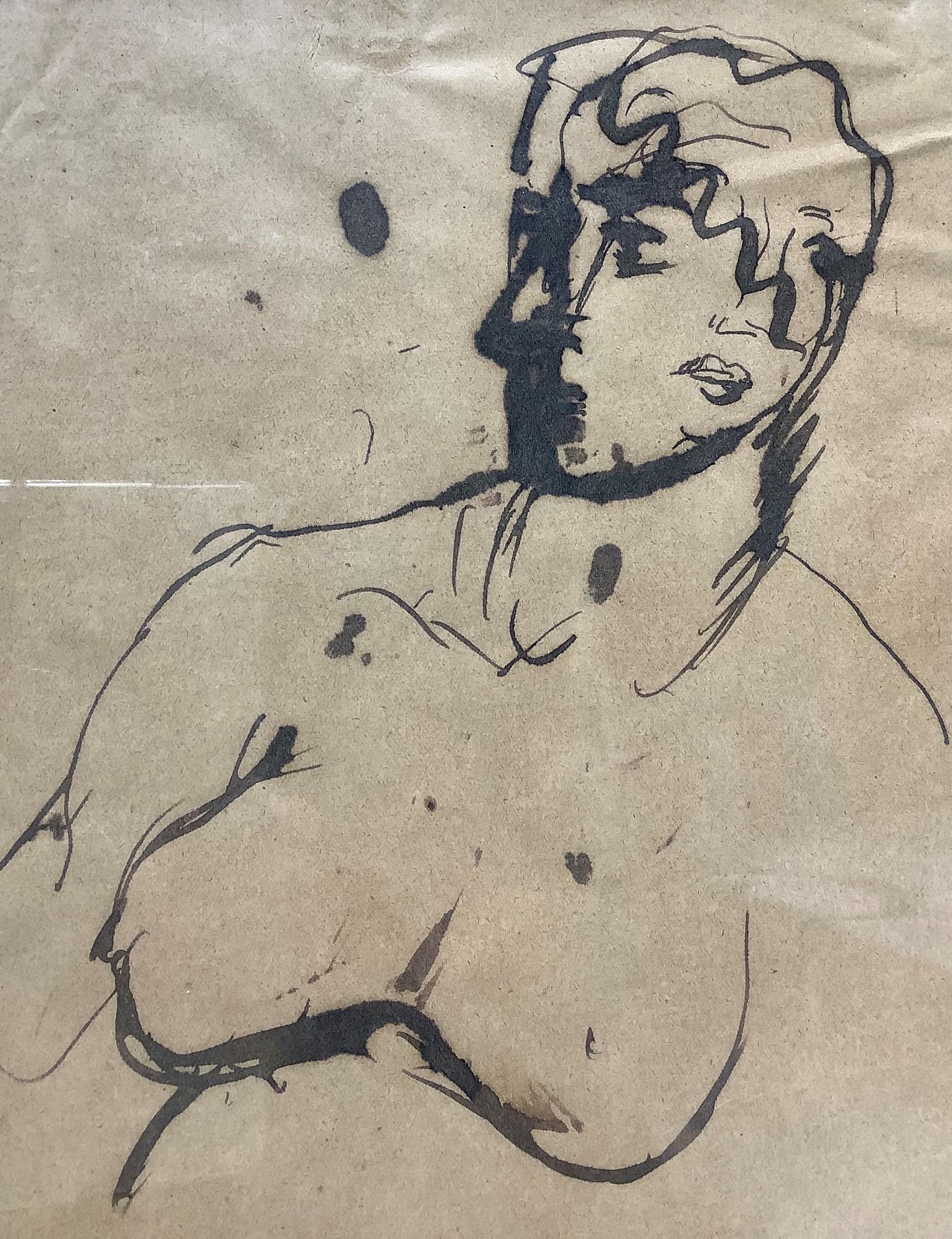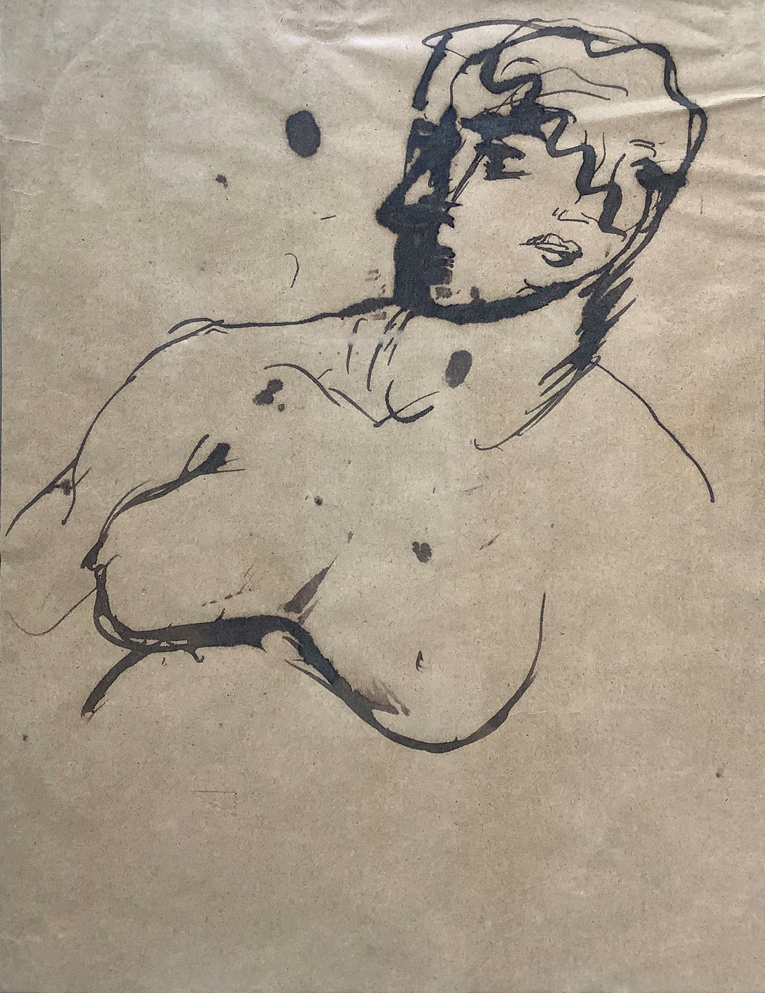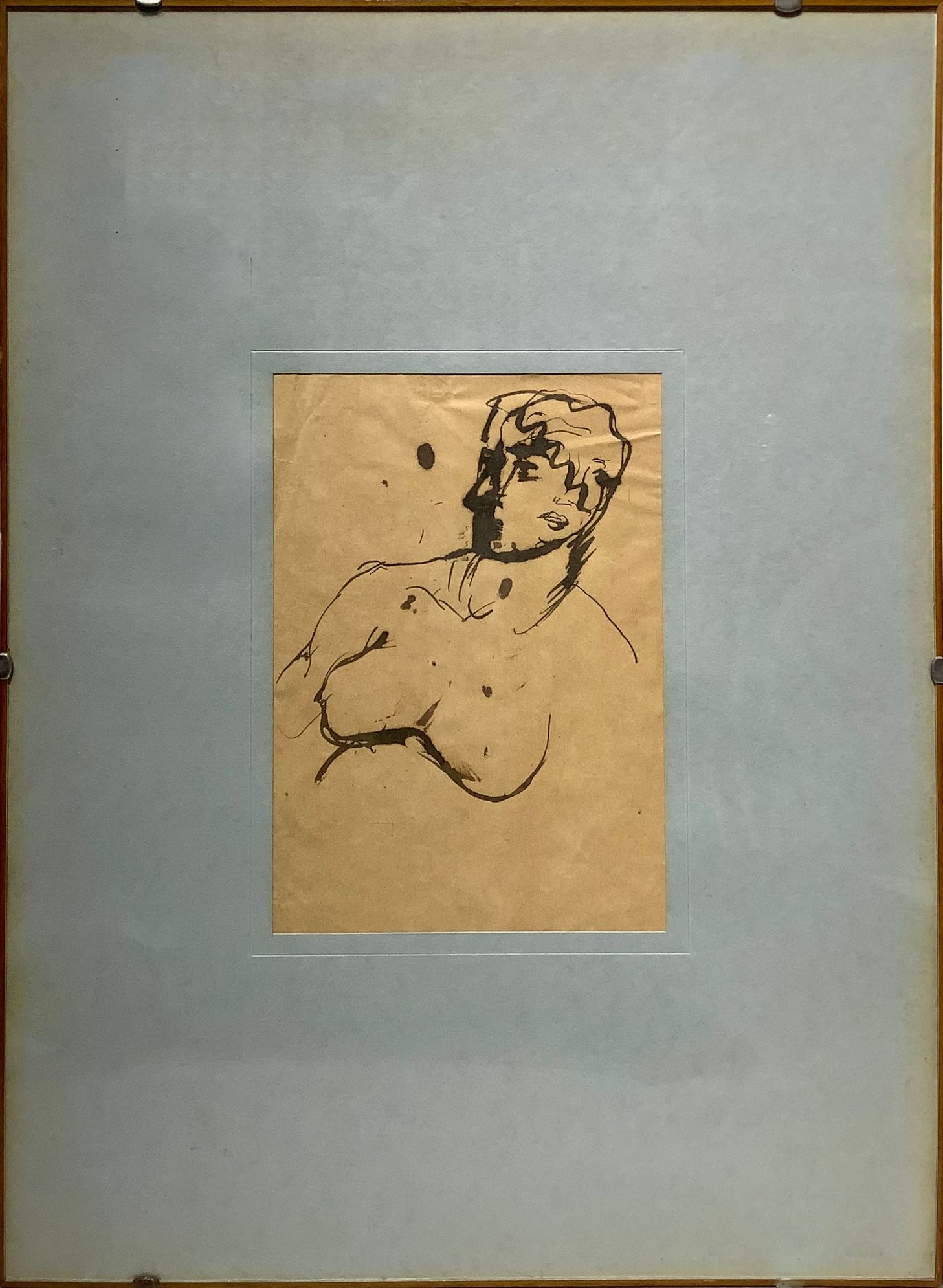 Disegno a china su carta raffigurante donna con penna. Firmato in alto a destra Capogrossi. Cm 31x23.