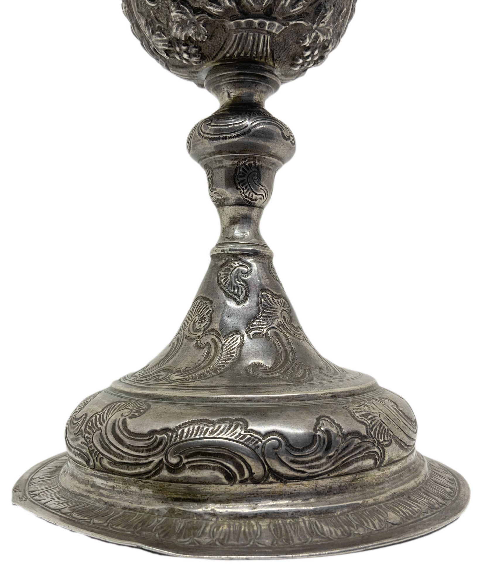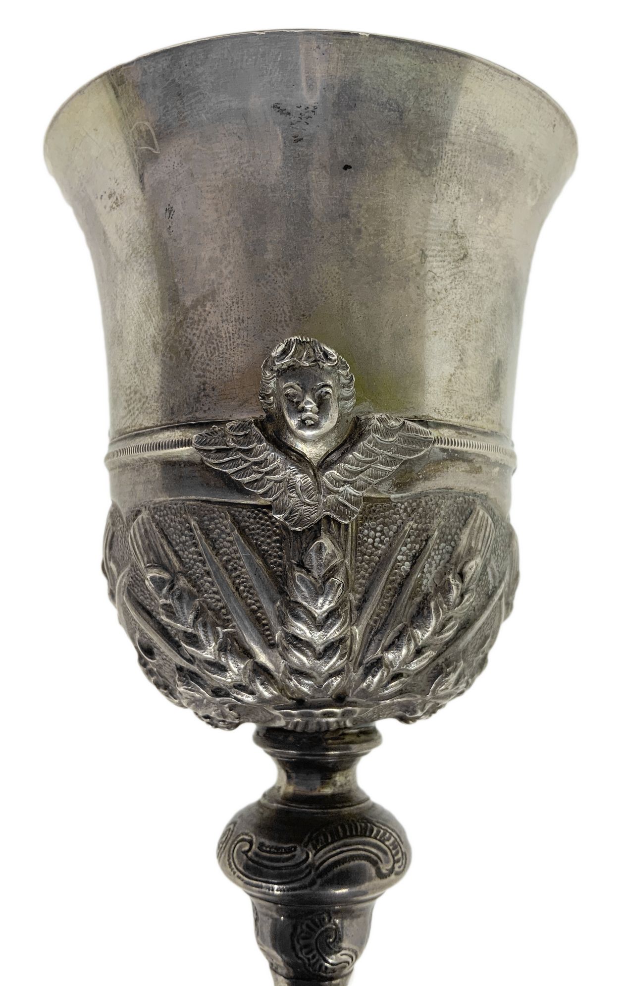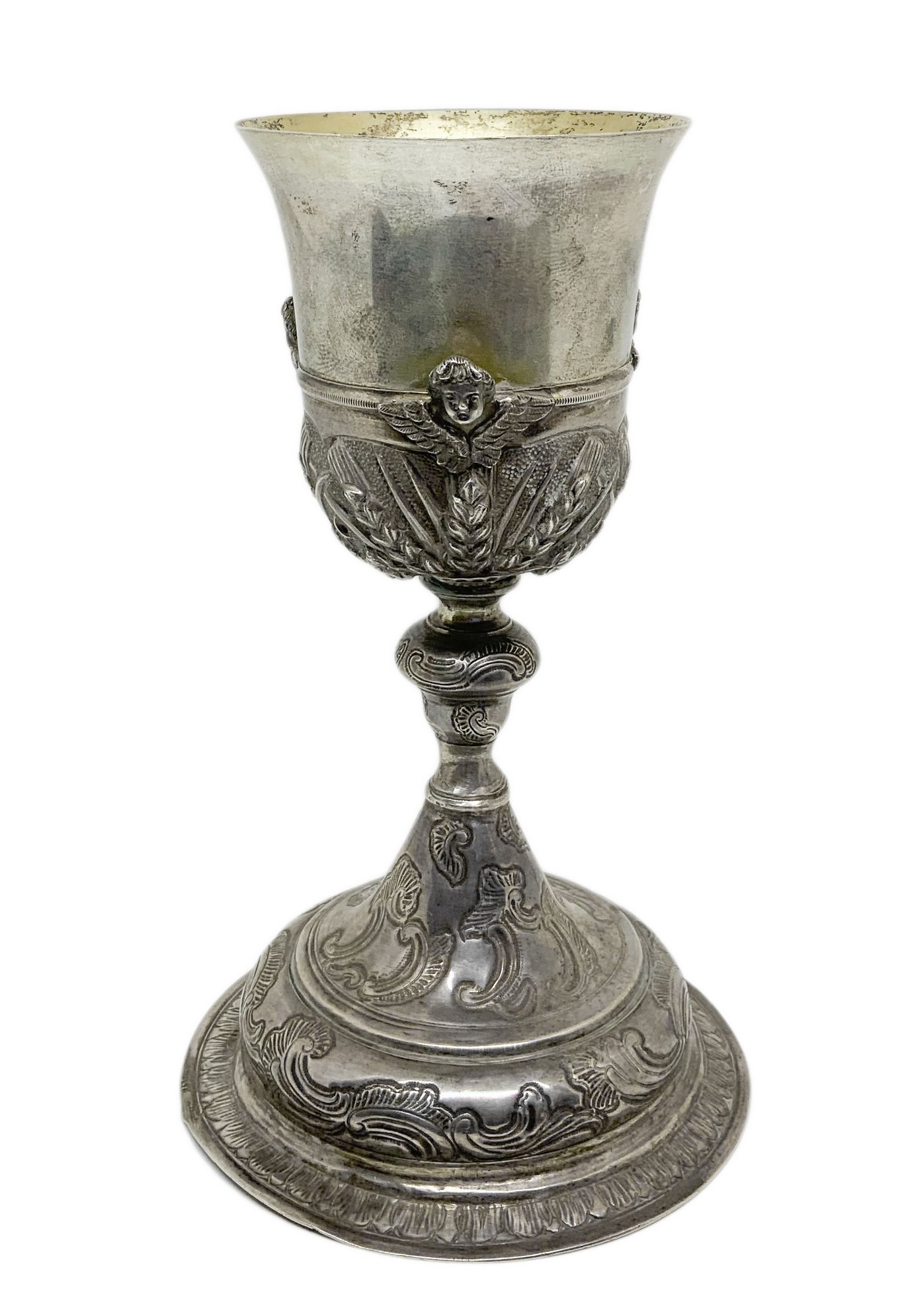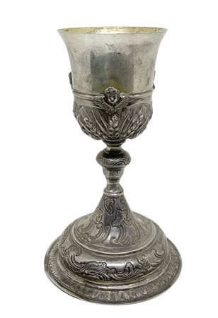Calice in argento cesellato e sbalzato con cherubini. Punzone alla base e saggio del Console. XVIII secolo. H cm 19.