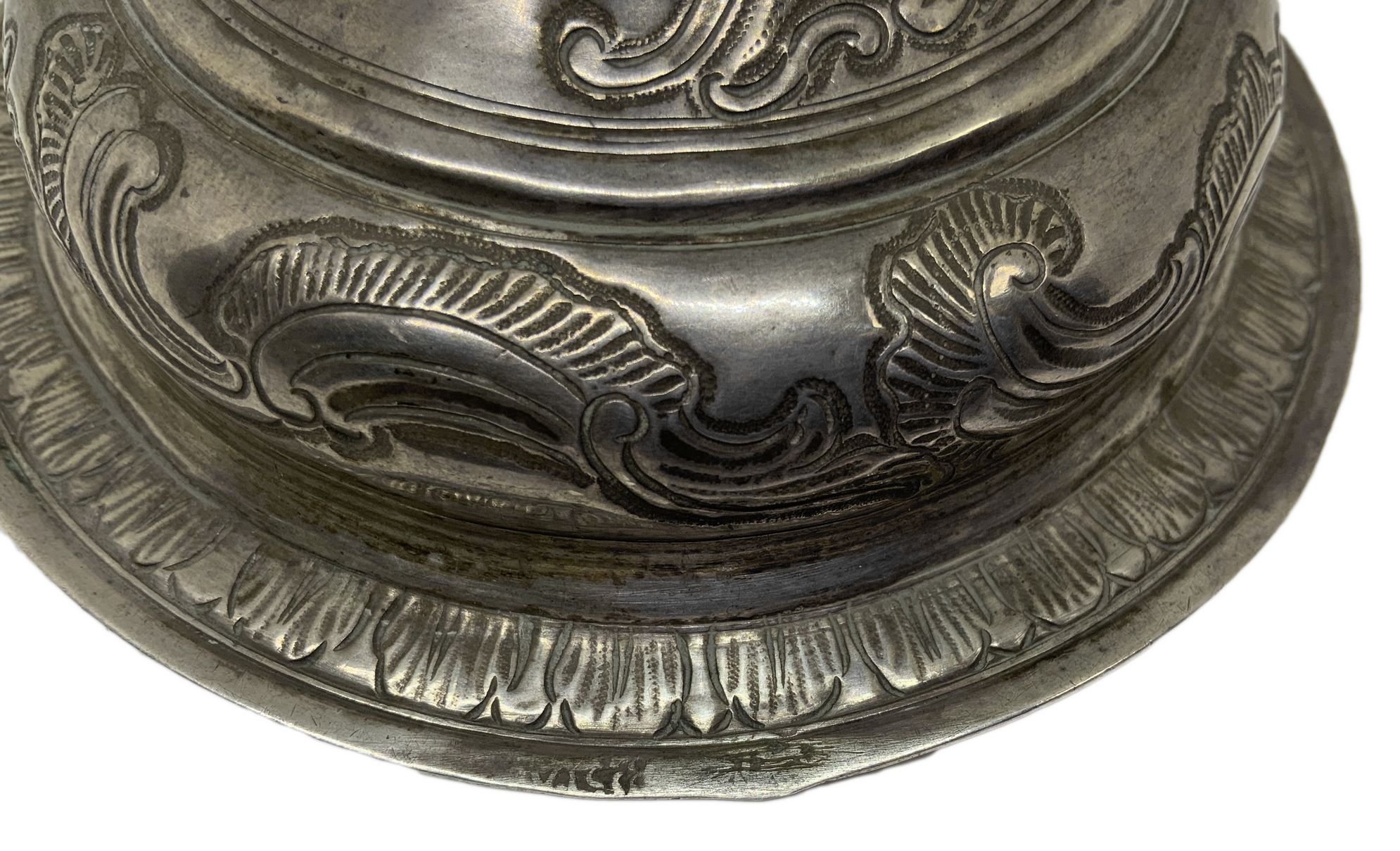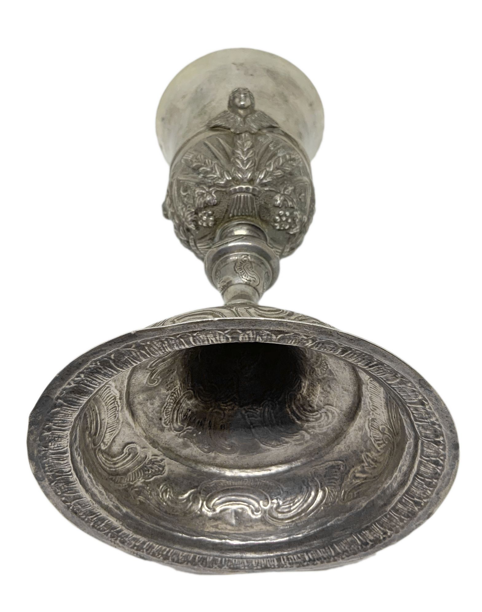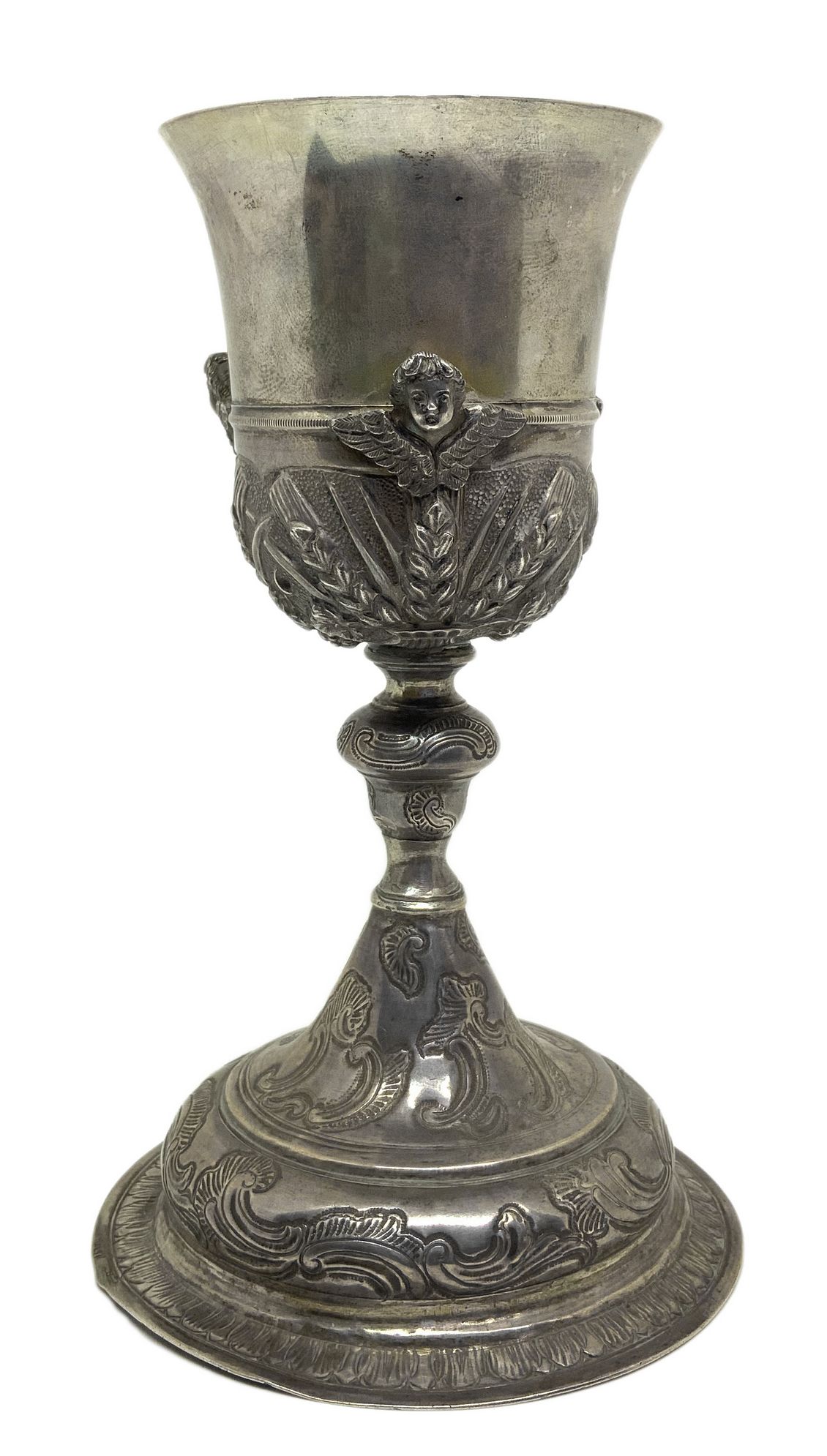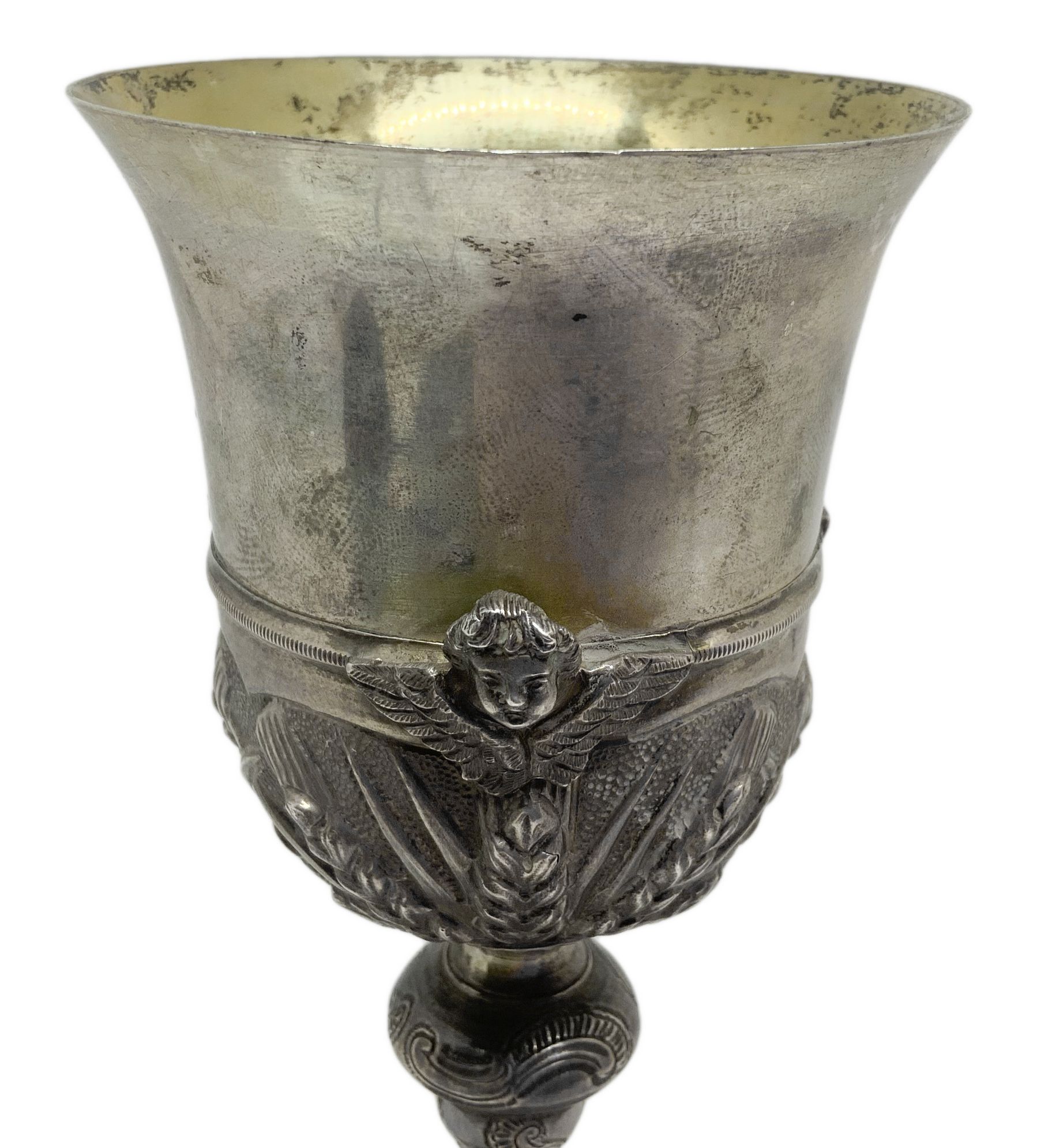 Calice in argento cesellato e sbalzato con cherubini. Punzone alla base e saggio del Console. XVIII secolo. H cm 19.